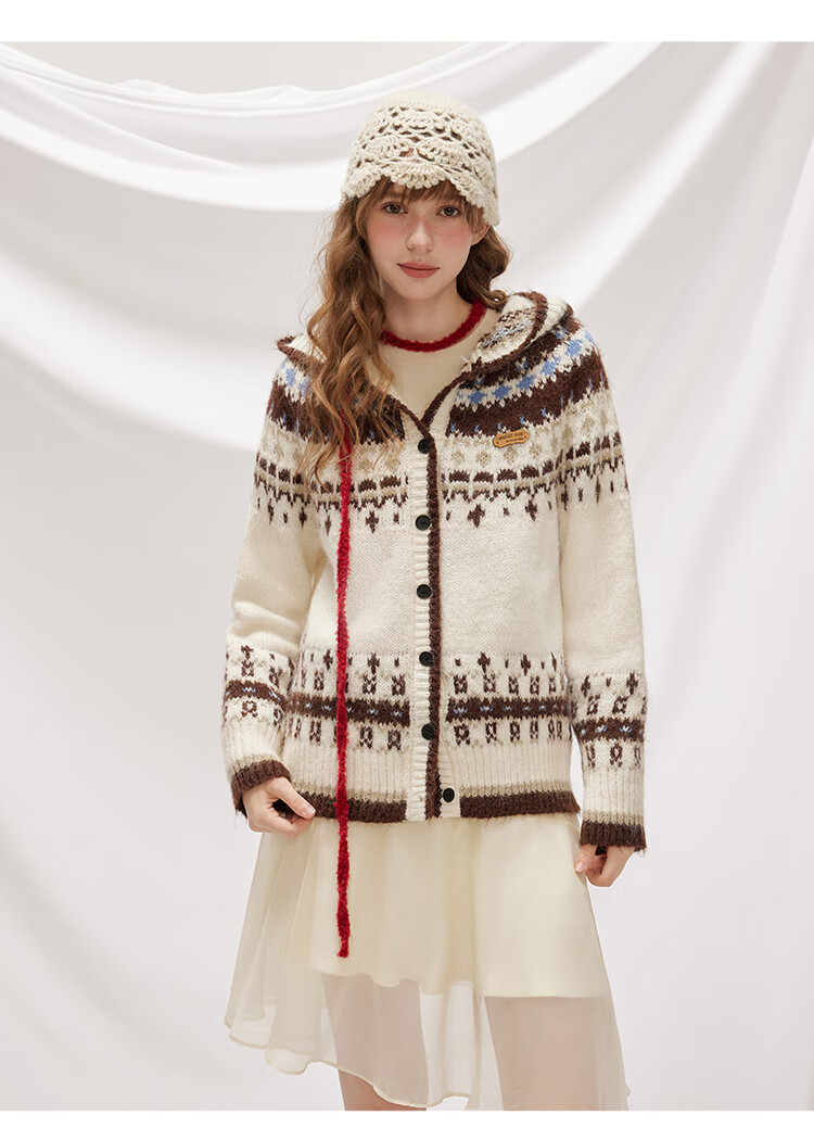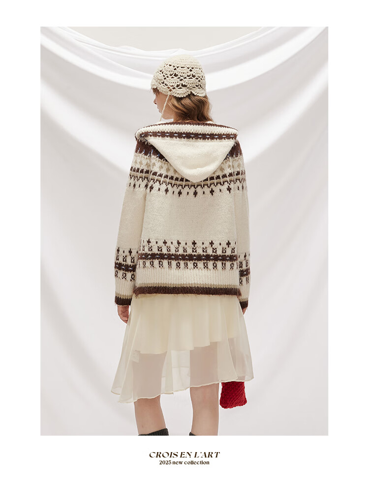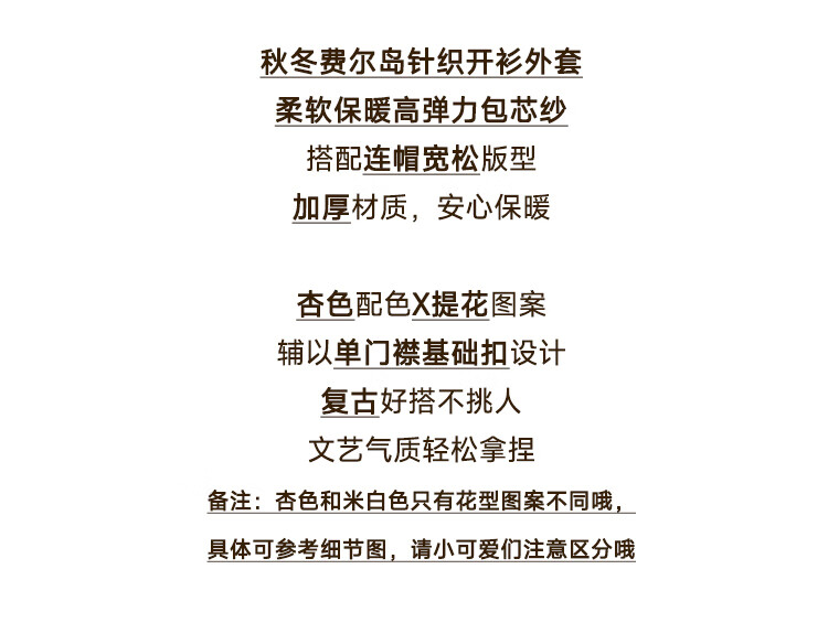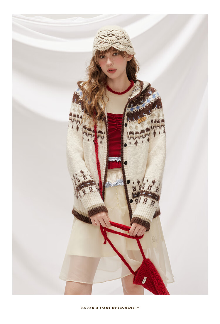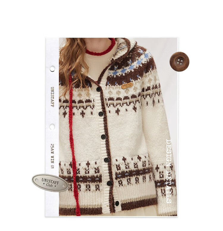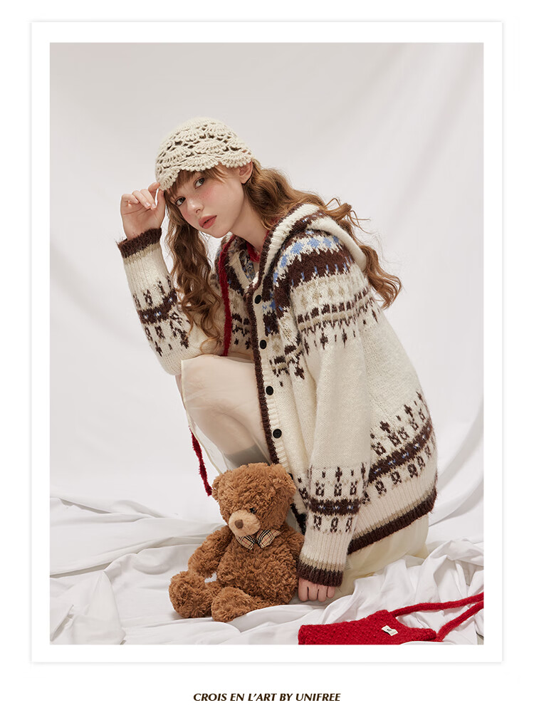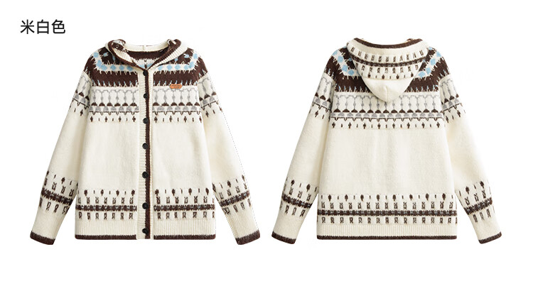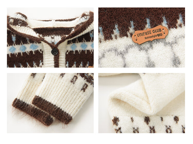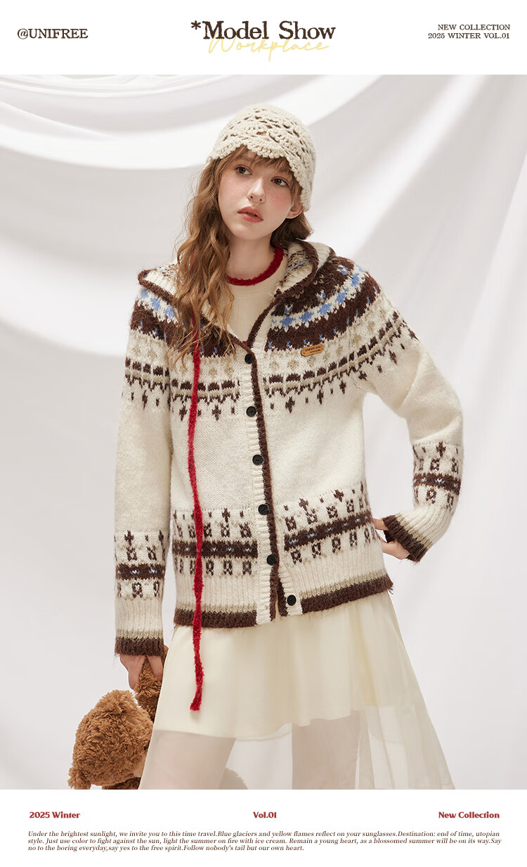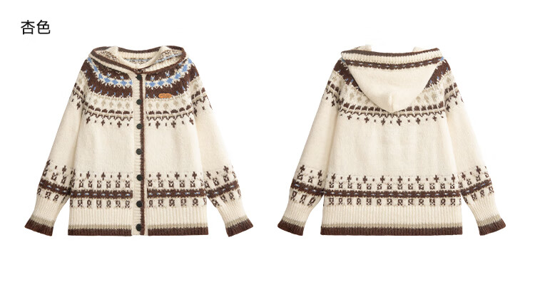 UNIFREE费尔岛毛针织衫女秋季新款柔软连帽宽松百搭修身开衫 杏色 均码