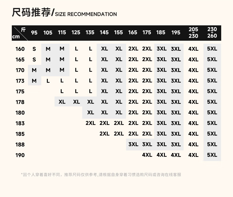 China (cm) 160-165/84-86 165-170 / 88-90 167-172 / 92-96 168-173 / 98-102 170-176 / 106-110