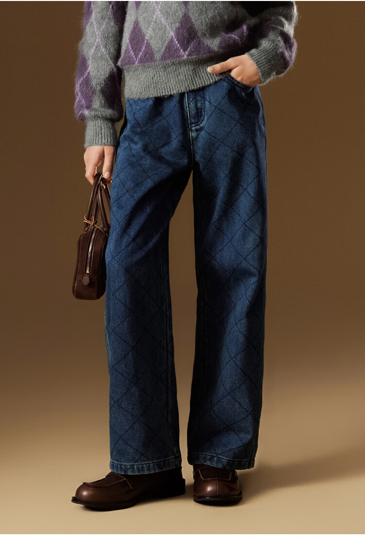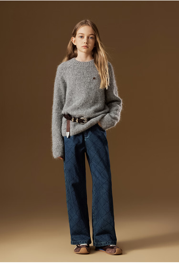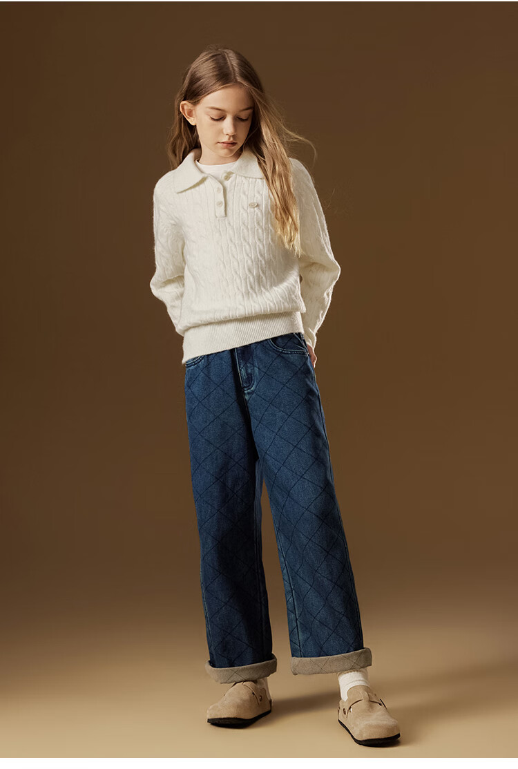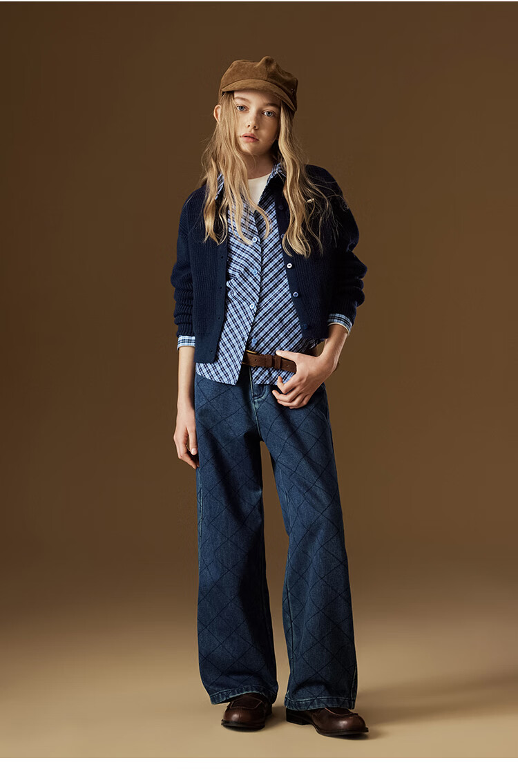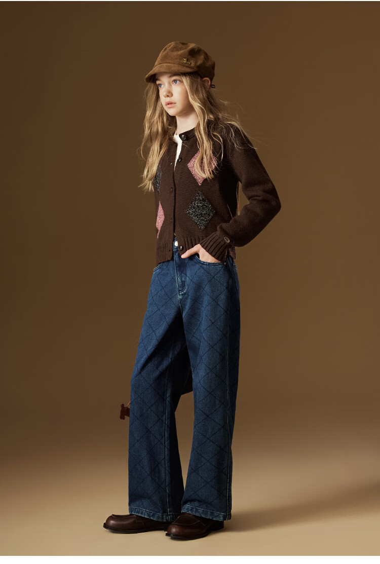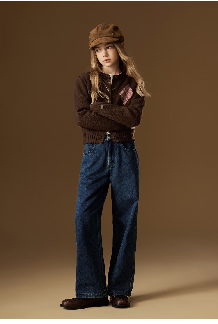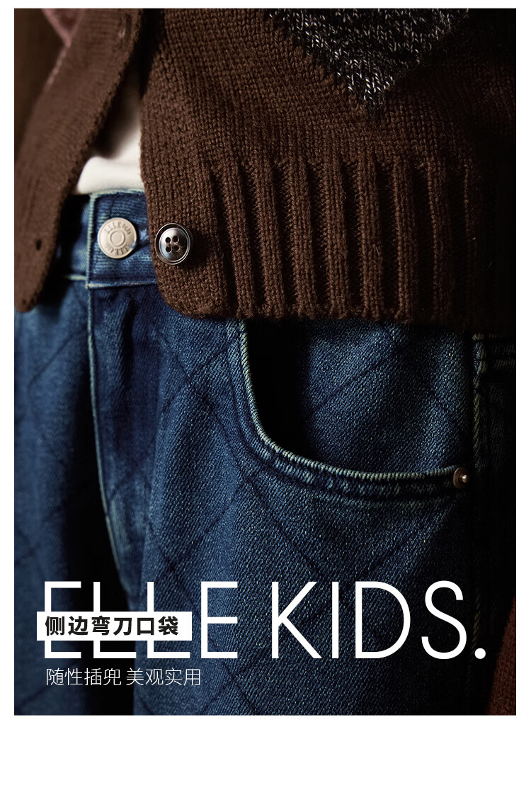 ELLE KIDS复古菱格抓绒直筒女童牛仔裤百搭秋季新款设计感休闲裤子