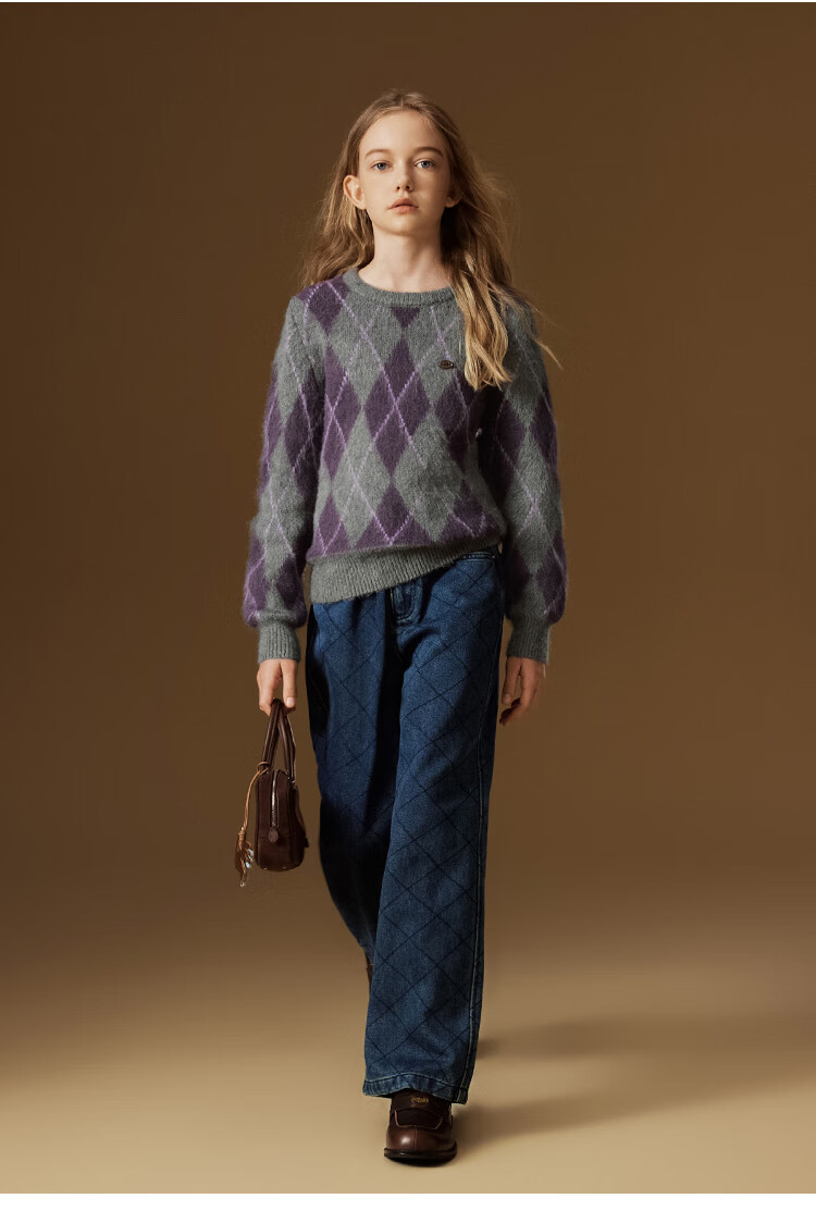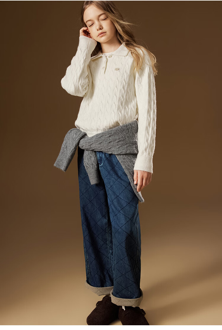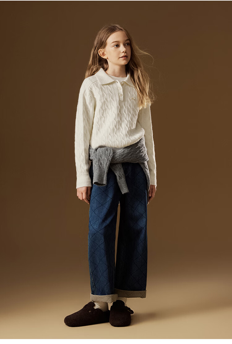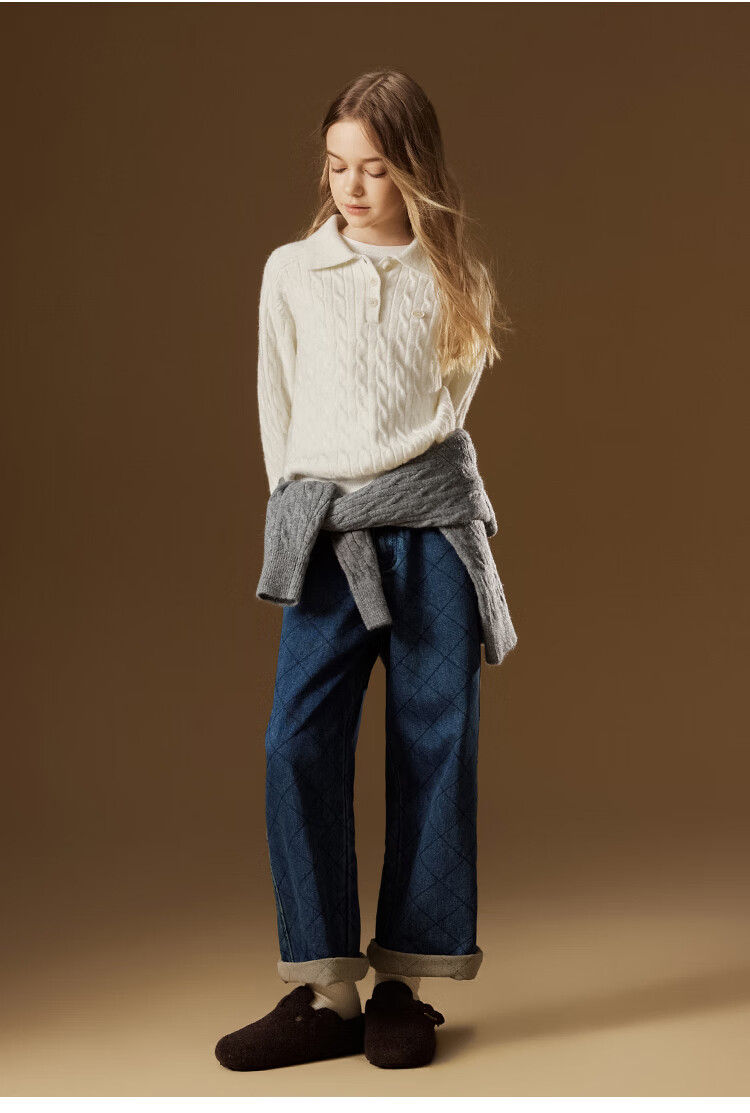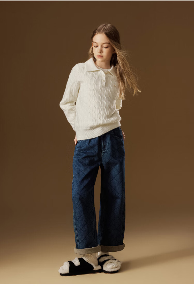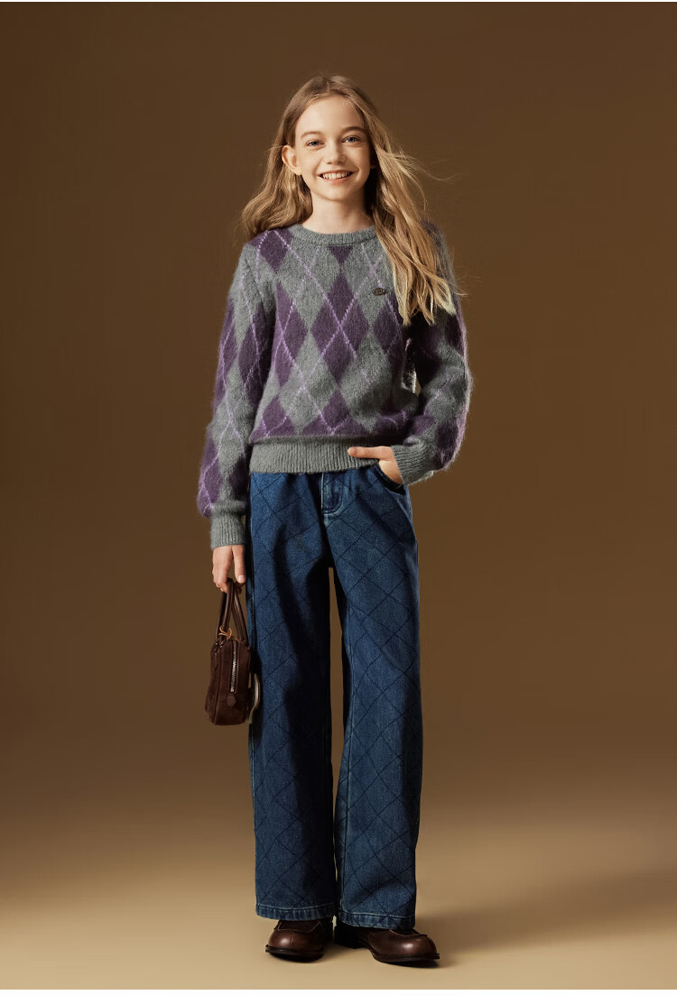 ELLE KIDS复古菱格抓绒直筒女童牛仔裤百搭秋季新款设计感休闲裤子