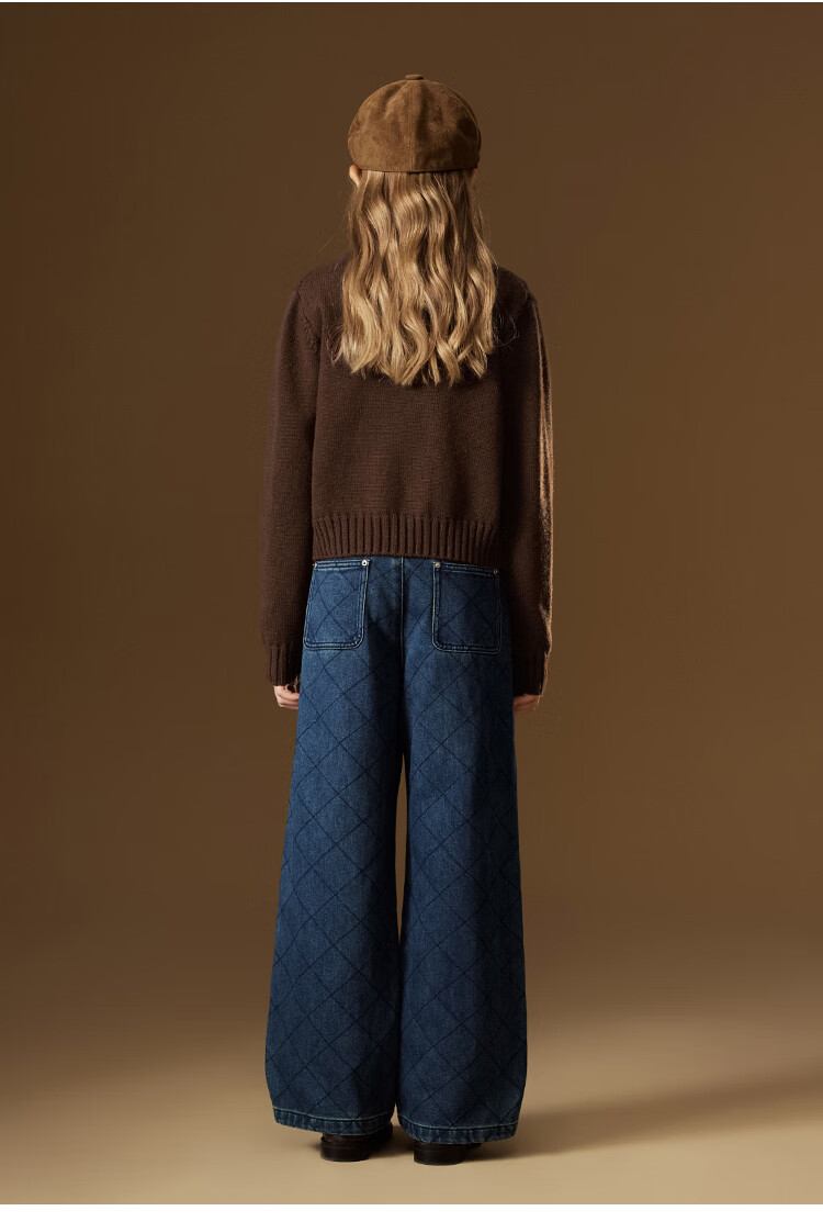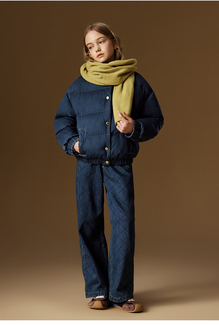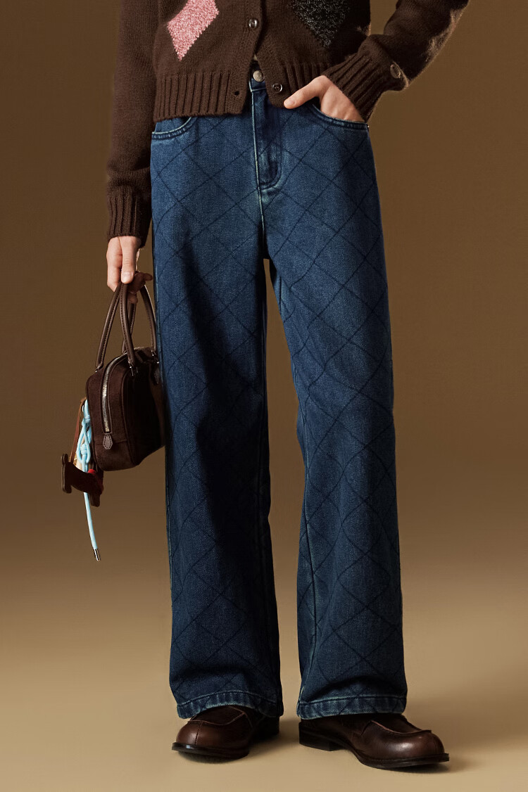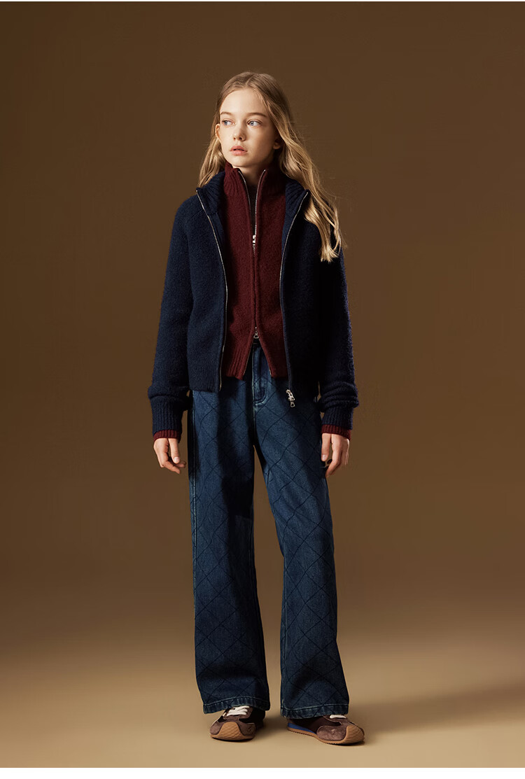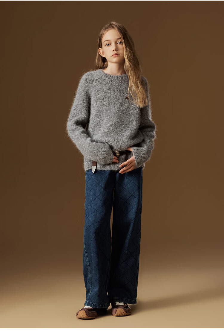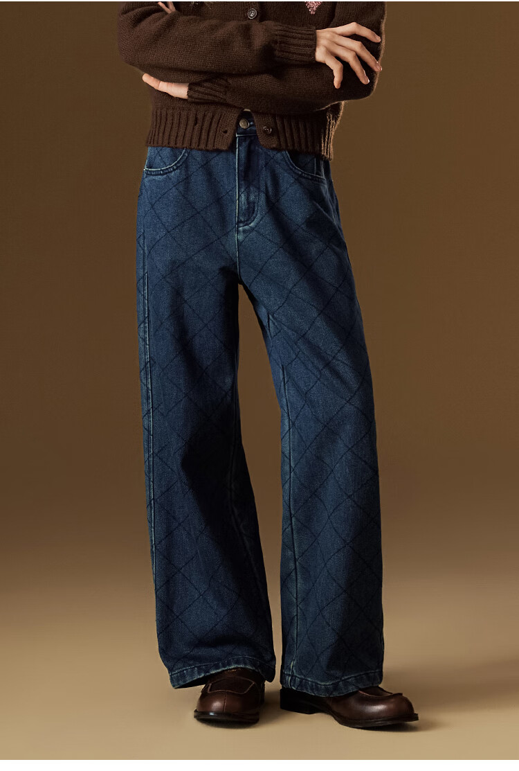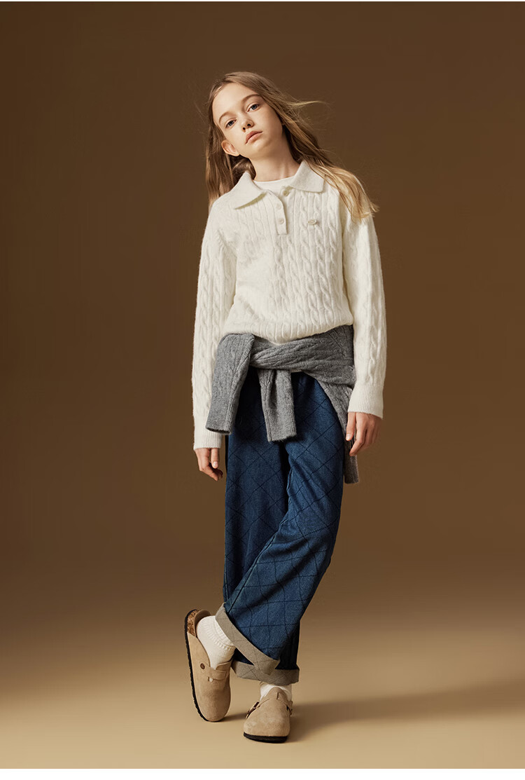ELLE KIDS复古菱格抓绒直筒女童牛仔裤百搭秋季新款设计感休闲裤子