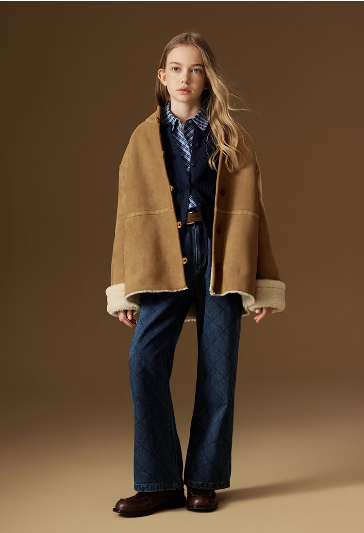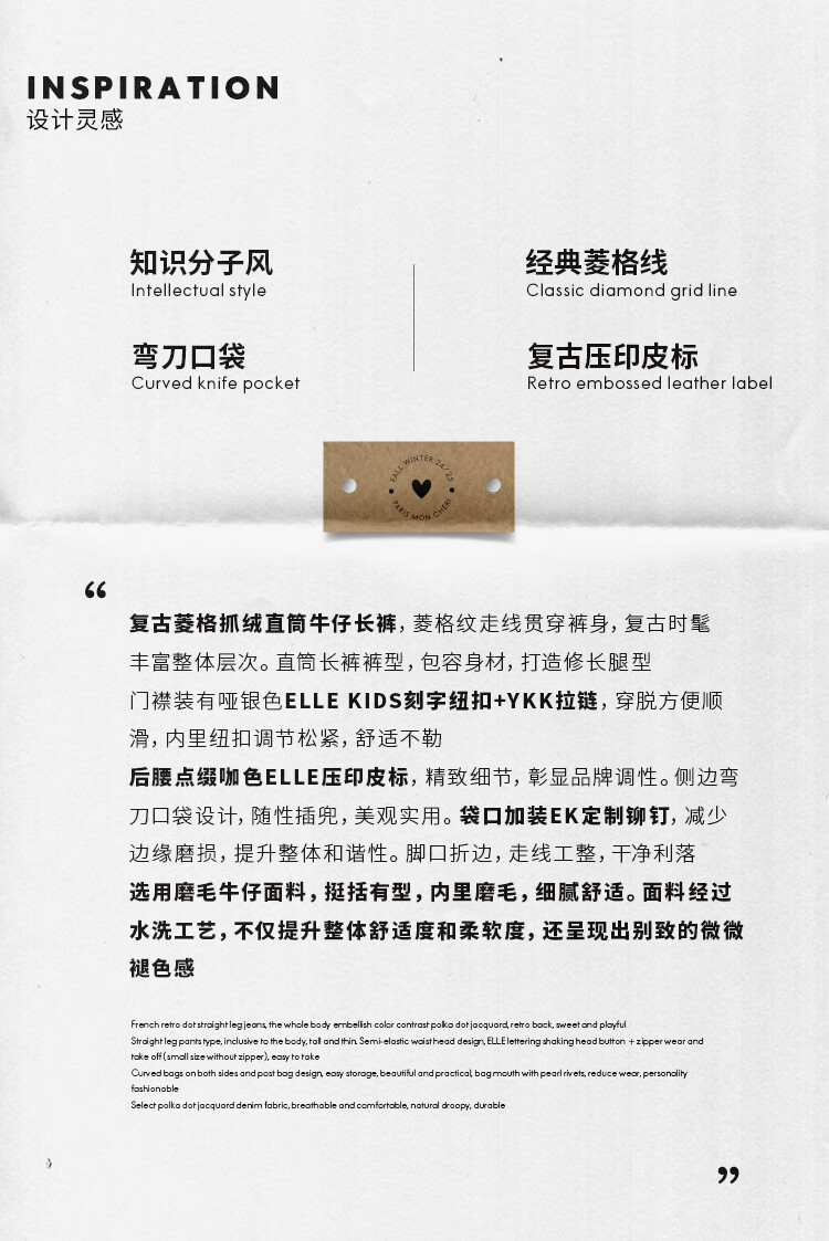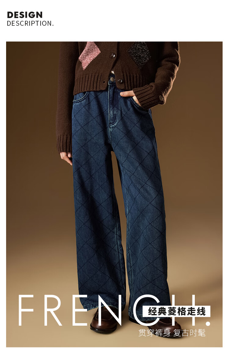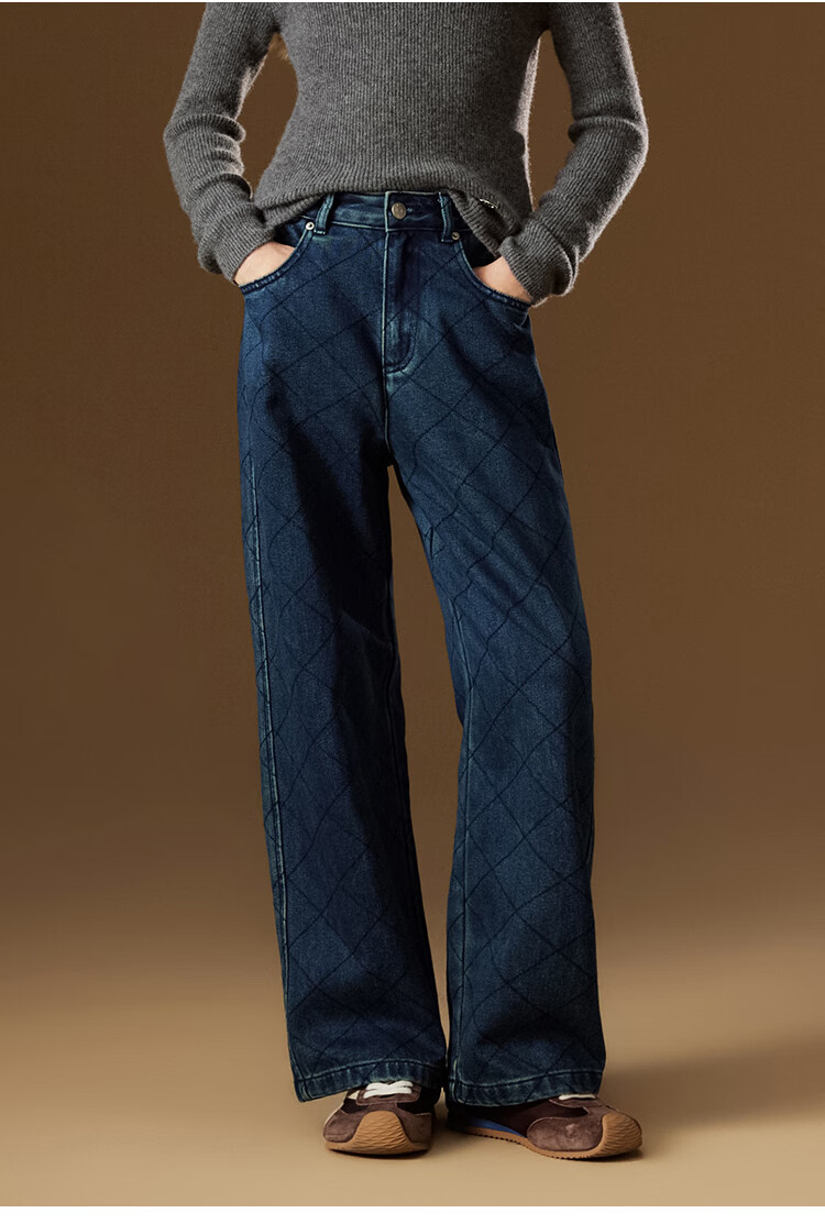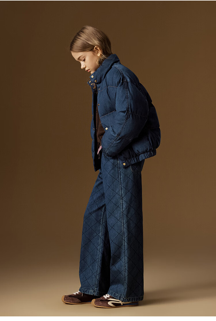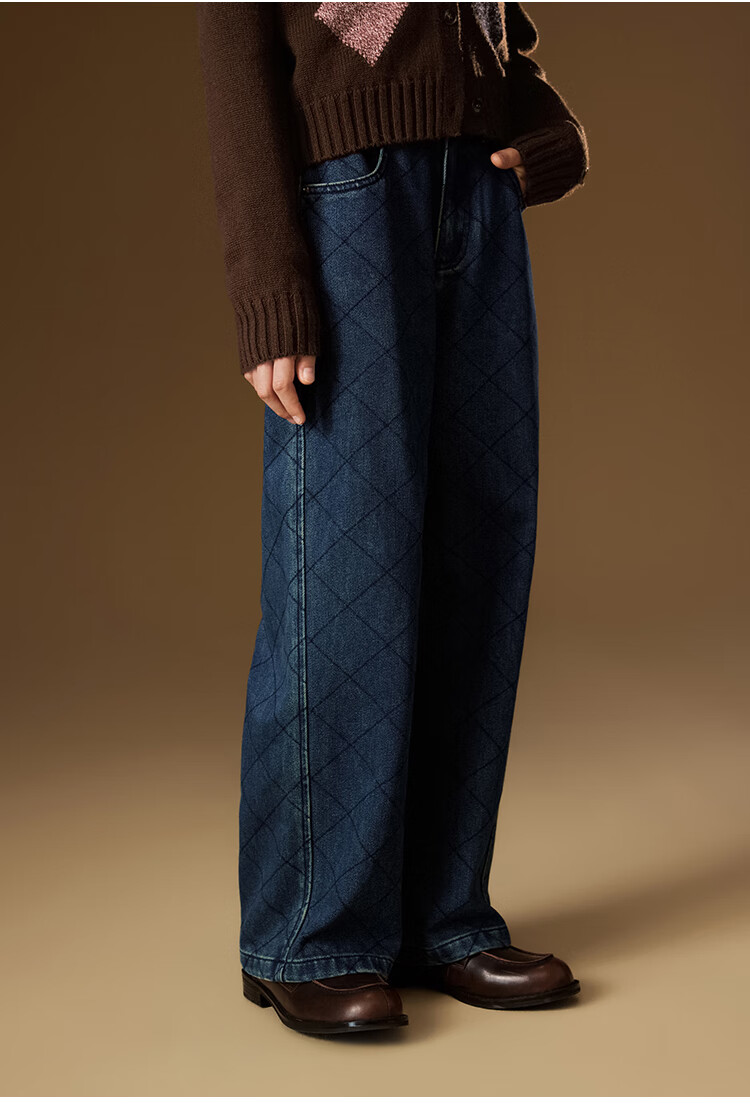 ELLE KIDS复古菱格抓绒直筒女童牛仔裤百搭秋季新款设计感休闲裤子