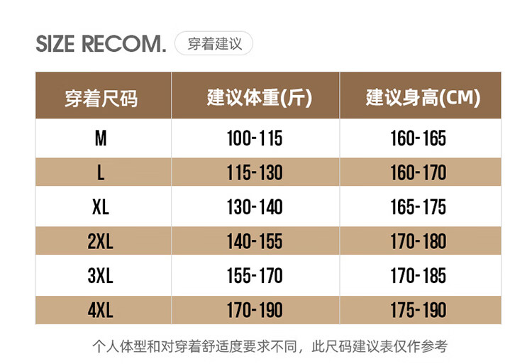 China (cm) 165 / 88-90 170 / 96-98 175 / 108-110 180 / 118-122 185 / 126-130