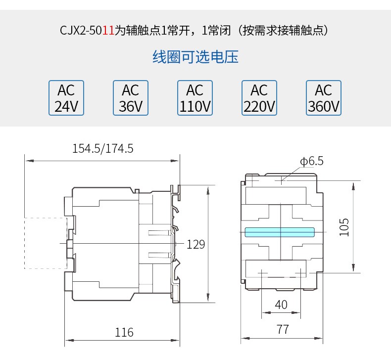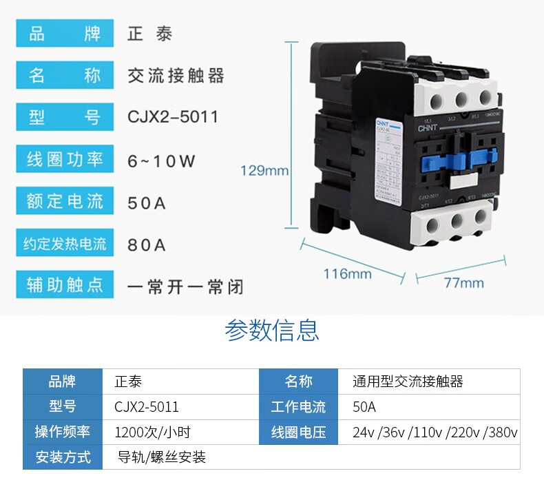 正泰(CHNT) 正泰接触器CJX2-5011交流接触器 220V/380v可选 50A接触式继电器 220V