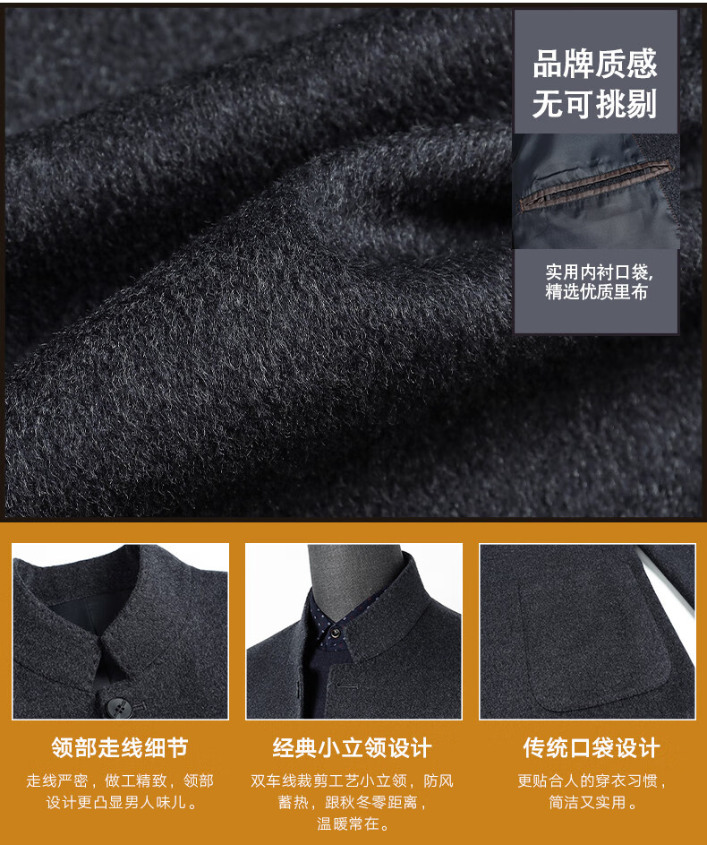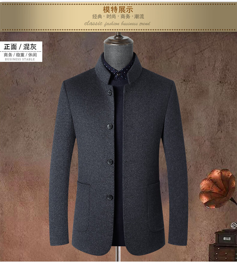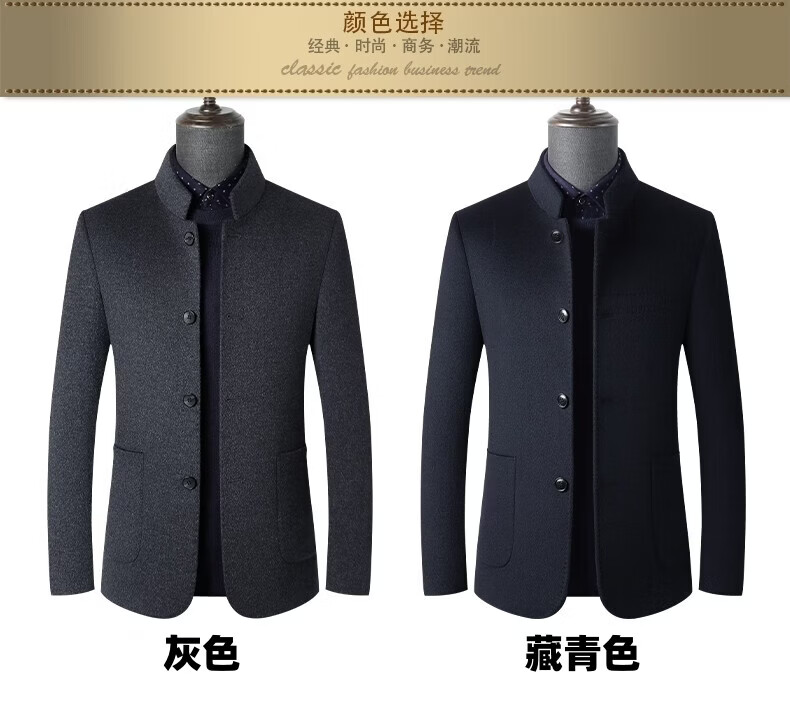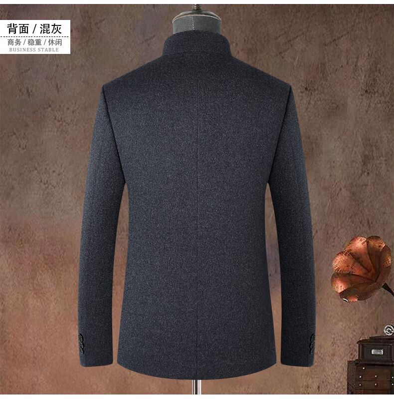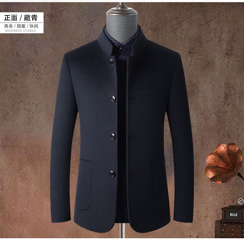 Fazeya恒源祥集团桑蚕丝中山装立领西服男羊毛呢外套修身商务休闲爸爸装 黑色(三颗扣) XL (180) (建议140-160斤)