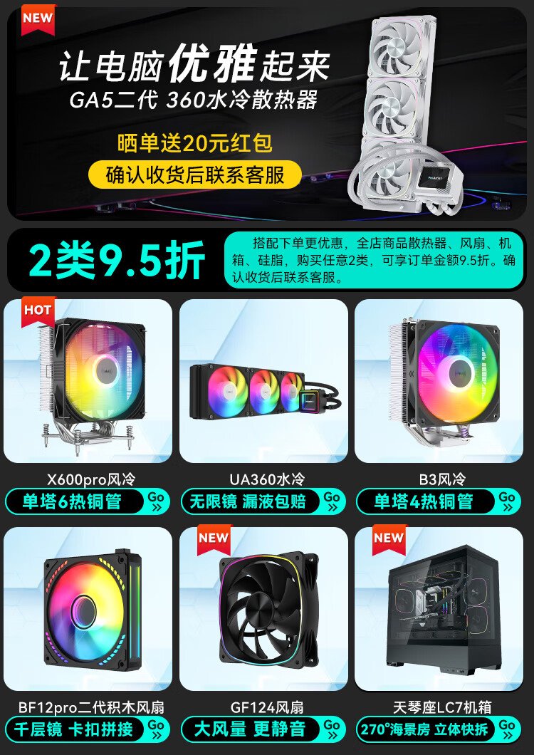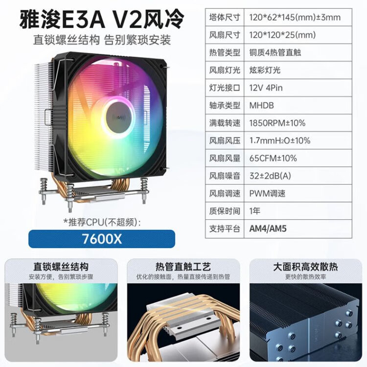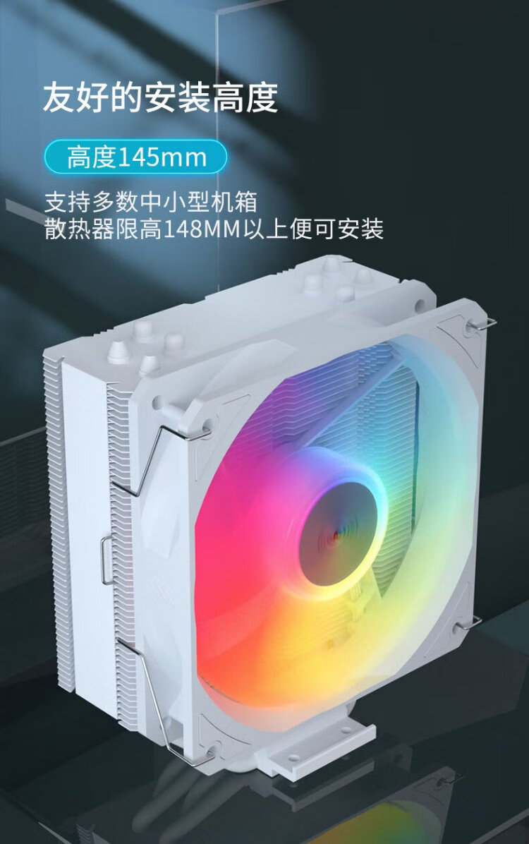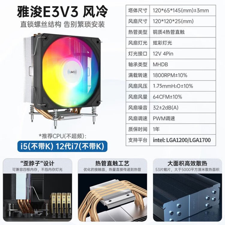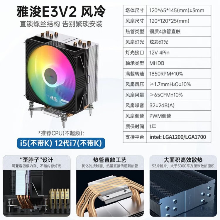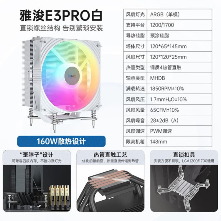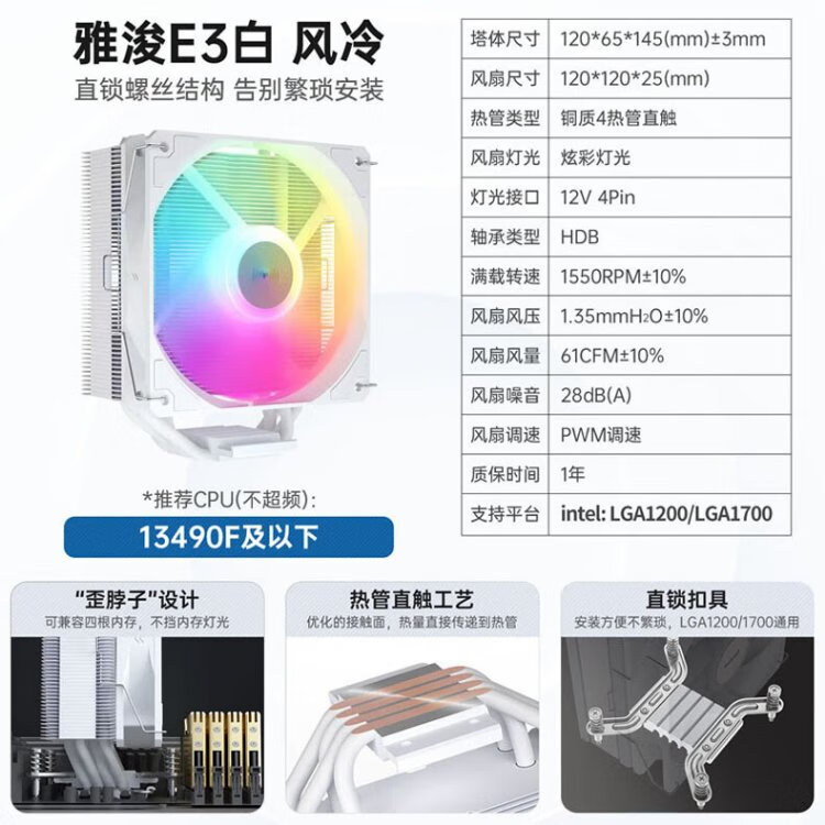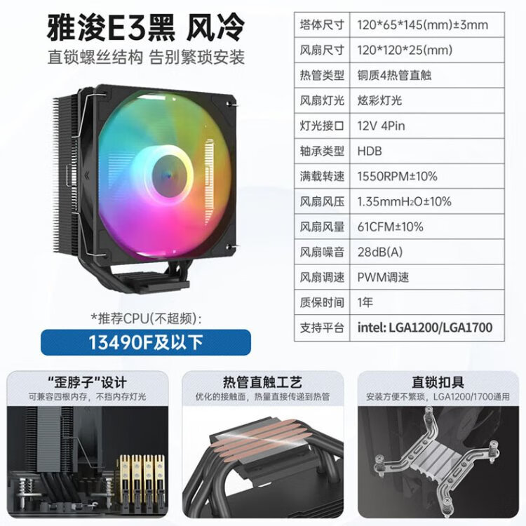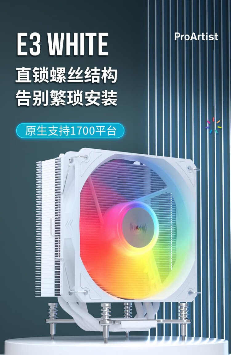 雅浚(ProArtist)E3V3风冷散热器 E3A黑/白炫彩四热管台式电脑CPU ARGB风扇支持intel1200/1700 /AMD 硅脂预涂 E3V3/intel专用