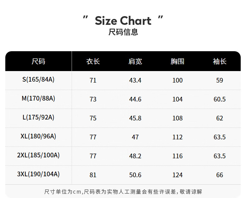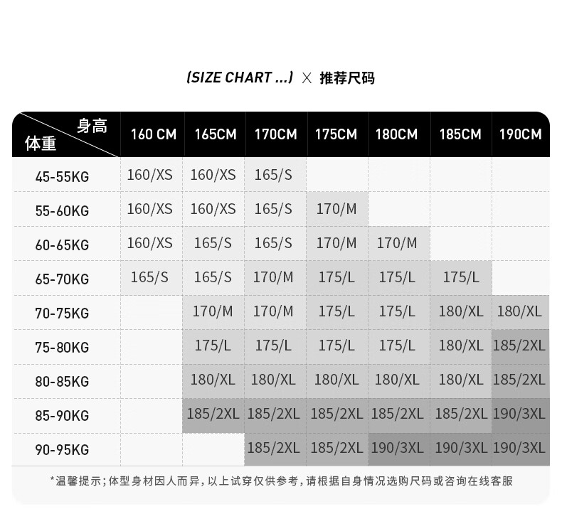 China (cm) 165 / 88-90 170 / 96-98 175 / 108-110 180 / 118-122 185 / 126-130