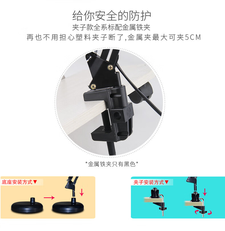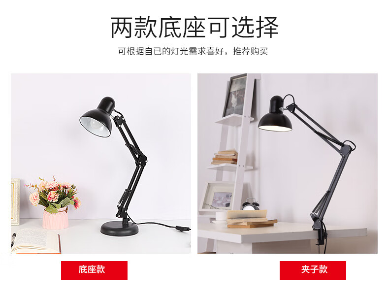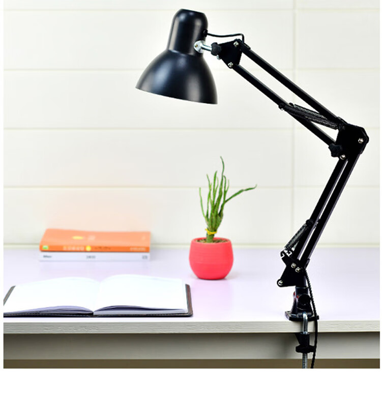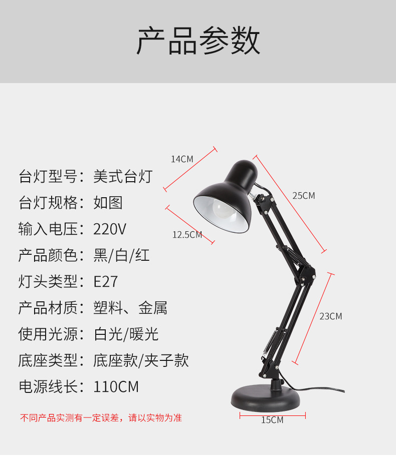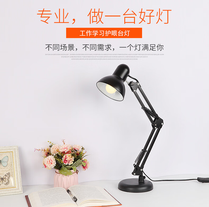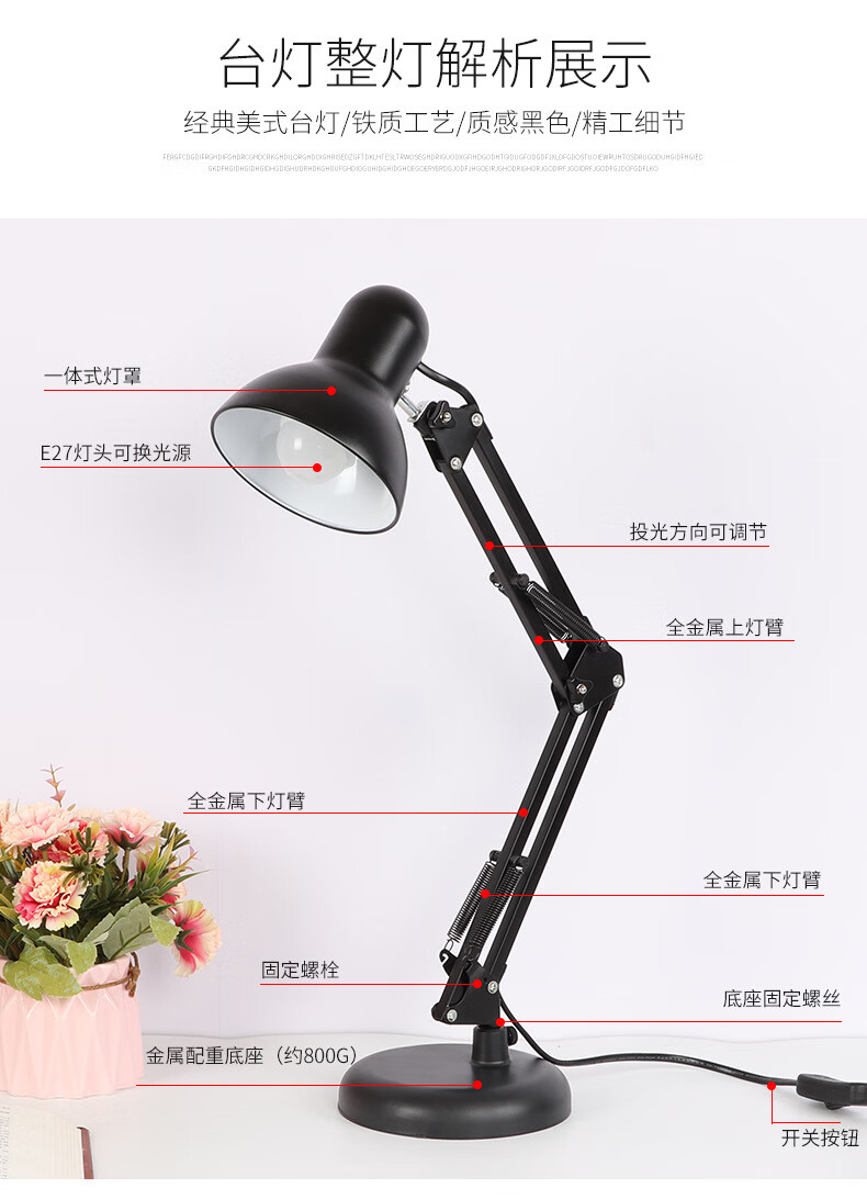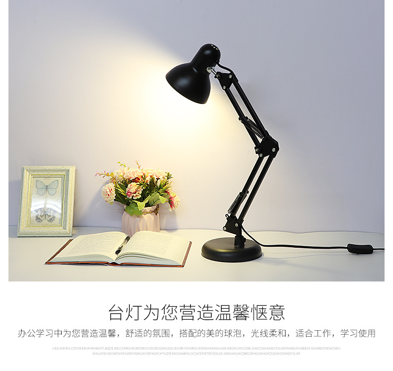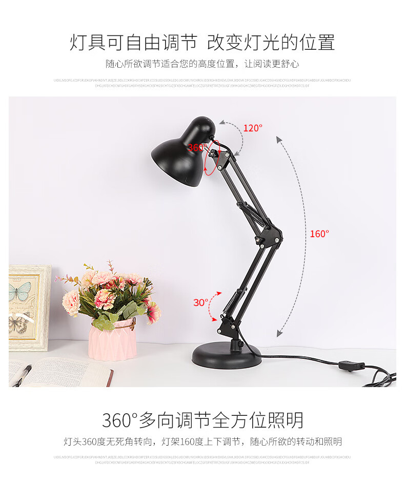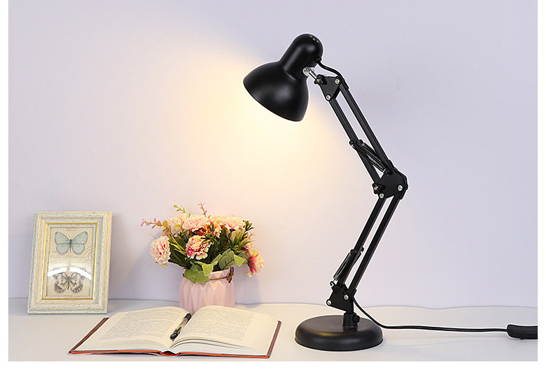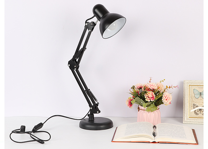 American metal folding table lamp, college student work and study dormitory bedside iron table lamp, replaceable light bulb, black base, button switch