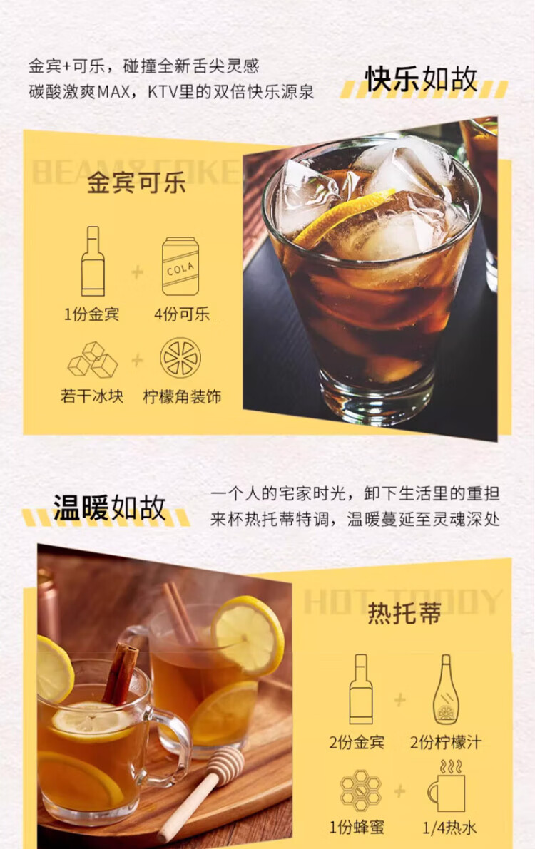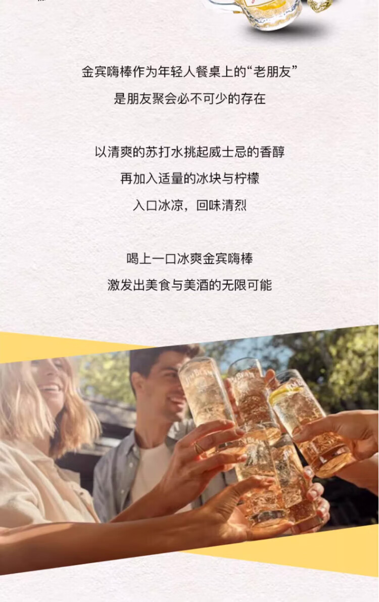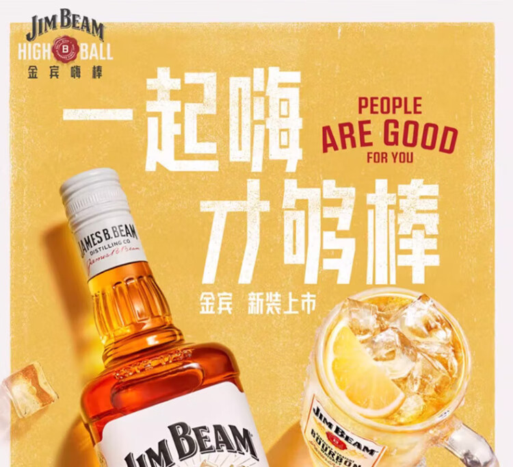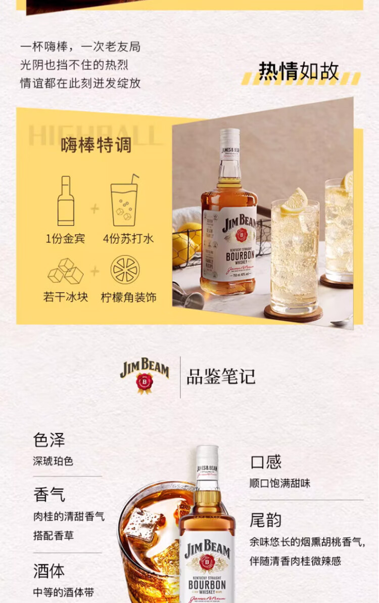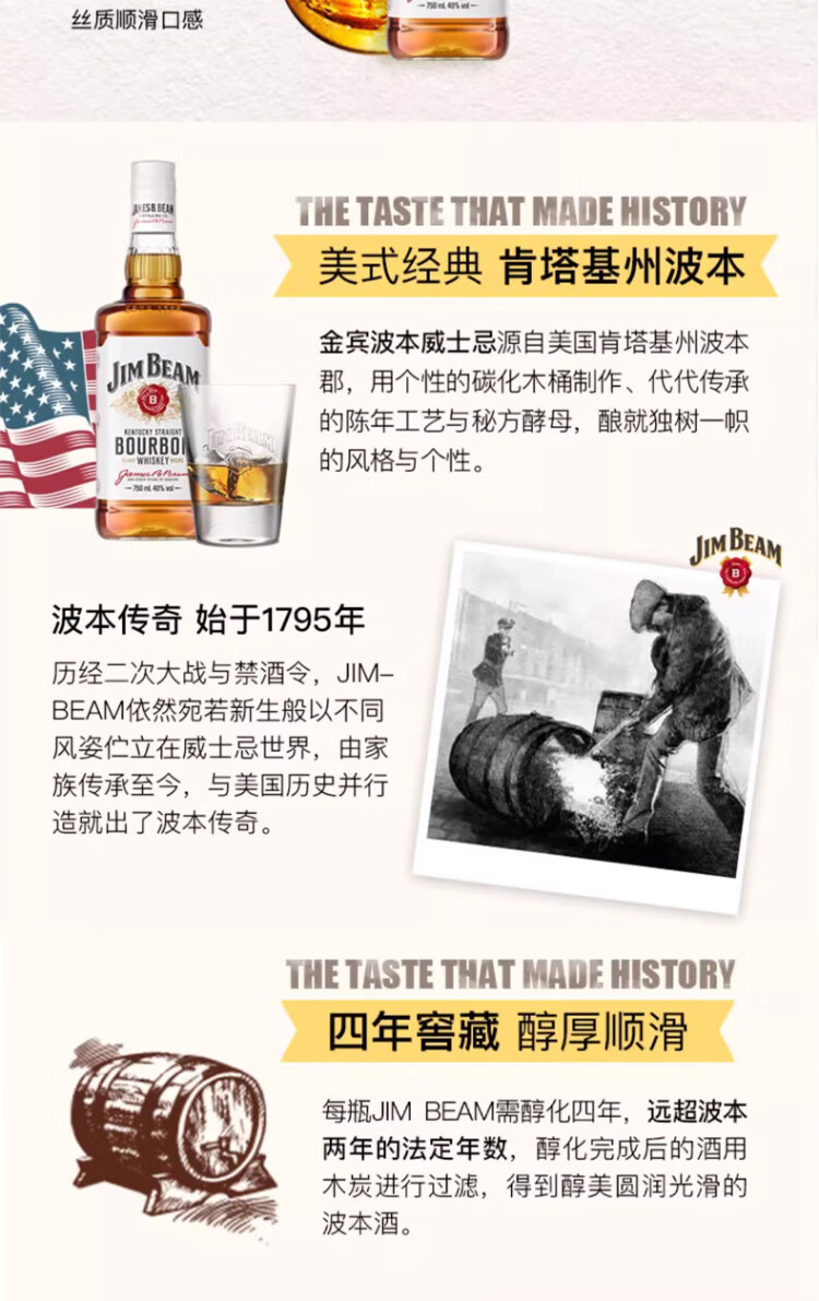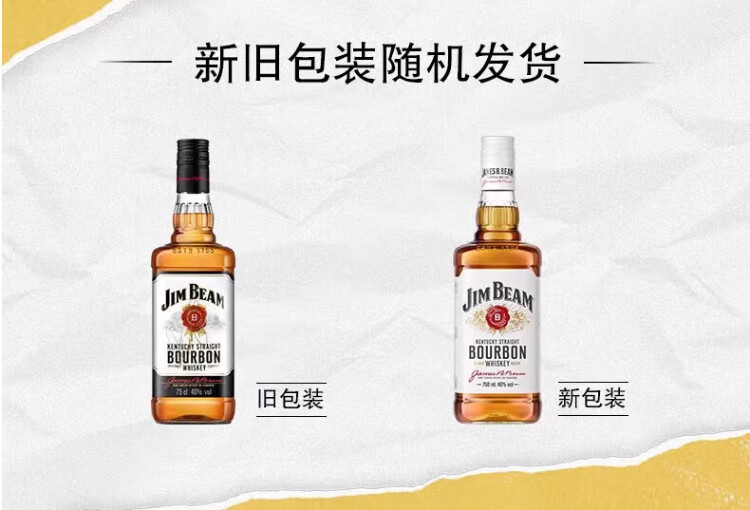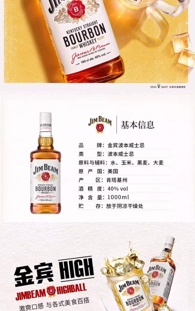 金宾(Jim Beam)洋酒 白占边 美国肯塔基州 波本 调和威士忌 原瓶进口 金宾波本威士忌 1000mL 1瓶 -裸瓶