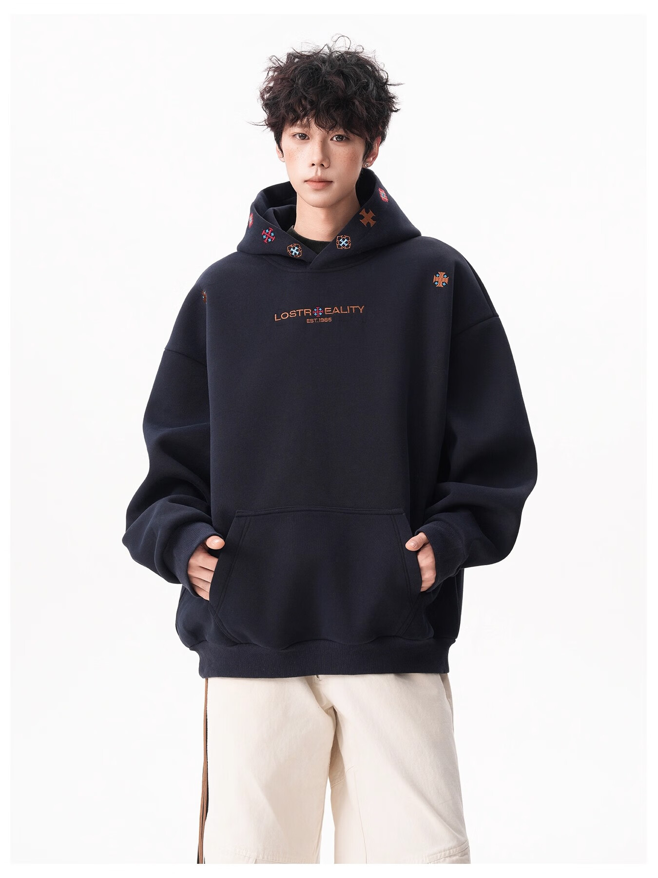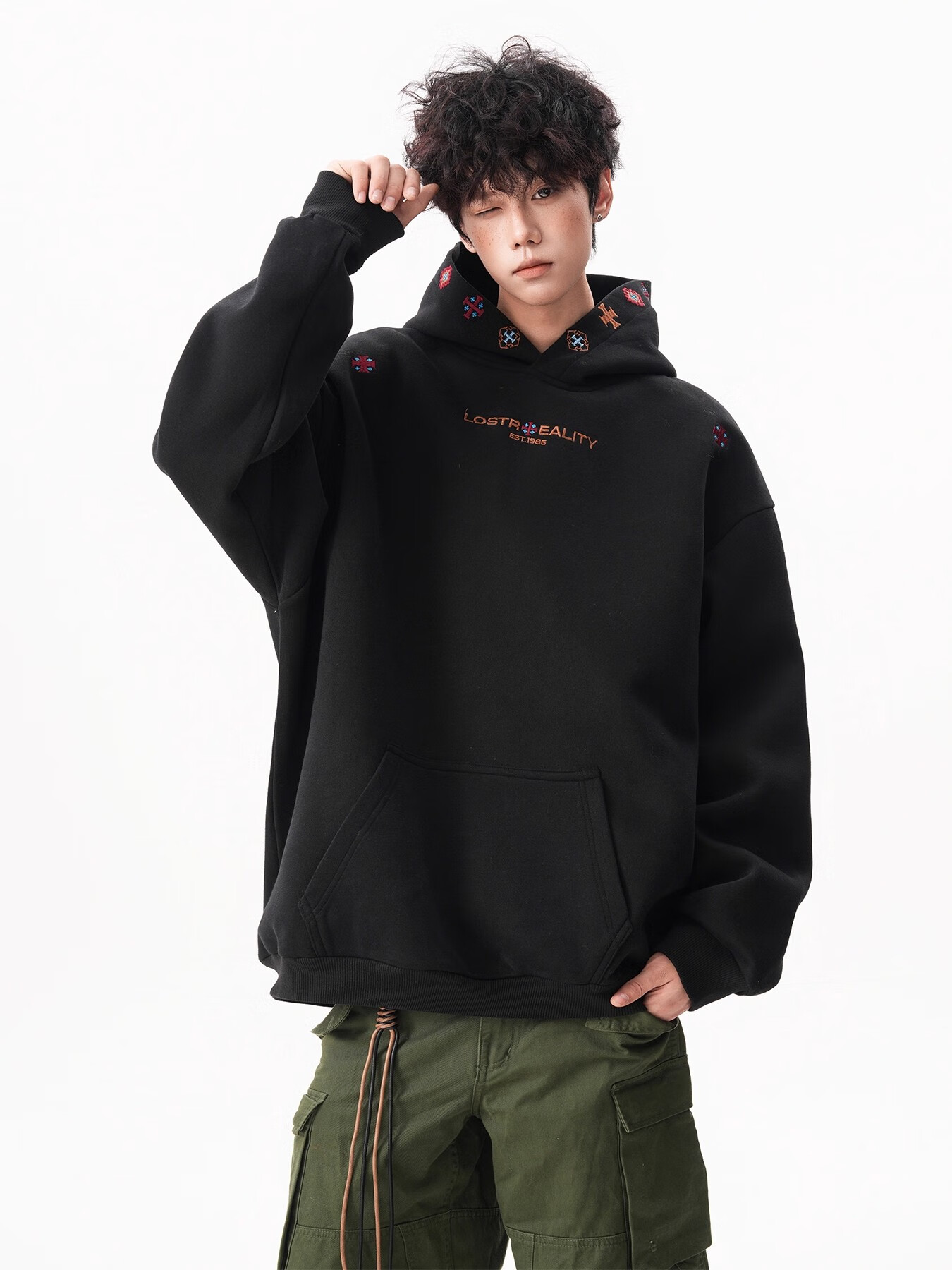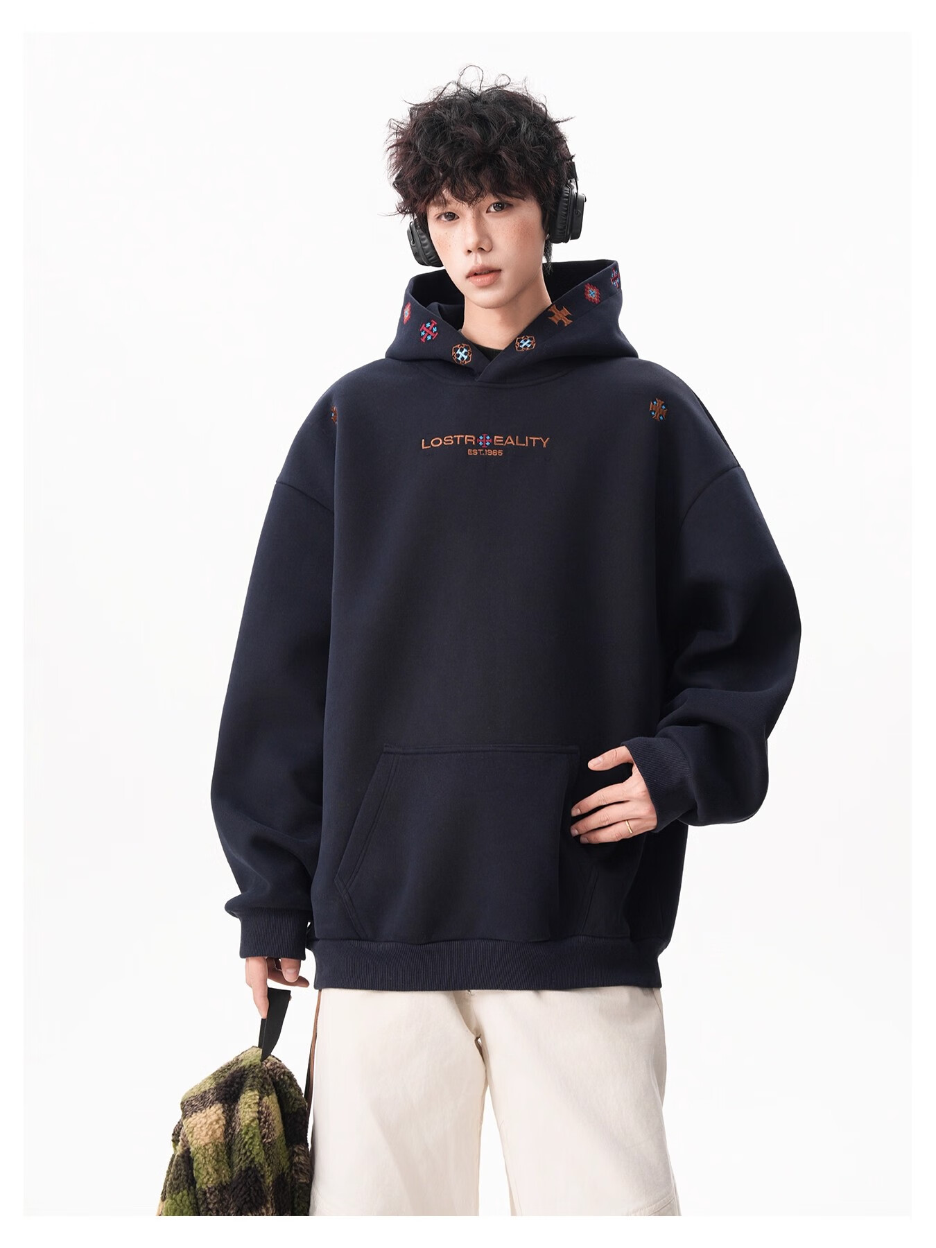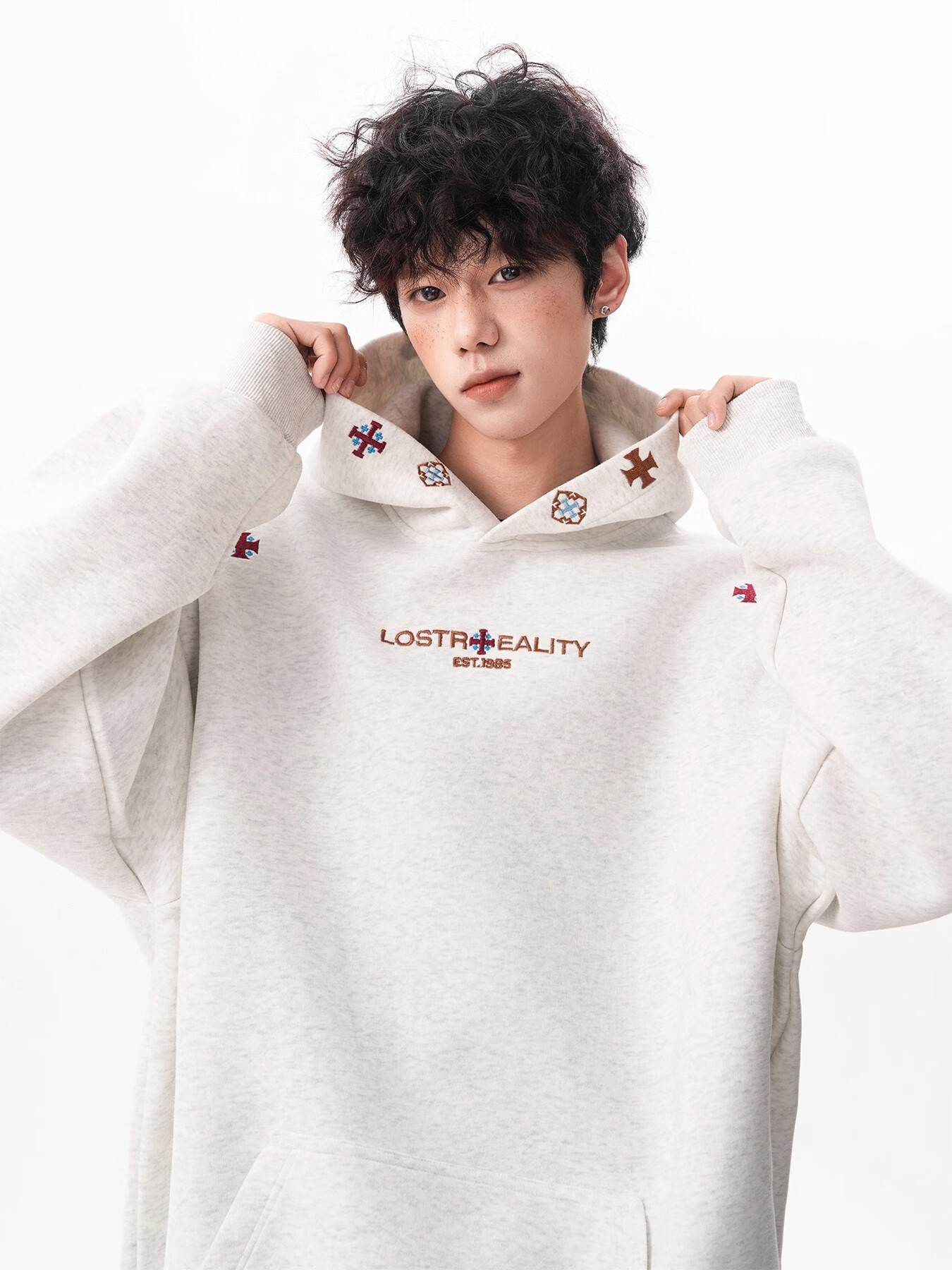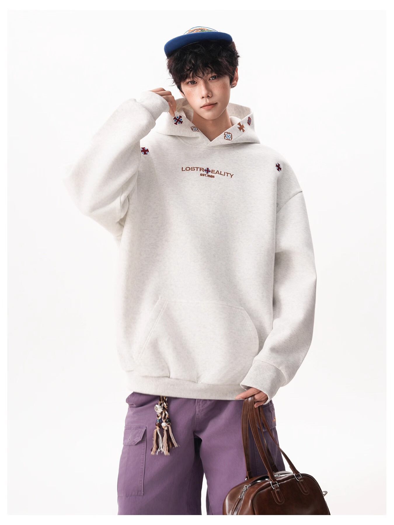 OEMG 重磅500g刺绣连帽加绒加厚卫衣男士秋冬季潮牌美式宽松保暖外套 白花灰 【高品质】 XL [建议110-130斤]