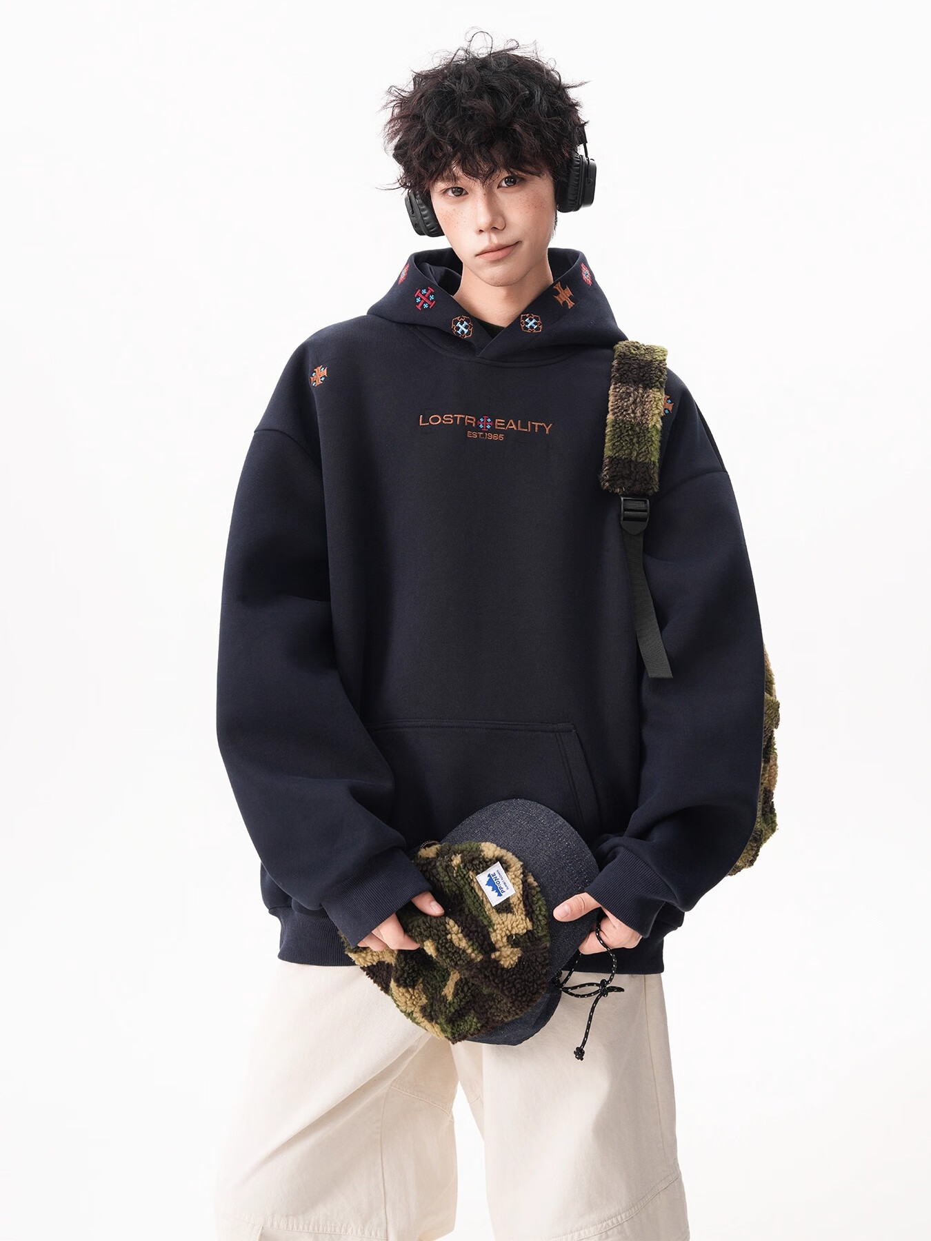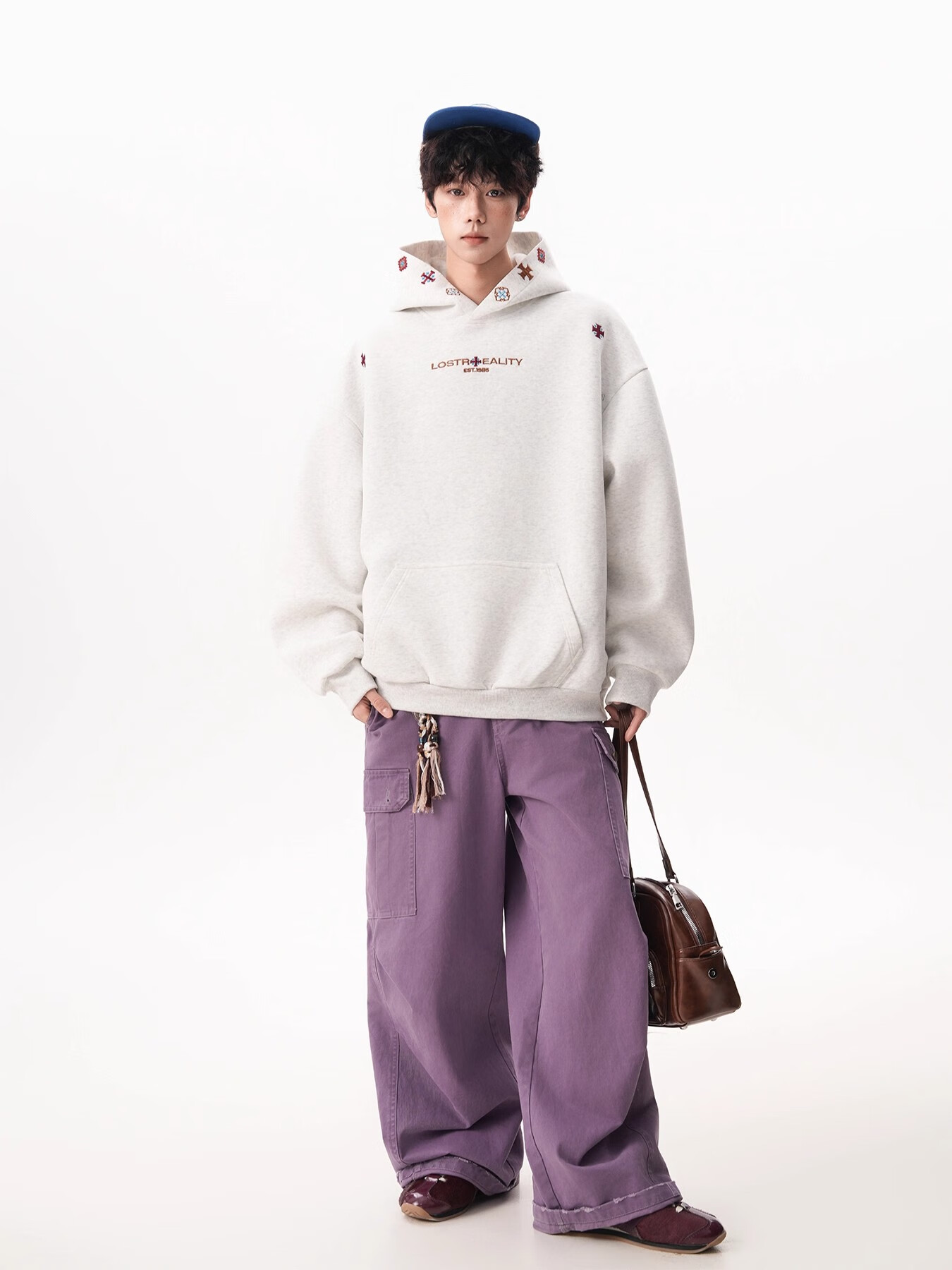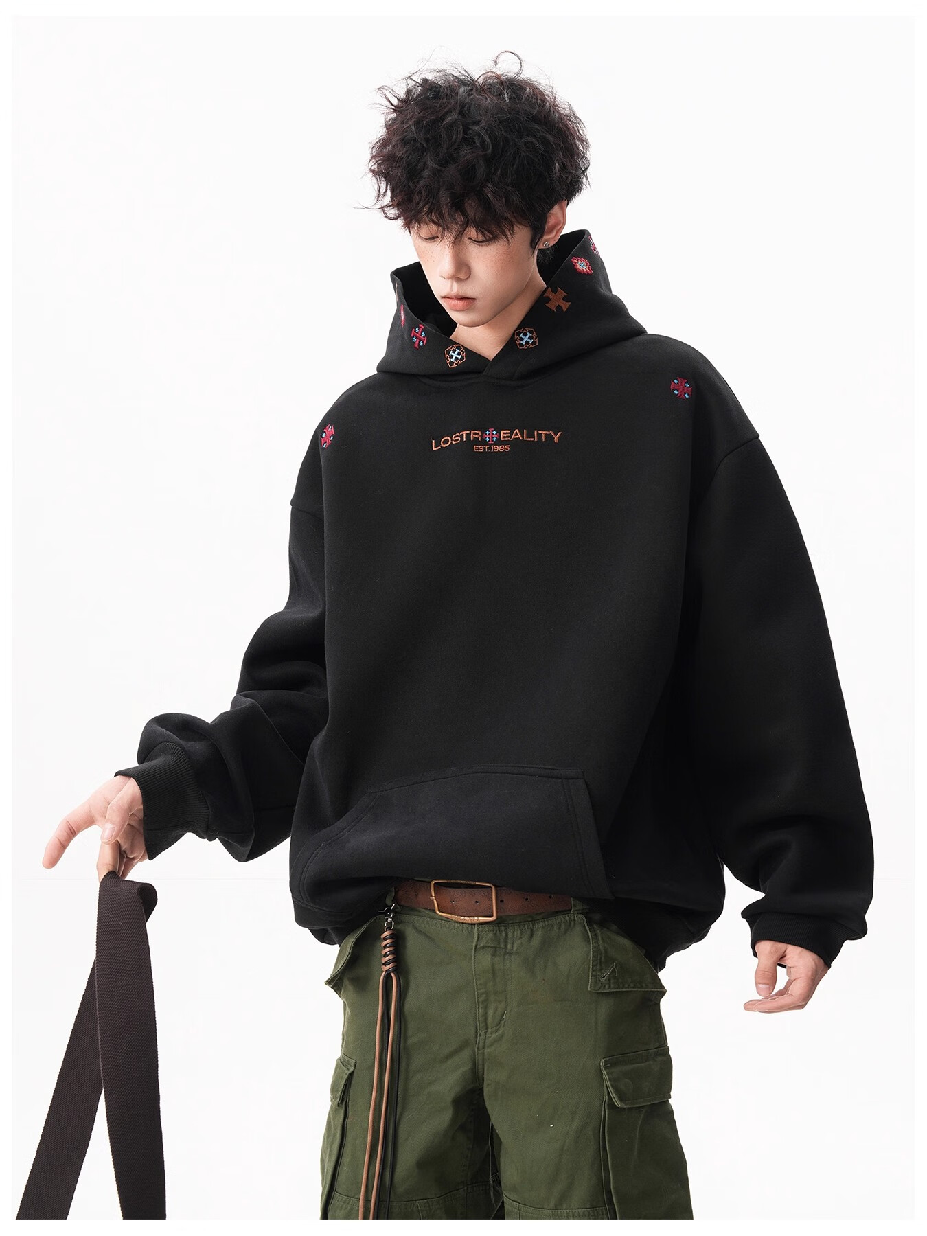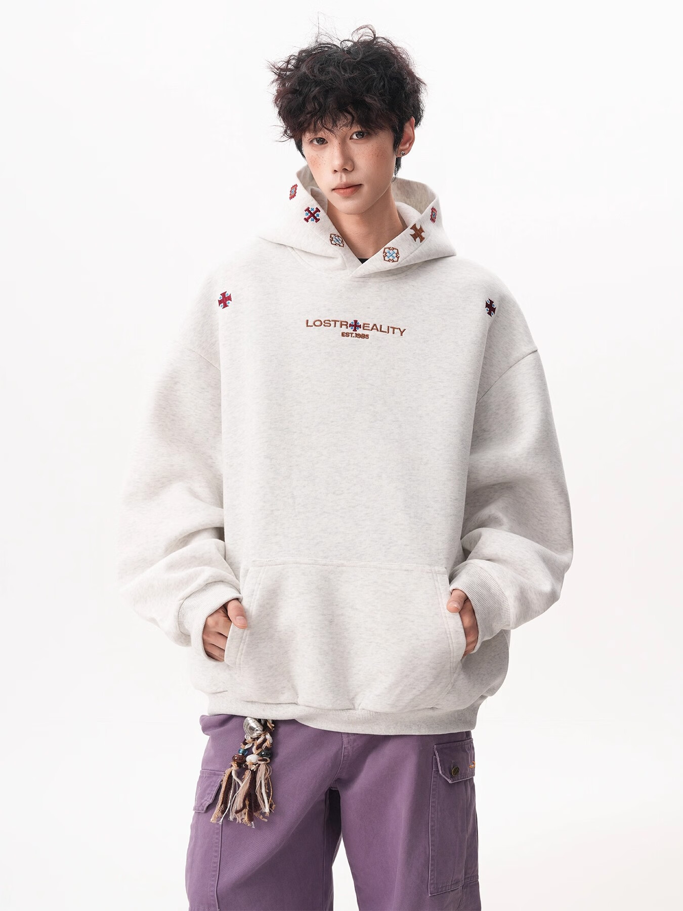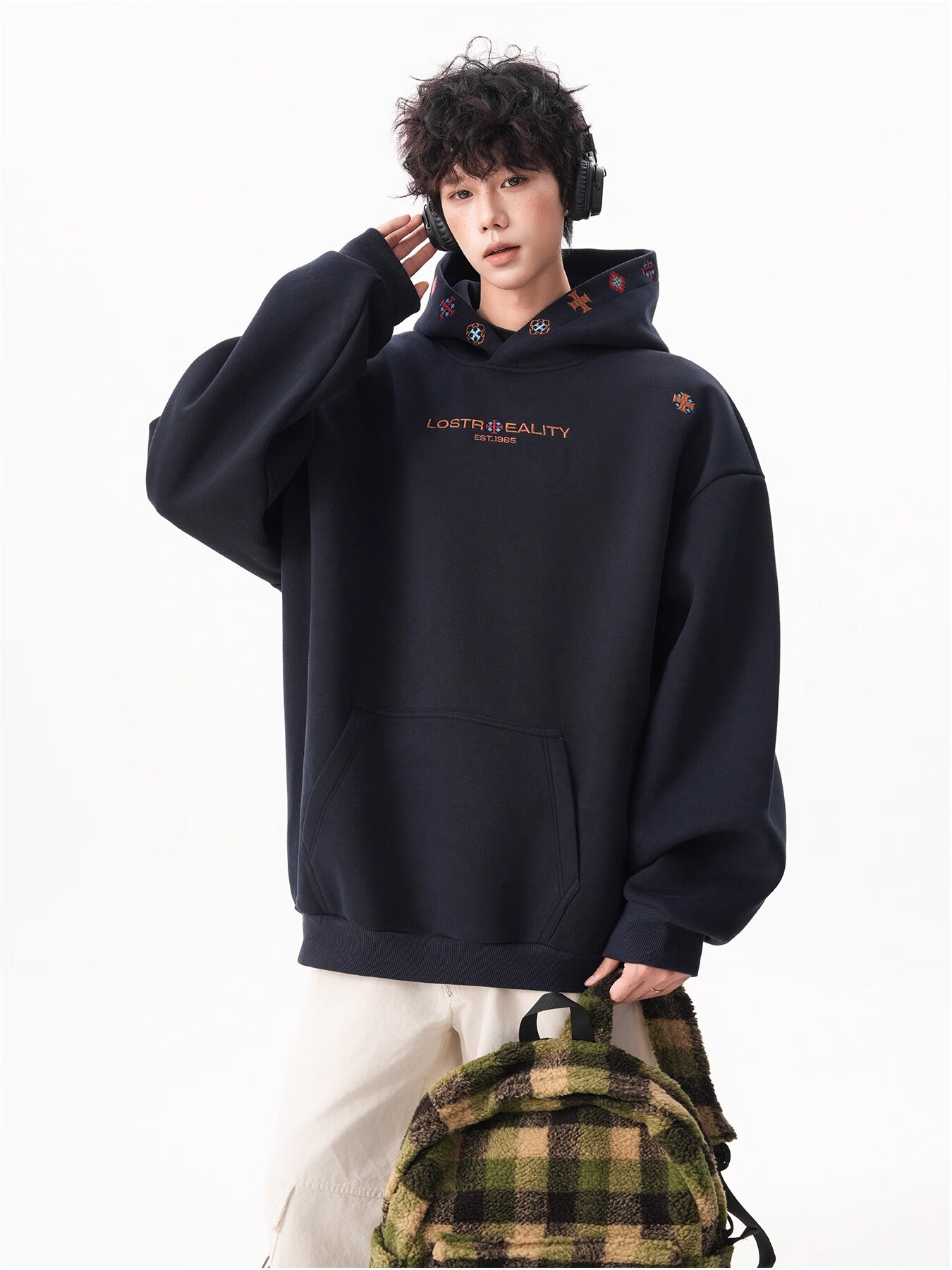 OEMG 重磅500g刺绣连帽加绒加厚卫衣男士秋冬季潮牌美式宽松保暖外套 白花灰 【高品质】 XL [建议110-130斤]