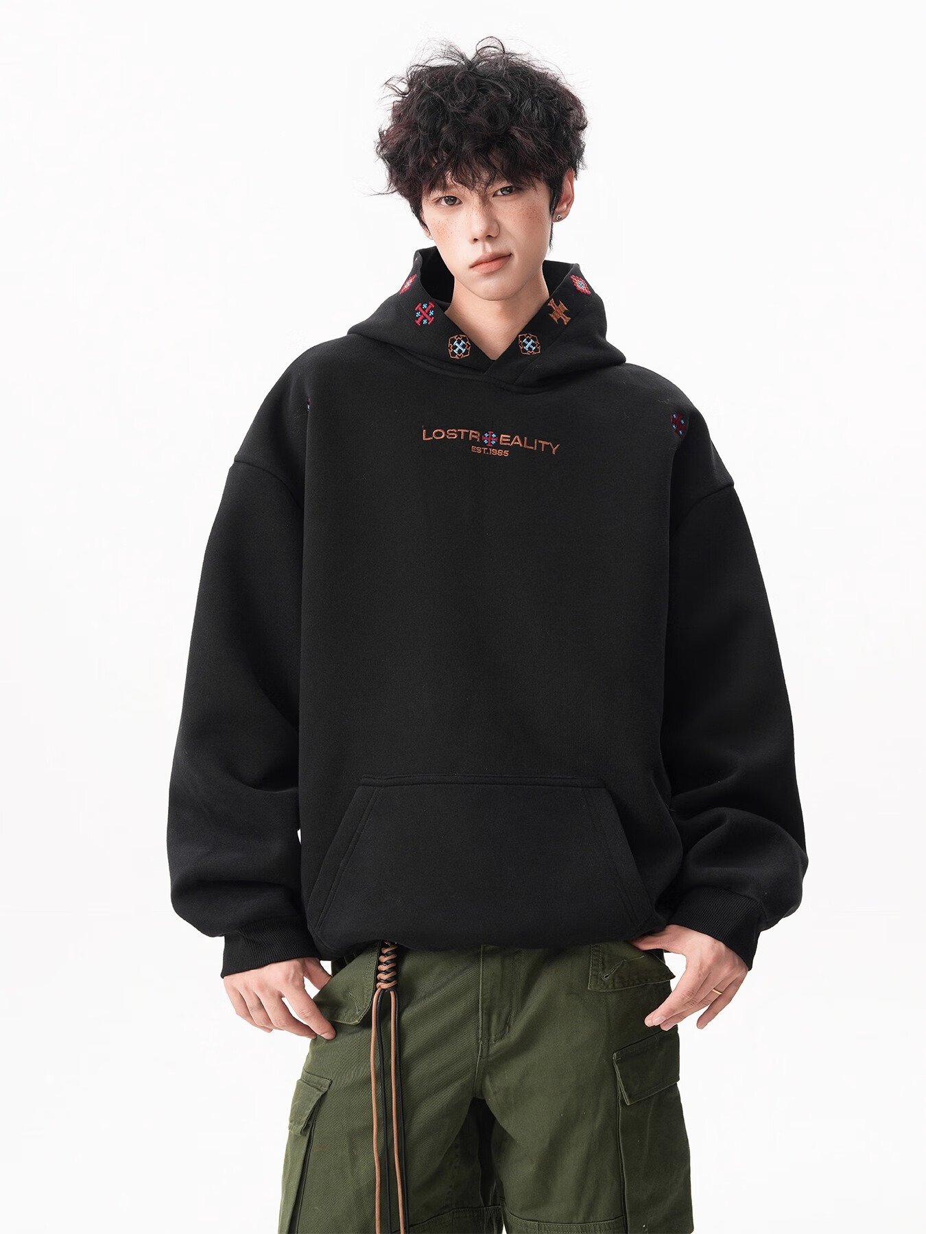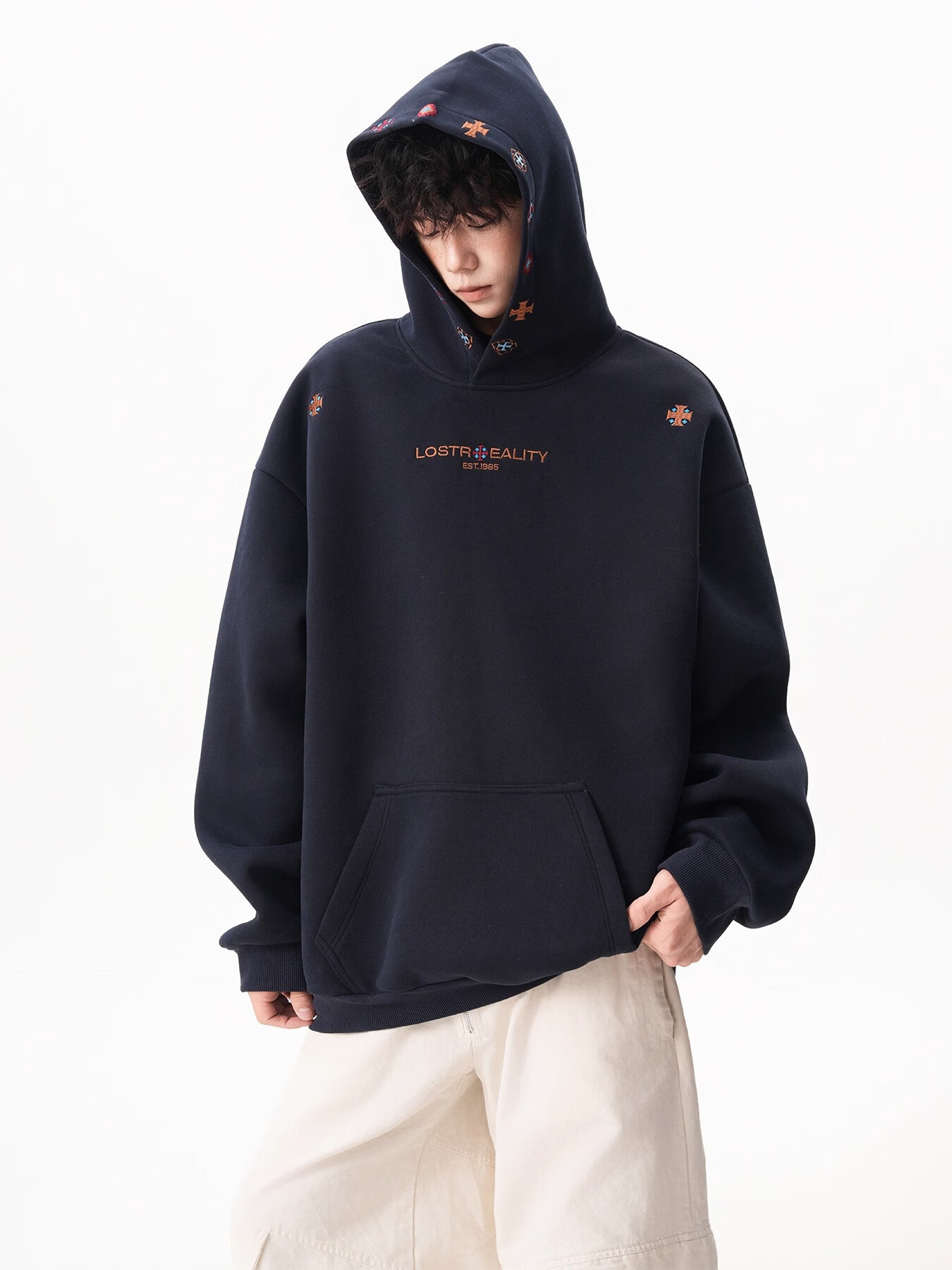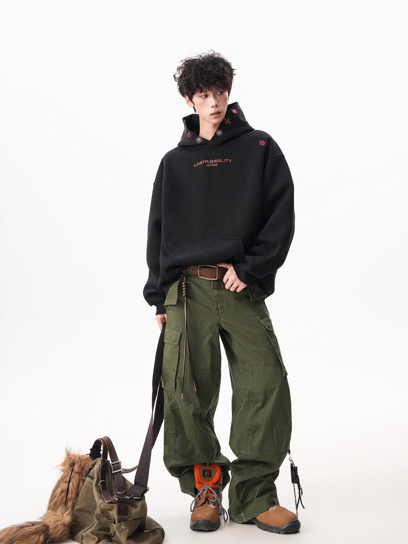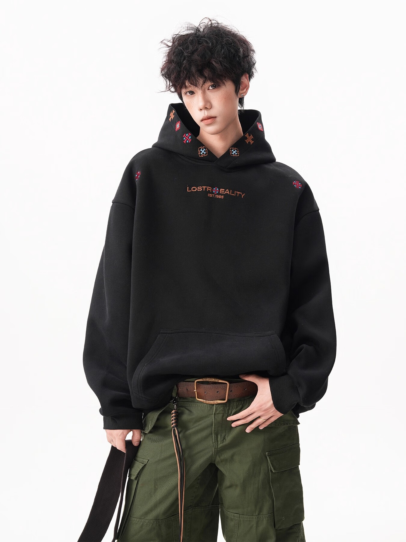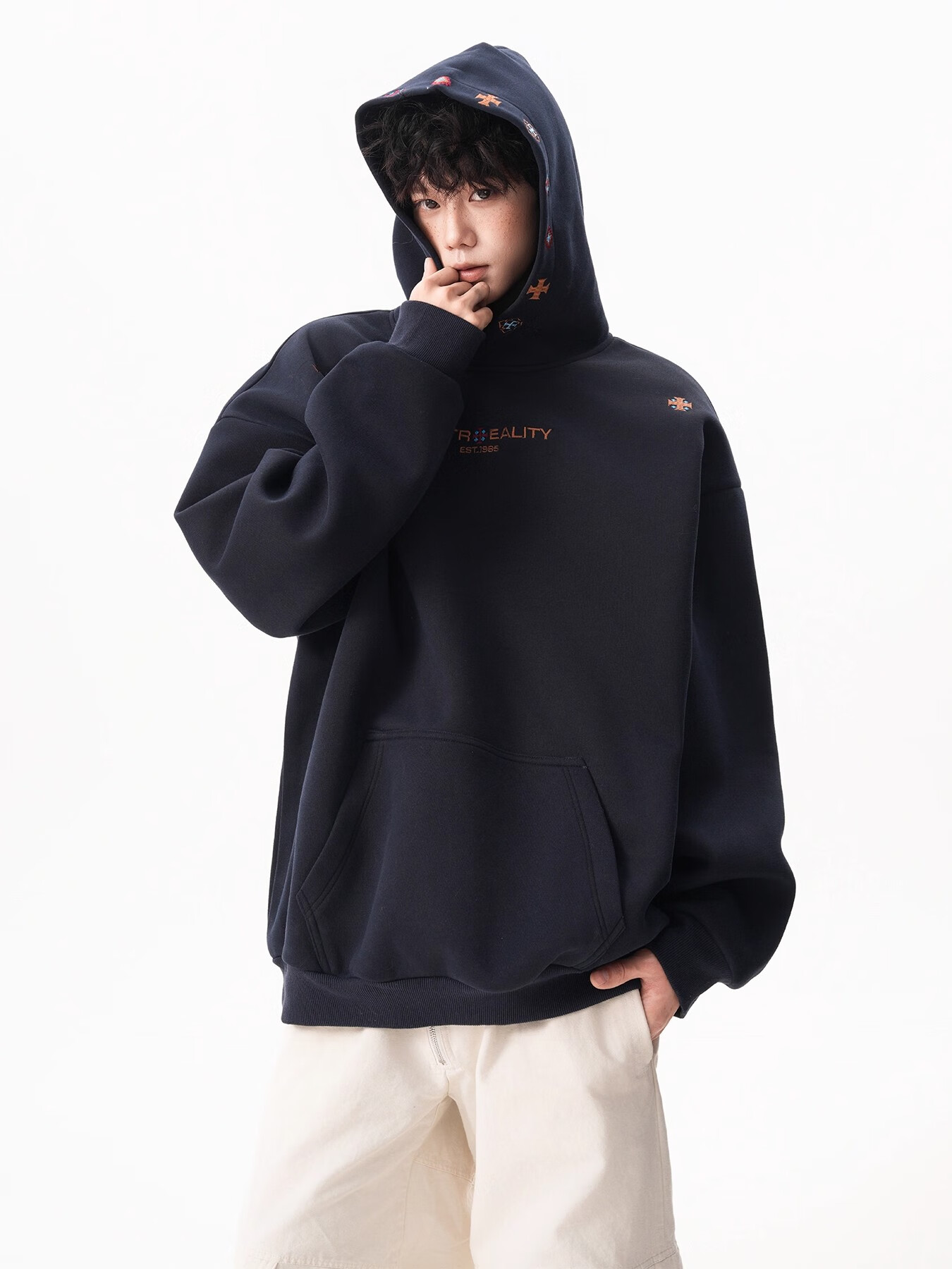OEMG 重磅500g刺绣连帽加绒加厚卫衣男士秋冬季潮牌美式宽松保暖外套 白花灰 【高品质】 XL [建议110-130斤]