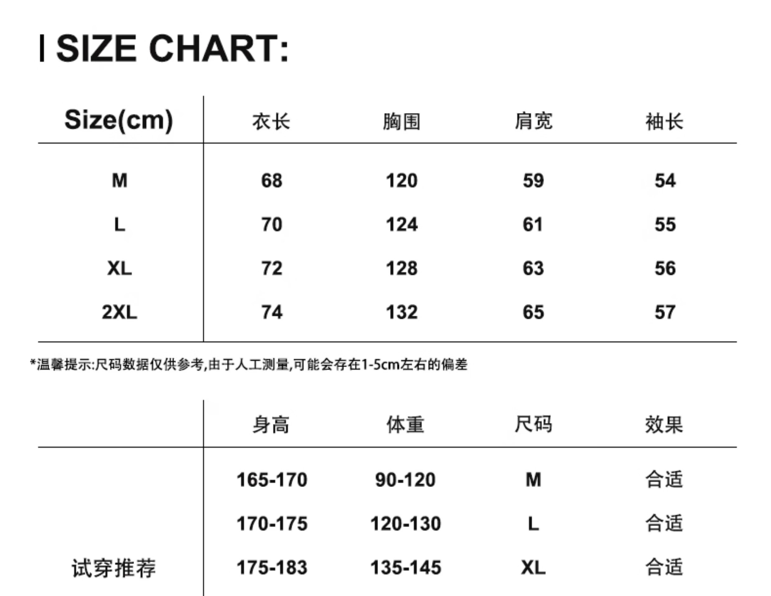 China (cm) 165 / 88-90 170 / 96-98 175 / 108-110 180 / 118-122 185 / 126-130