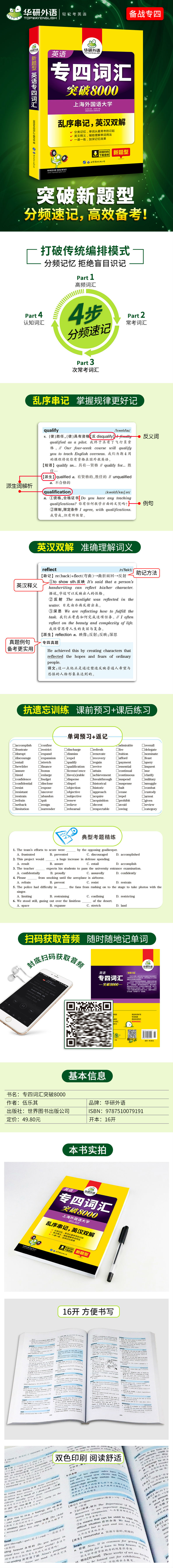 【新华书店 现货速达】2024专四词汇突破8000 华研外语英语专业四级TEM4专4可搭专四真题听力阅读完型语法作文写作