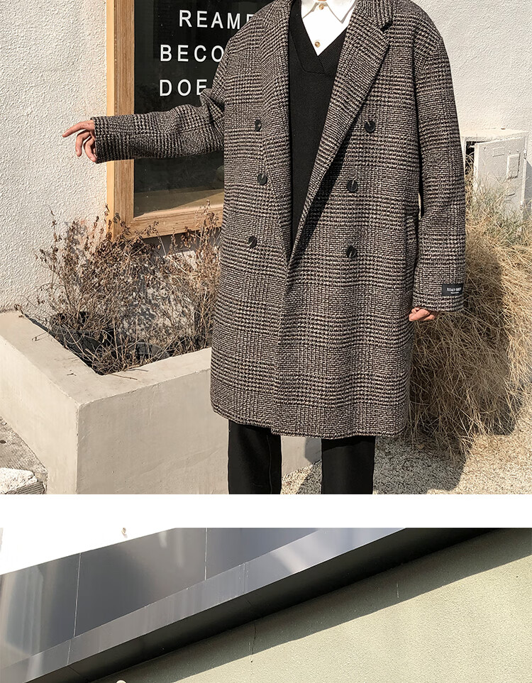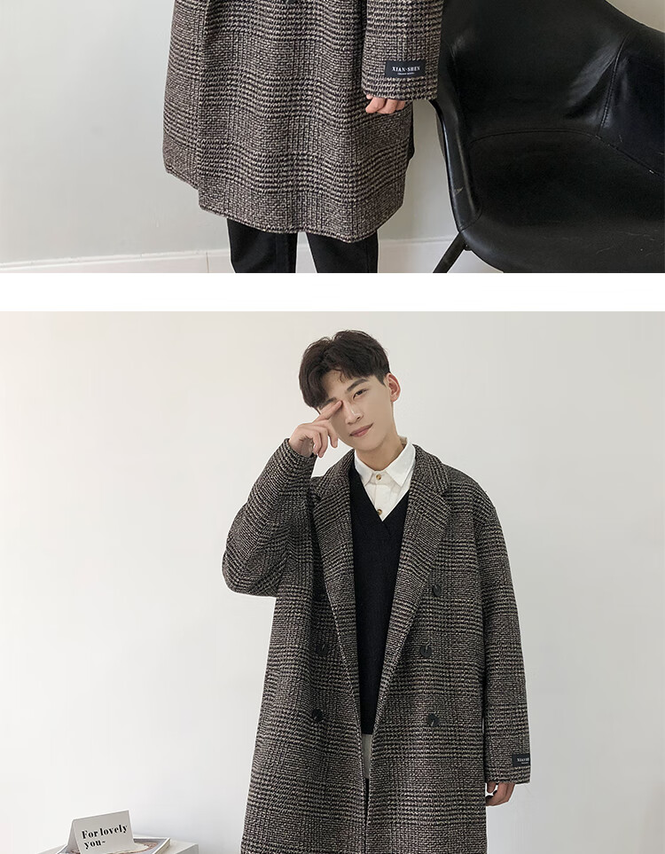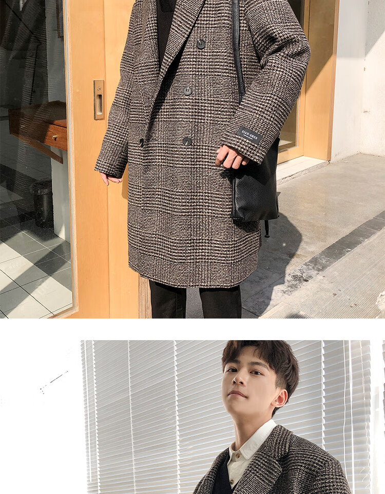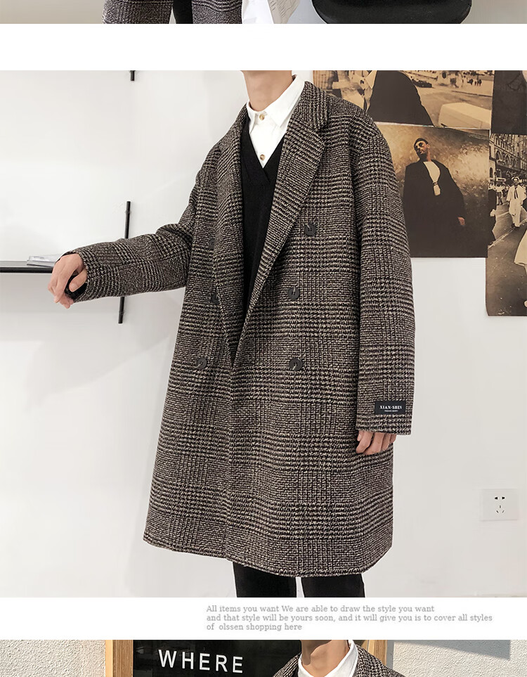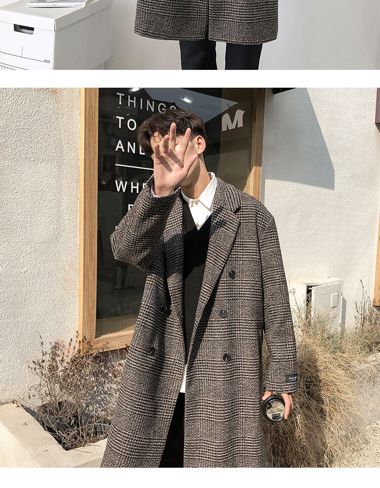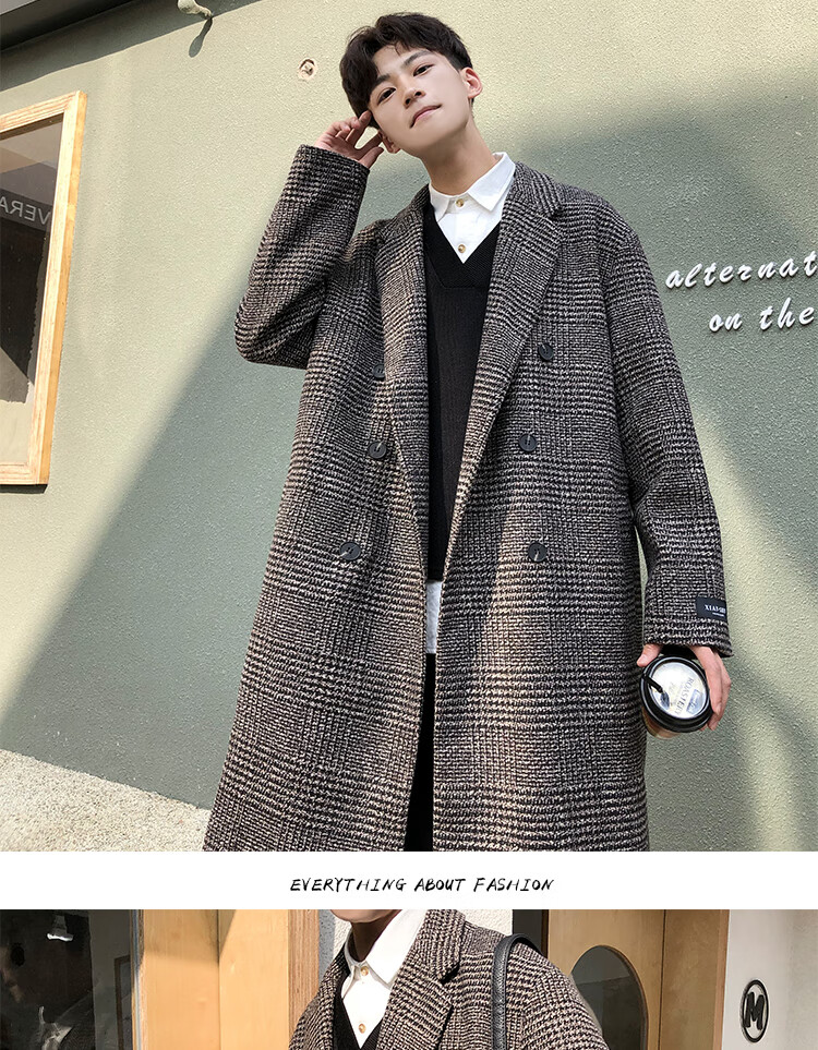 艾梵斯贝冬季新款千鸟格风衣外套男中长款韩版宽松格子帅气呢大衣过膝大衣 咖格 3XL