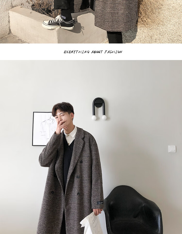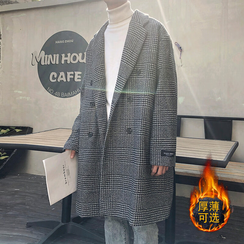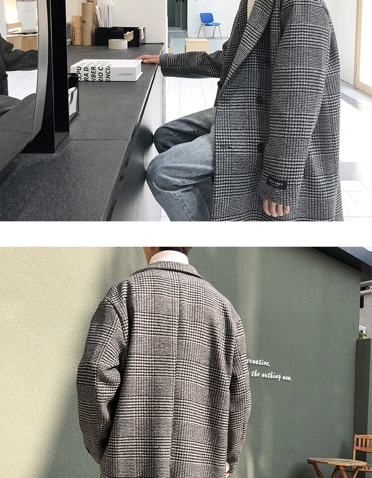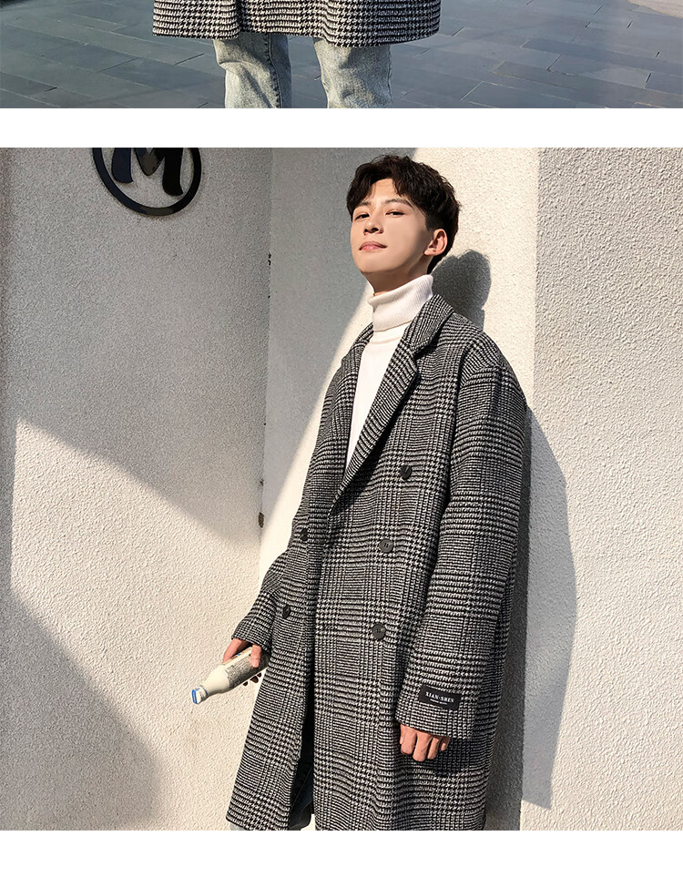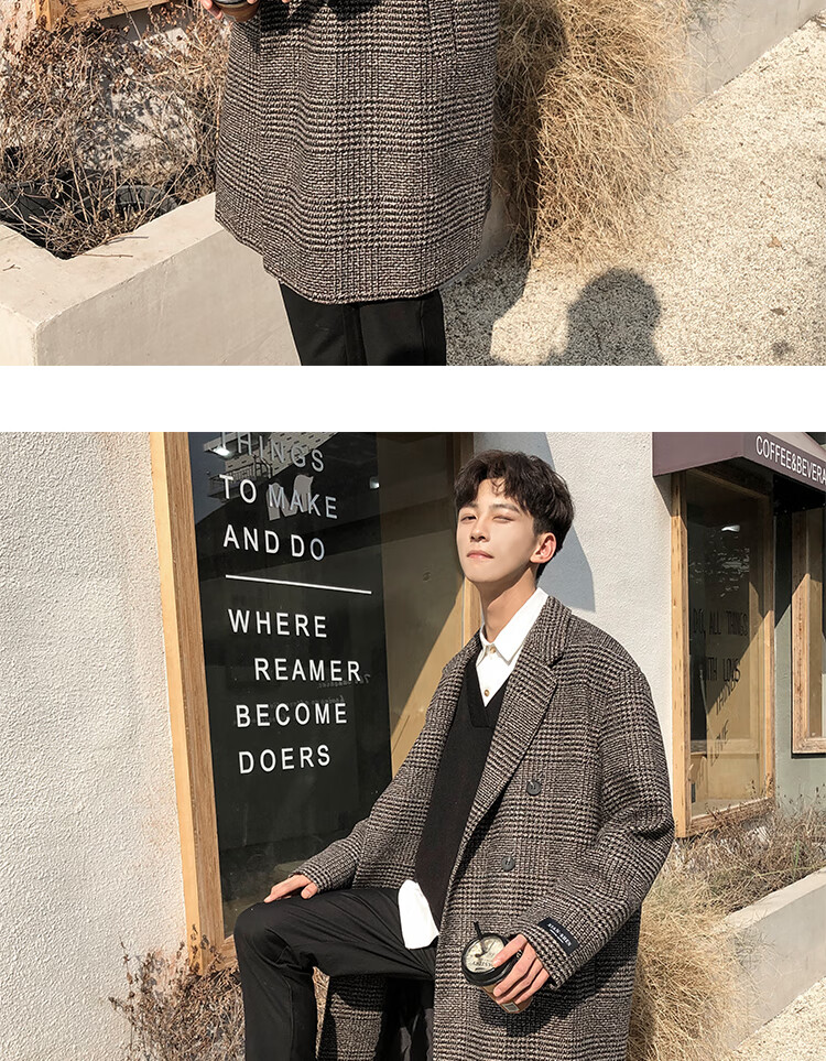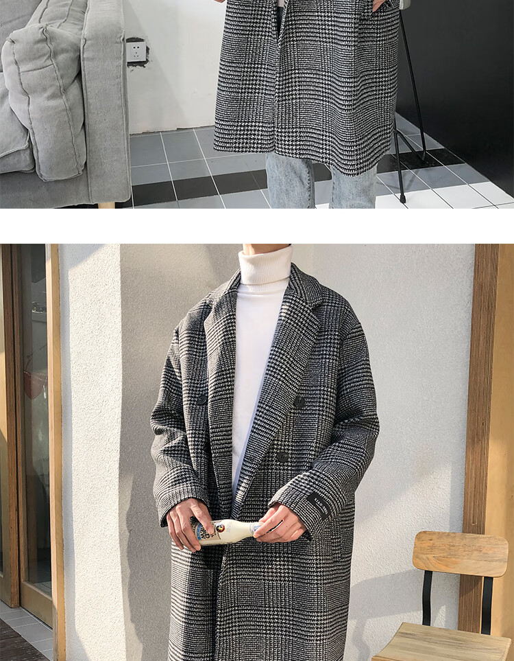 艾梵斯贝冬季新款千鸟格风衣外套男中长款韩版宽松格子帅气呢大衣过膝大衣 咖格 3XL