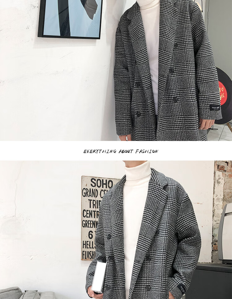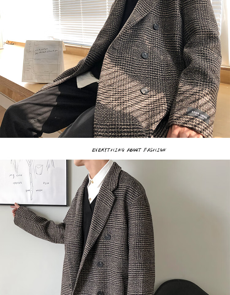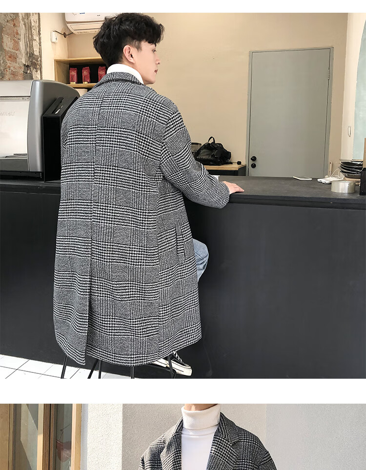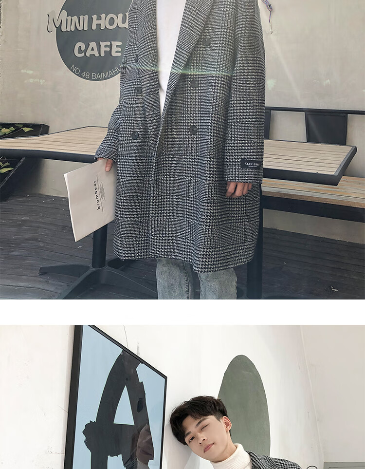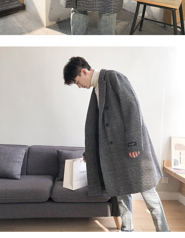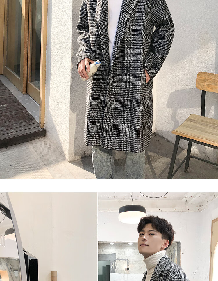 艾梵斯贝冬季新款千鸟格风衣外套男中长款韩版宽松格子帅气呢大衣过膝大衣 咖格 3XL