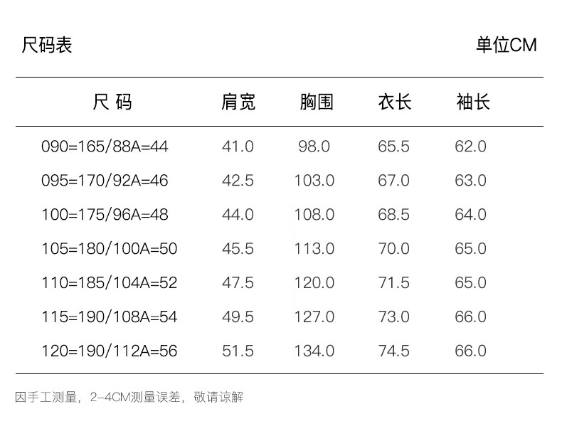 China (cm) 160-165/84-86 165-170 / 88-90 167-172 / 92-96 168-173 / 98-102 170-176 / 106-110