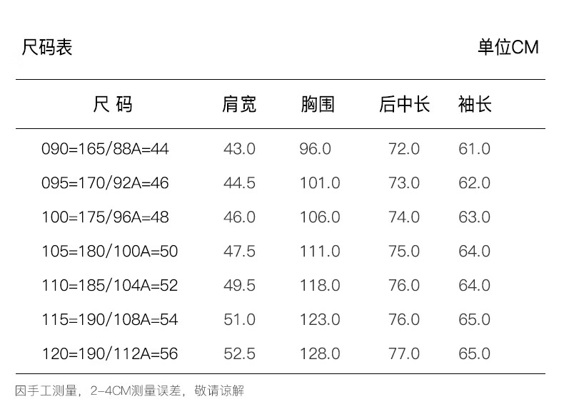 China (cm) 160-165/84-86 165-170 / 88-90 167-172 / 92-96 168-173 / 98-102 170-176 / 106-110