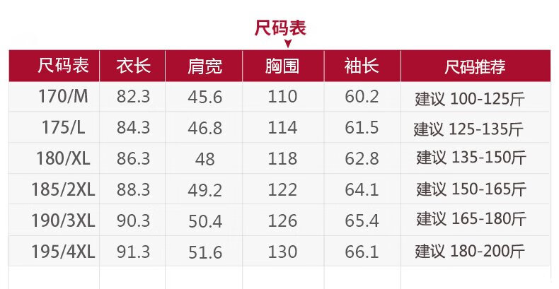 China (cm) 165 / 88-90 170 / 96-98 175 / 108-110 180 / 118-122 185 / 126-130