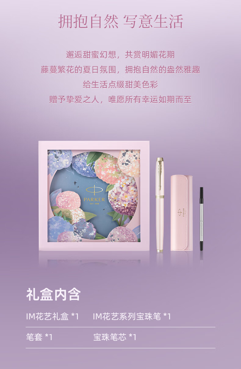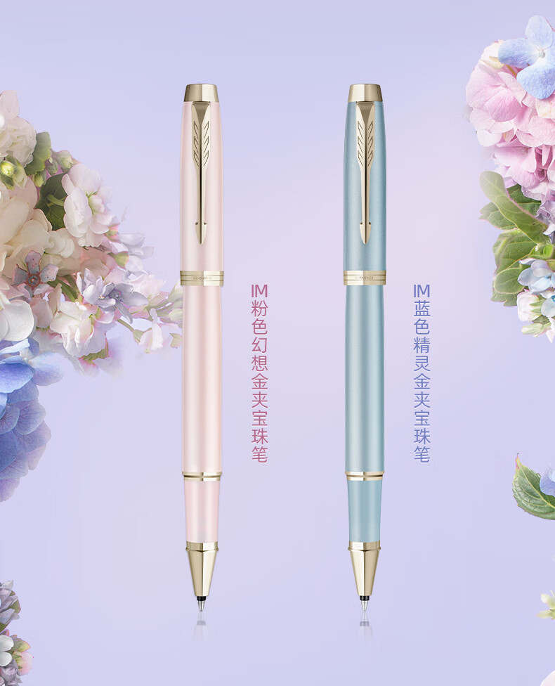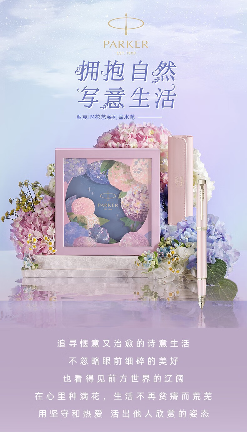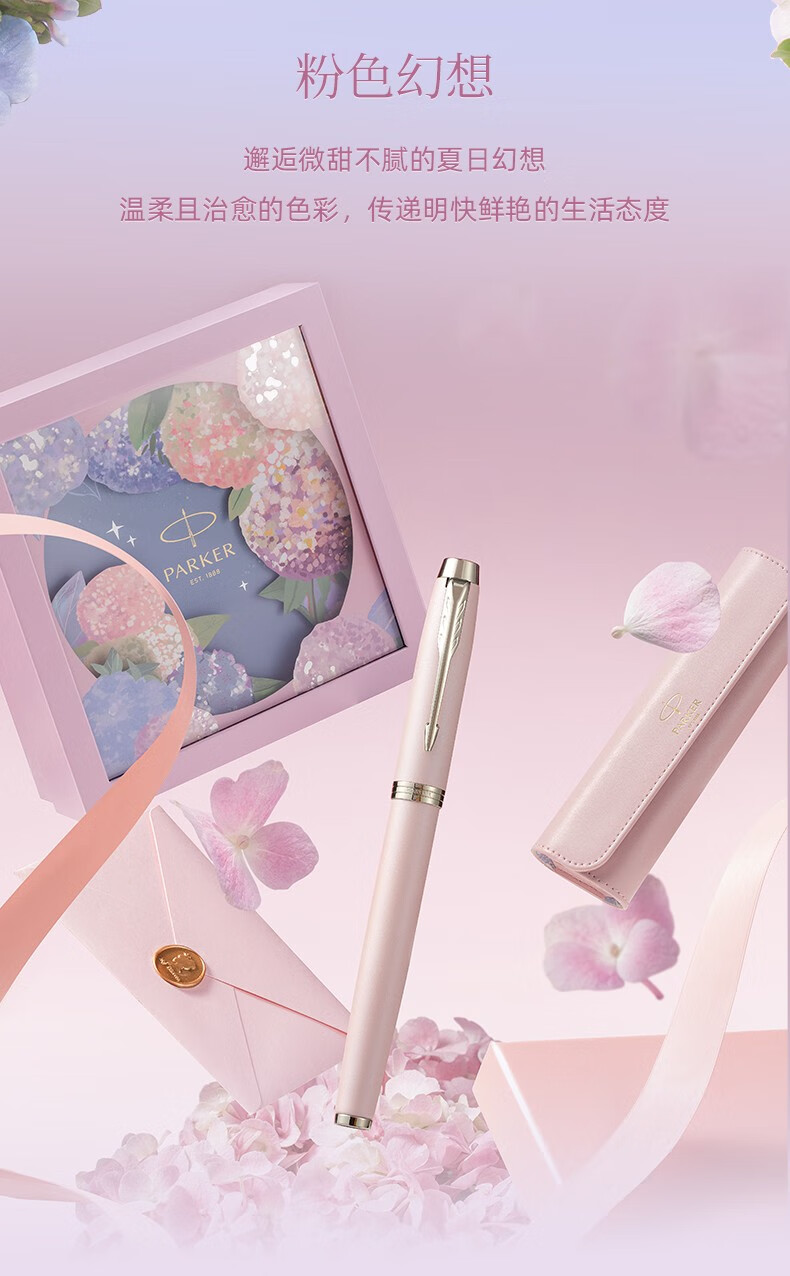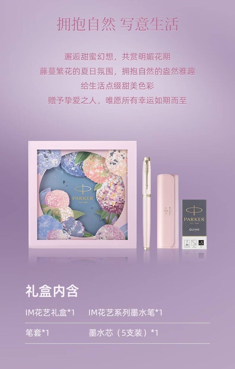 PARKER stylo et stylo à encre haut de gamme lumière luxe hortensia coffret cadeau IM série florale coffret cadeau pour hommes à envoyer aux femmes stylo de papeterie créatif macaron cadeau commémoratif de remise des diplômes IM rose fantaisie or clip stylo à encre + coffret cadeau art fleur d'hortensia
