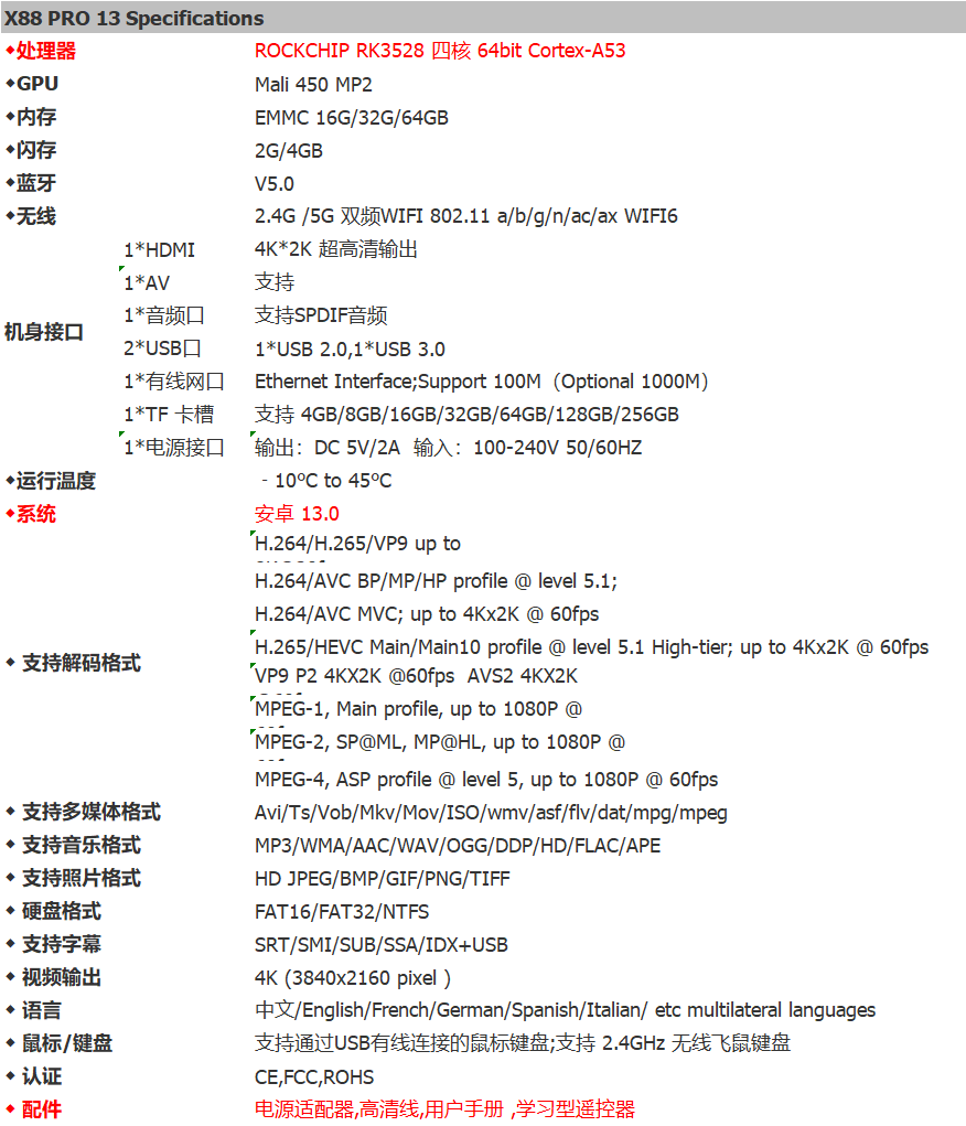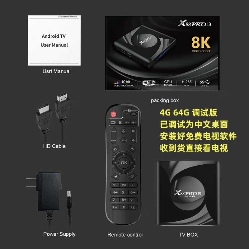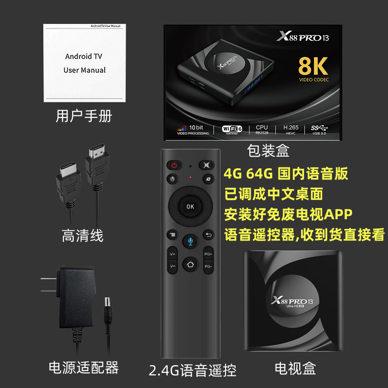 AIRWORLD foreign trade TV box X88 PRO 13 native Android 13 HD 8k network player WIFI6 Bluetooth 5 4G 64G domestic version installed VIP film and television