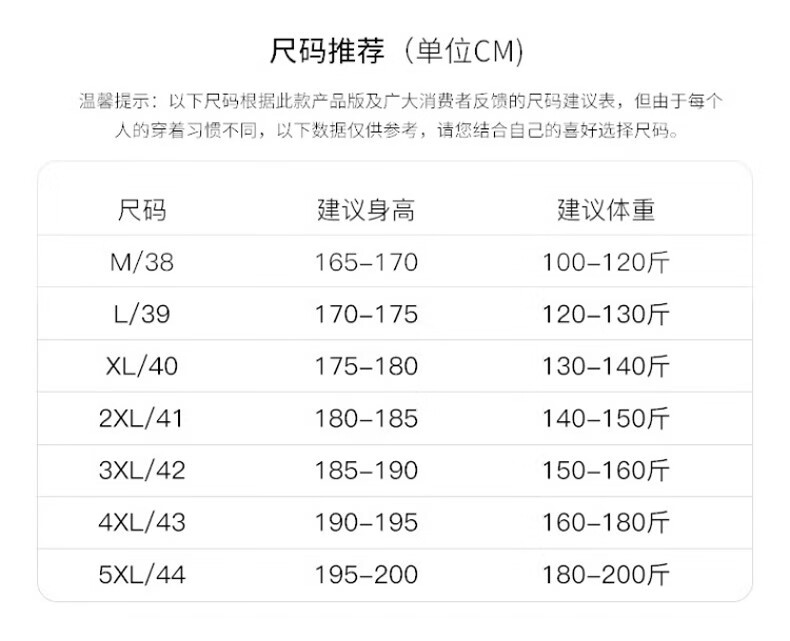 China (cm) 165 / 88-90 170 / 96-98 175 / 108-110 180 / 118-122 185 / 126-130