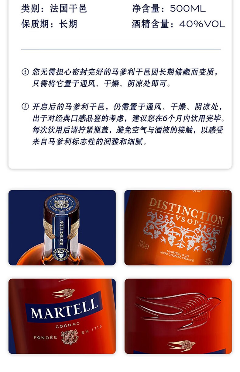 马爹利Martell VSOP马爹利鼎盛干邑白兰地法国洋酒 500ml 一瓶一码 500mL 1瓶