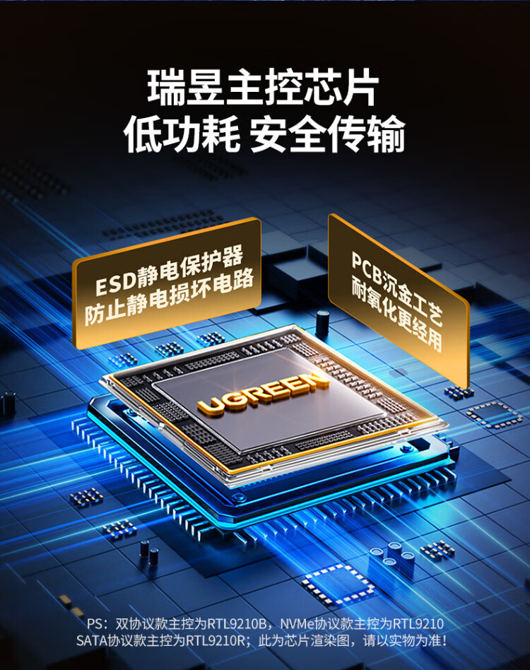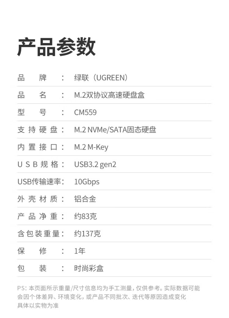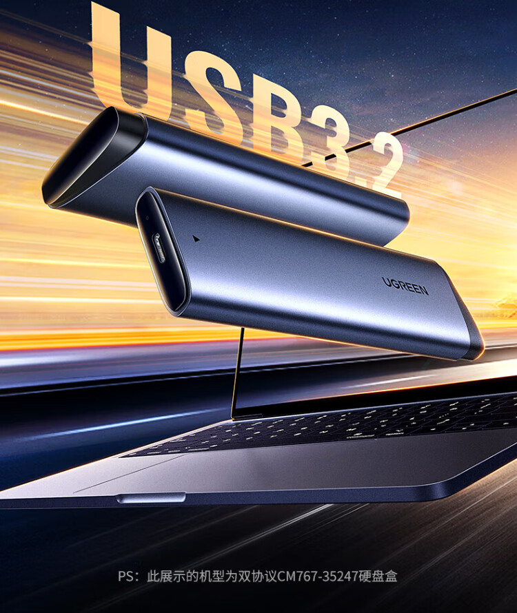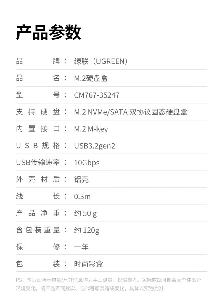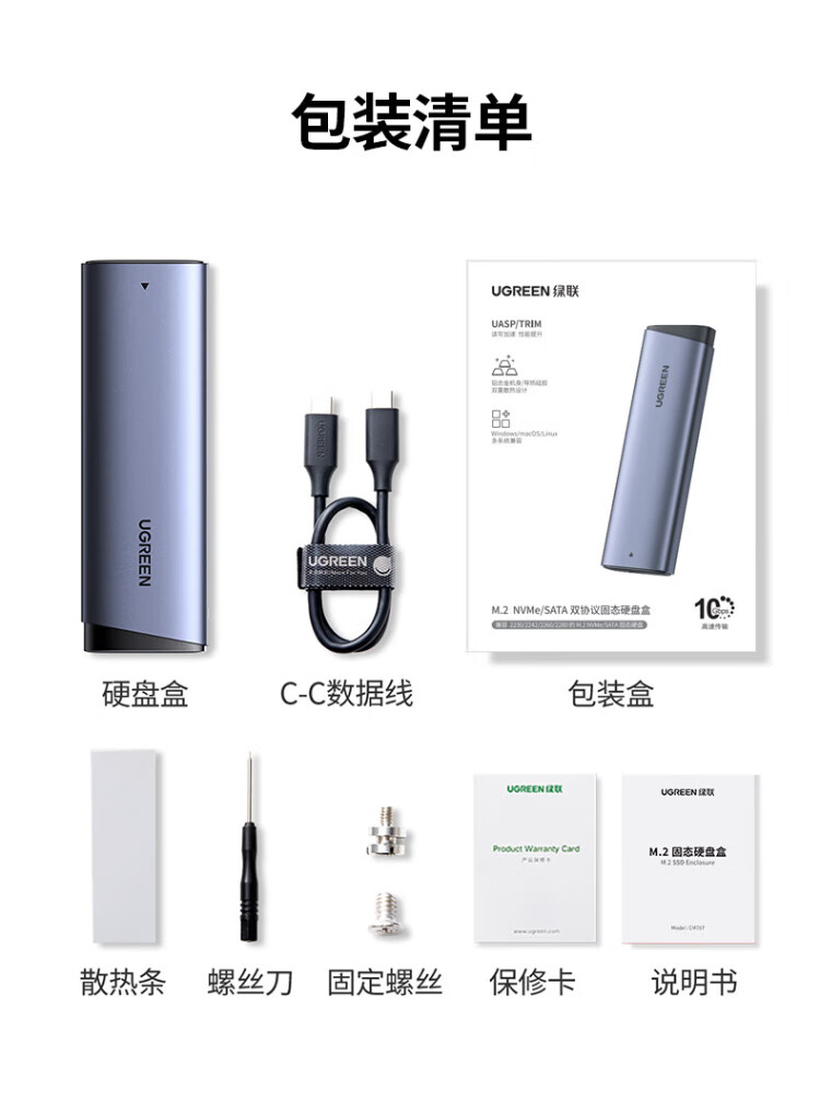 绿联 M.2 NVMe/SATA移动硬盘盒双协议 Type-C3.2固态硬盘盒 适用笔记本电脑苹果16外接SSD机械硬盘盒子 M.2 NVMe【10Gbps鳍纹散热】配CC线