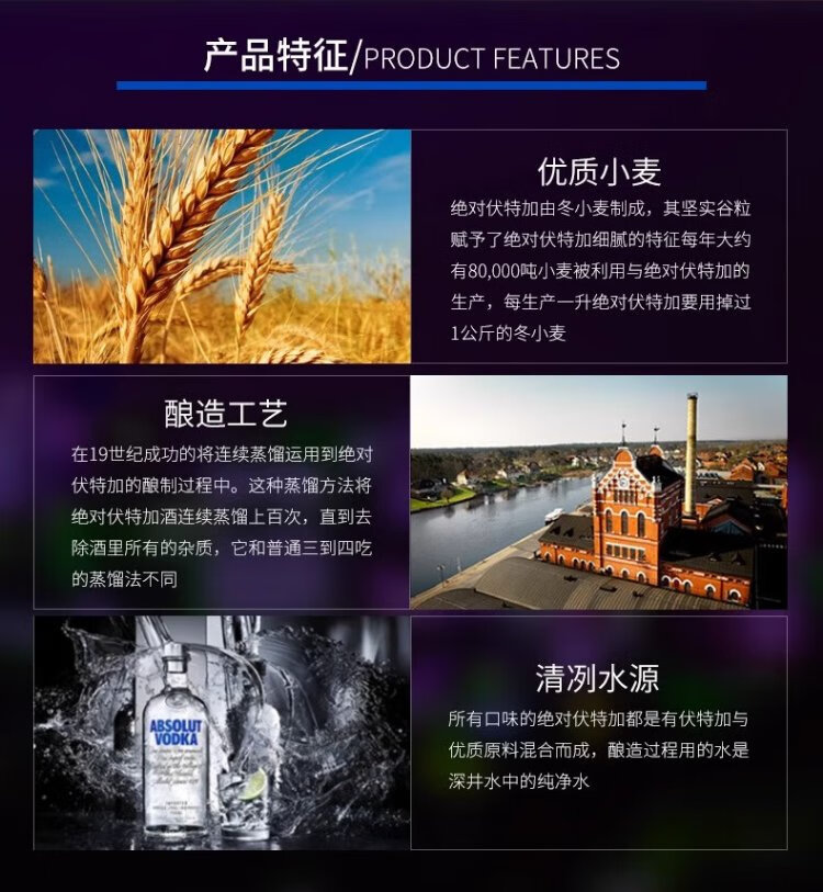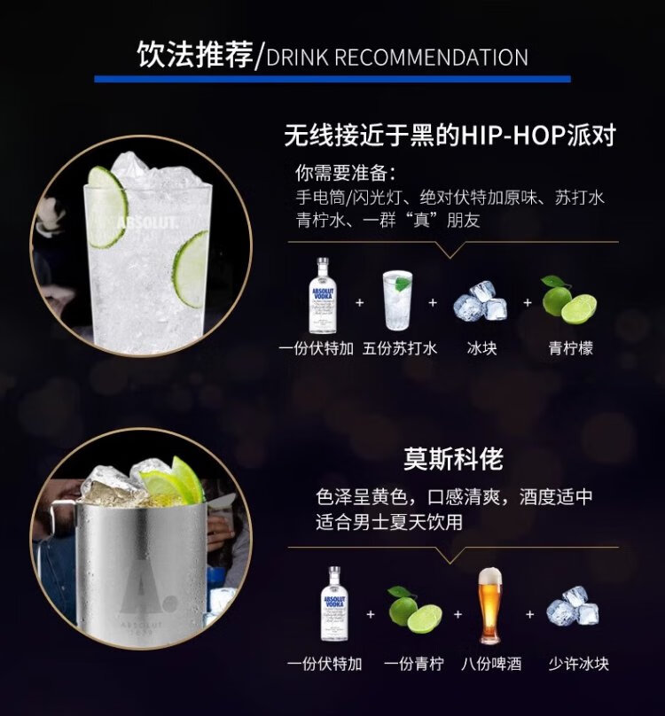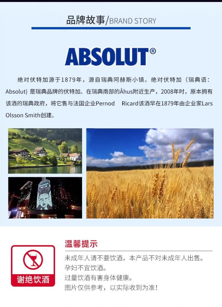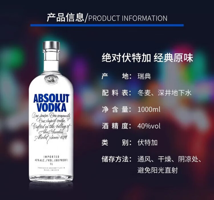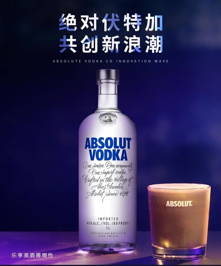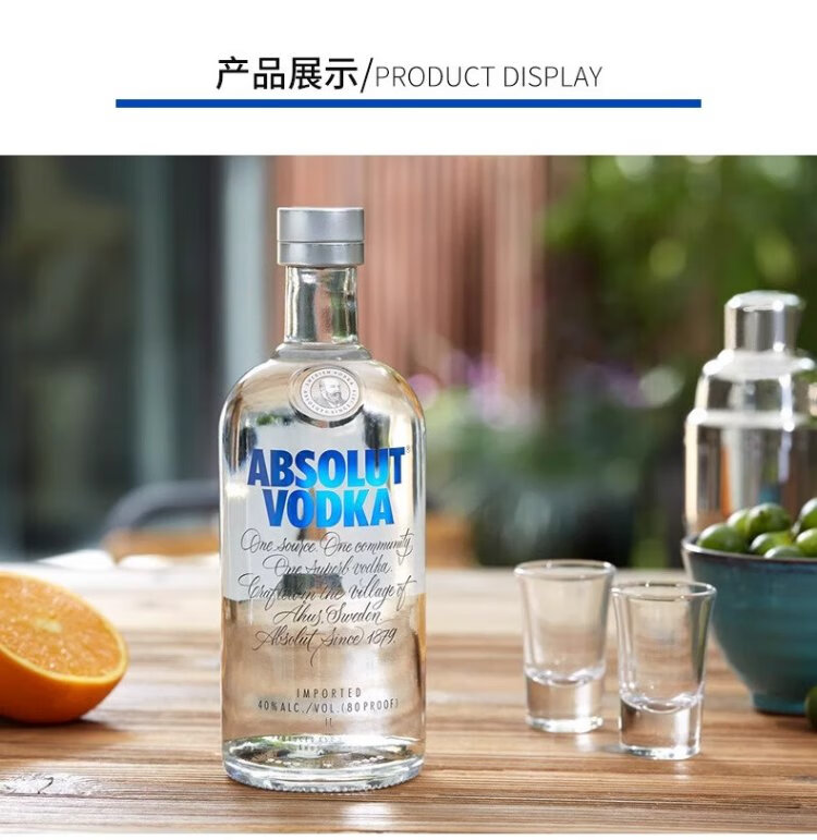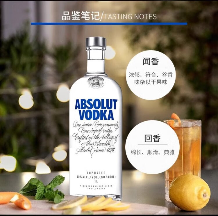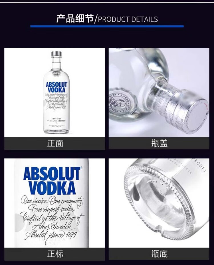 绝对伏特加Absolut原味1L伏特加1000ml 经典原味40度烈酒原装进口鸡尾酒洋酒 原味 1000mL 1瓶 有码-裸瓶