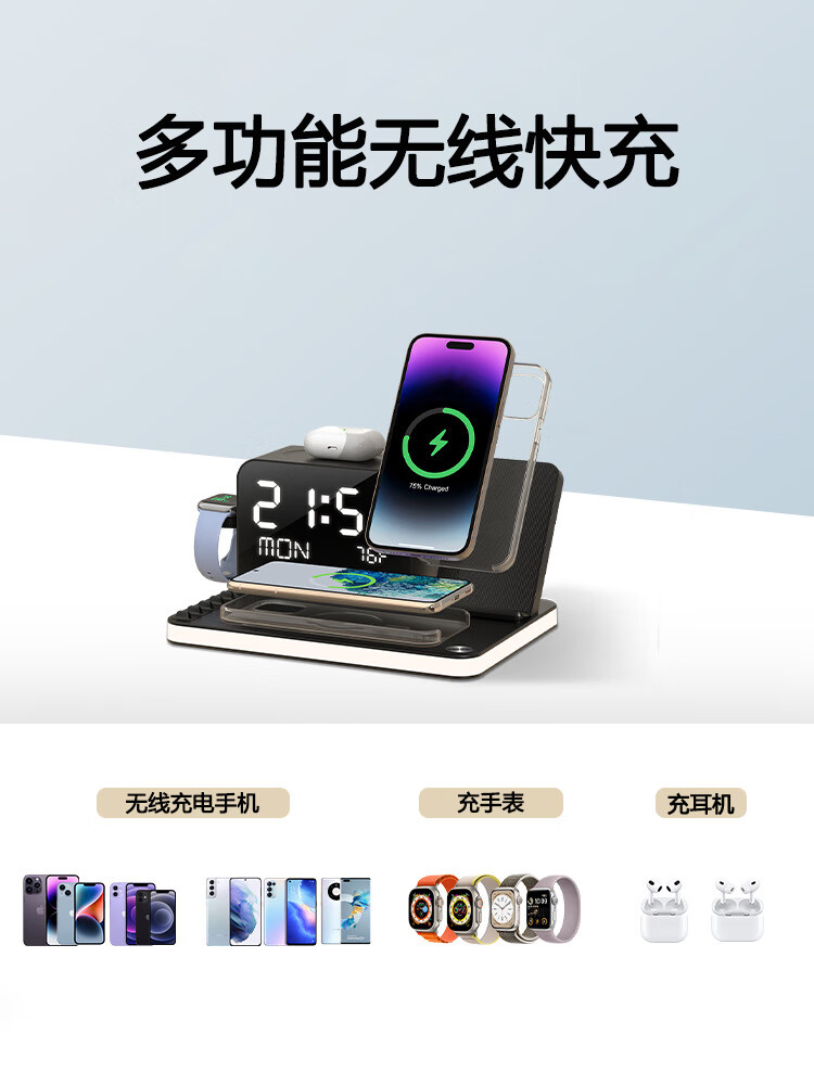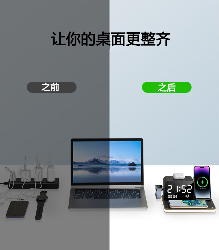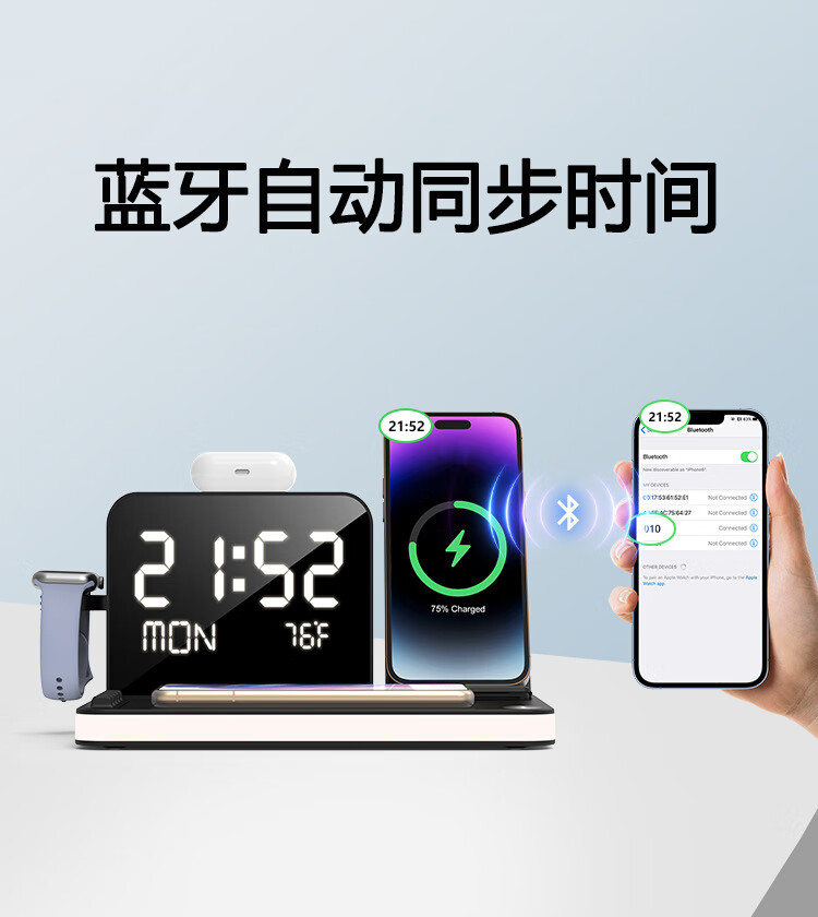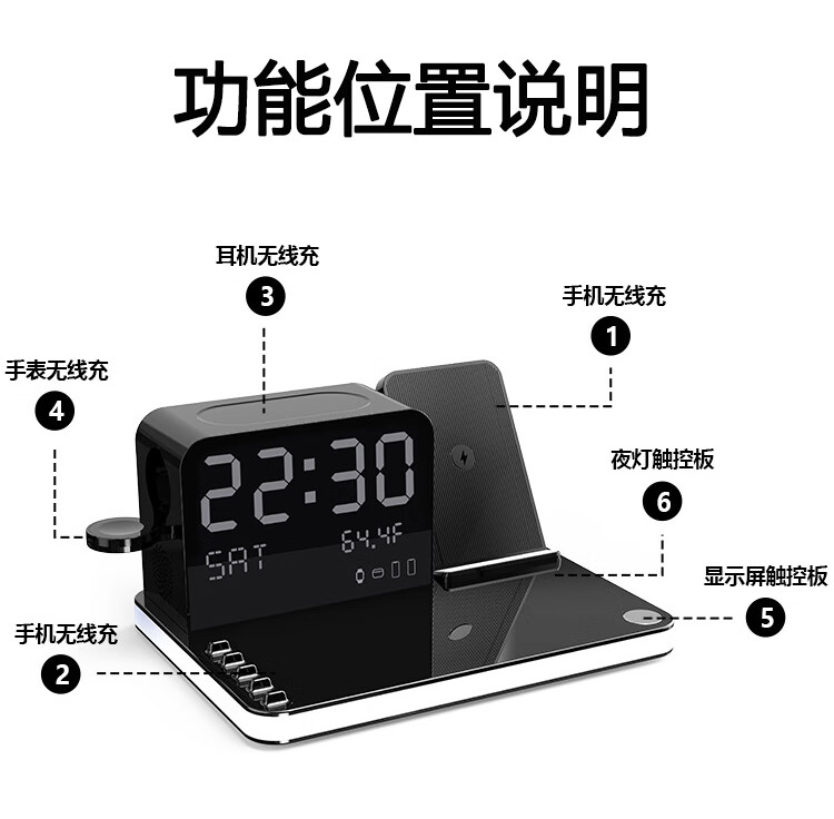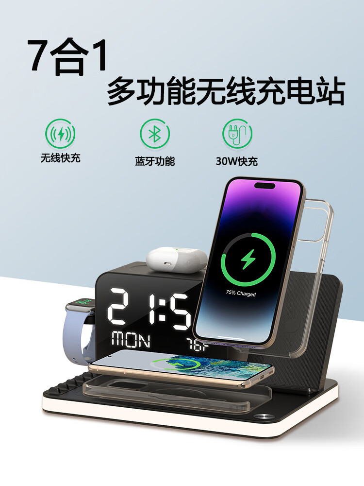 Thomas 7-en-1 chargeur sans fil tactile veilleuse temps de synchronisation Bluetooth haute puissance multifonction bureau sans fil charge rapide téléphone portable casque montre peut être personnalisé cadeau d'entreprise LOGO noir (chargeur sans fil multifonction 7-en-1)