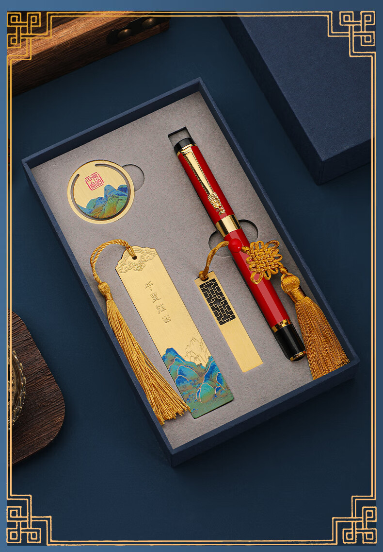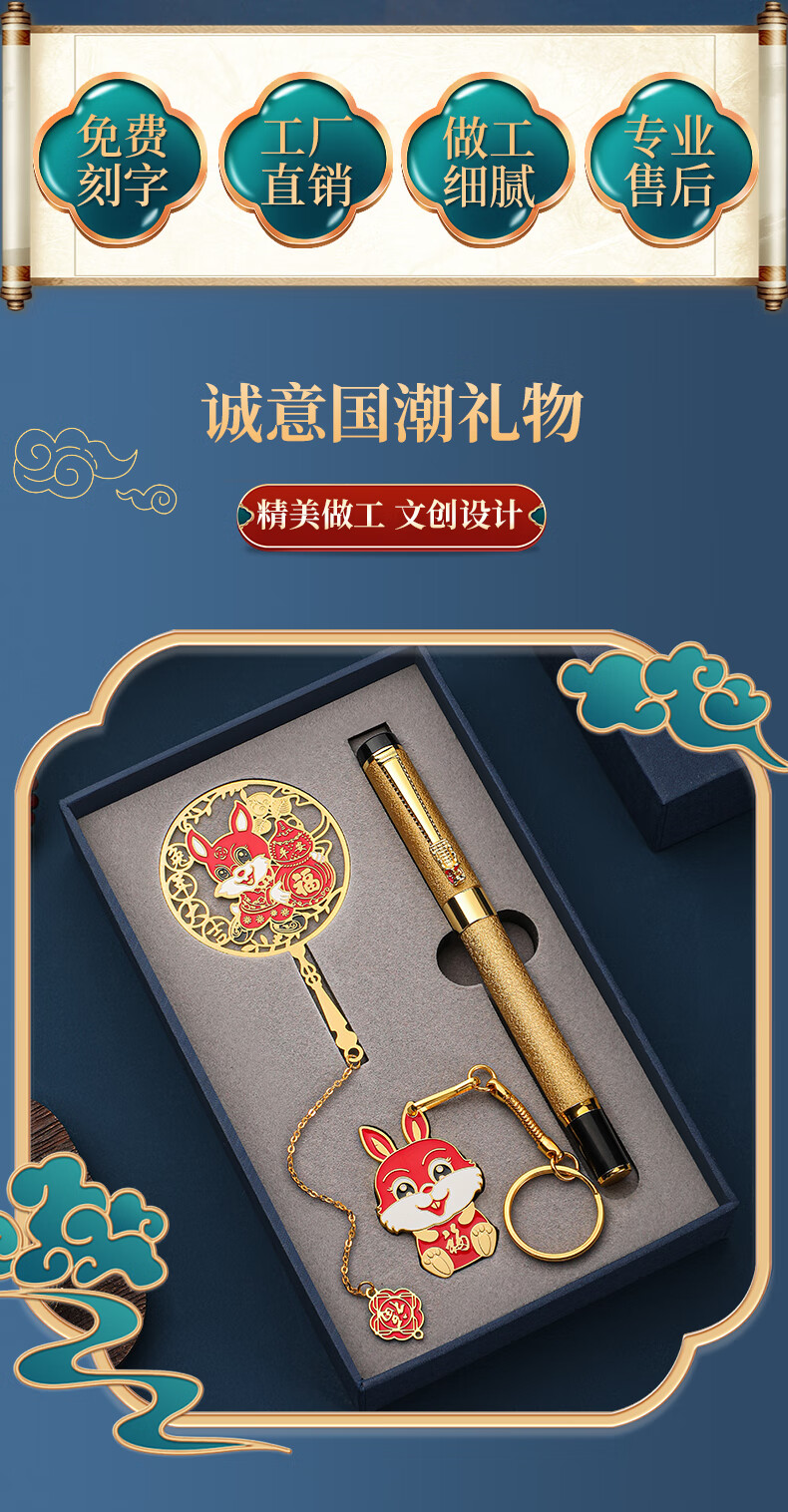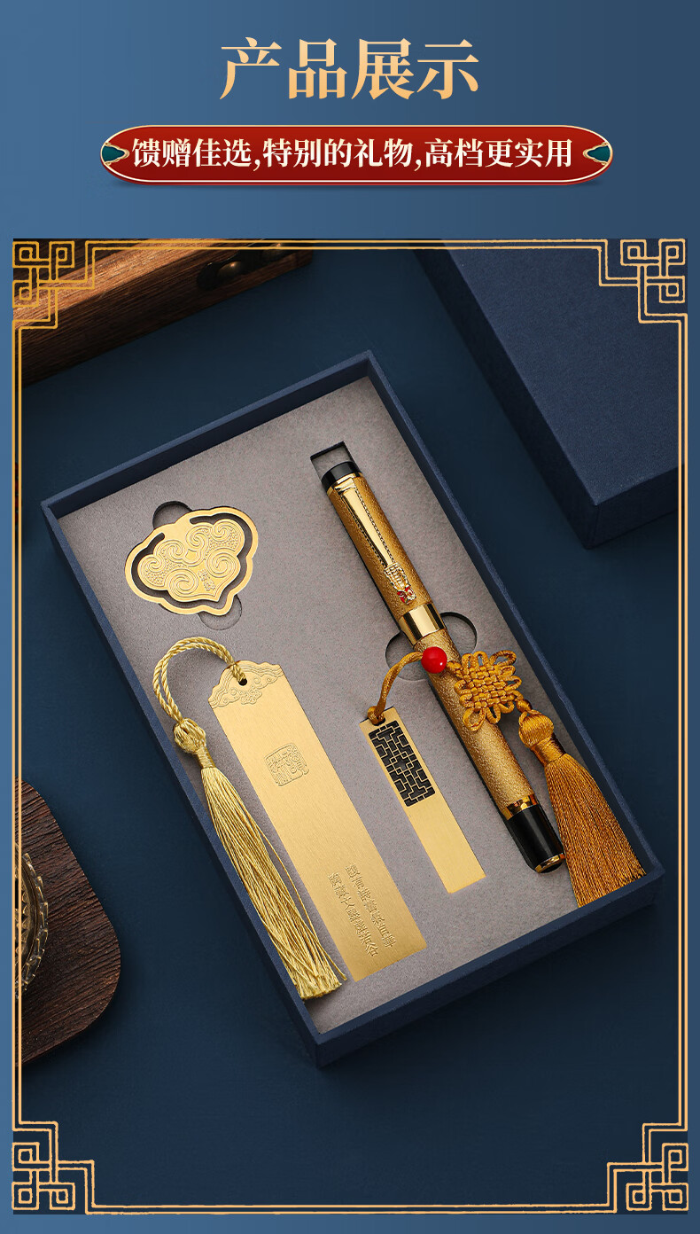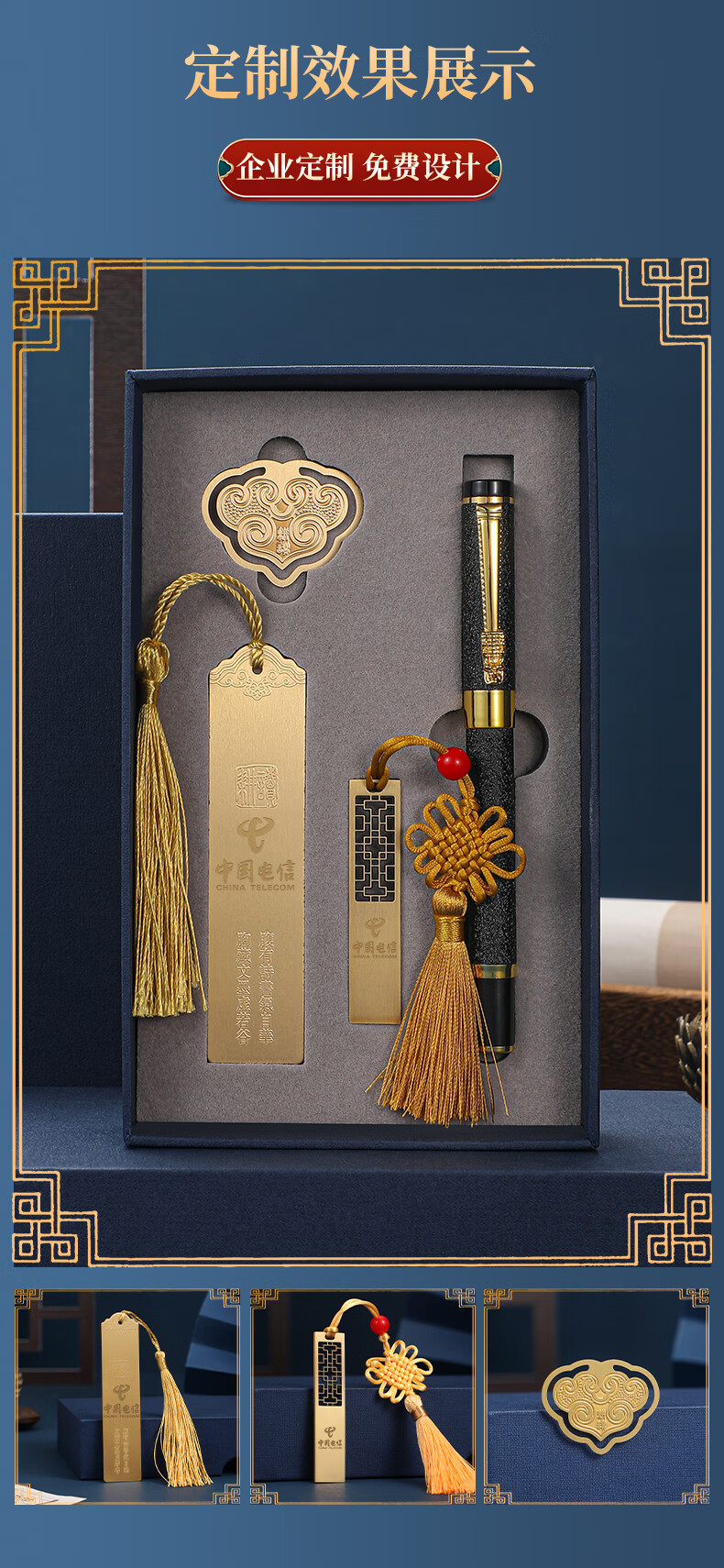 宏量钢笔礼盒套装生日礼物纪念品U盘书签三四年级小学生练字教师节毕业礼物开业活动礼品免费定制名字 2件套蓝礼盒【黄铜江山图书签+金色龙头钢笔】