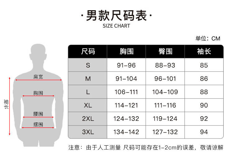 China (cm) 165 / 88-90 170 / 96-98 175 / 108-110 180 / 118-122 185 / 126-130
