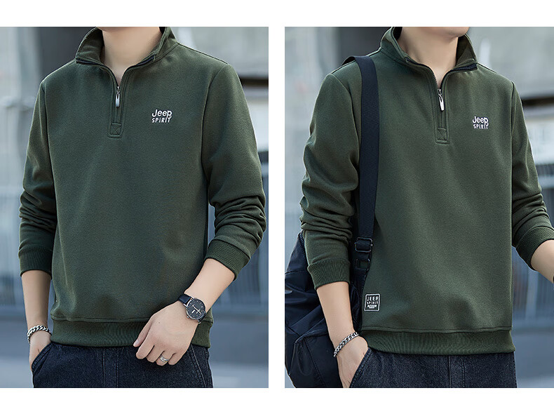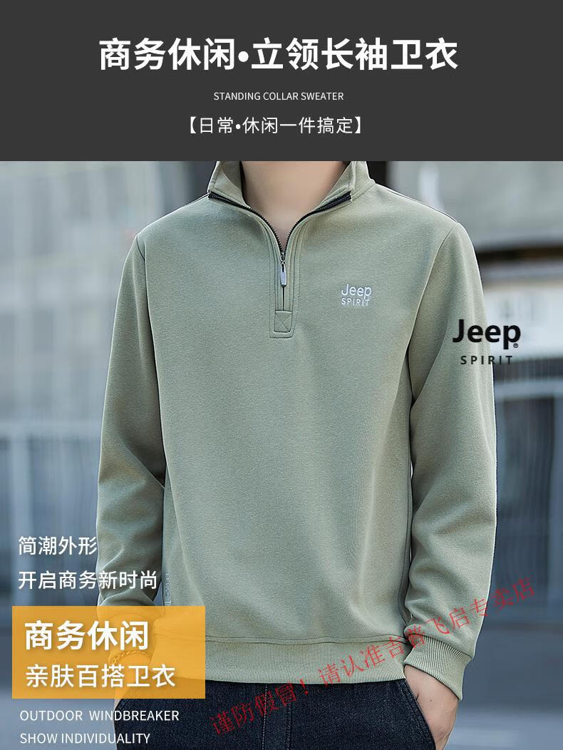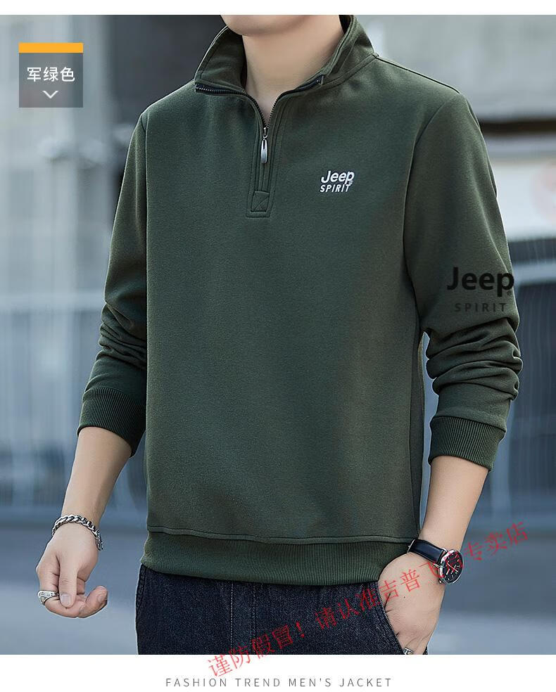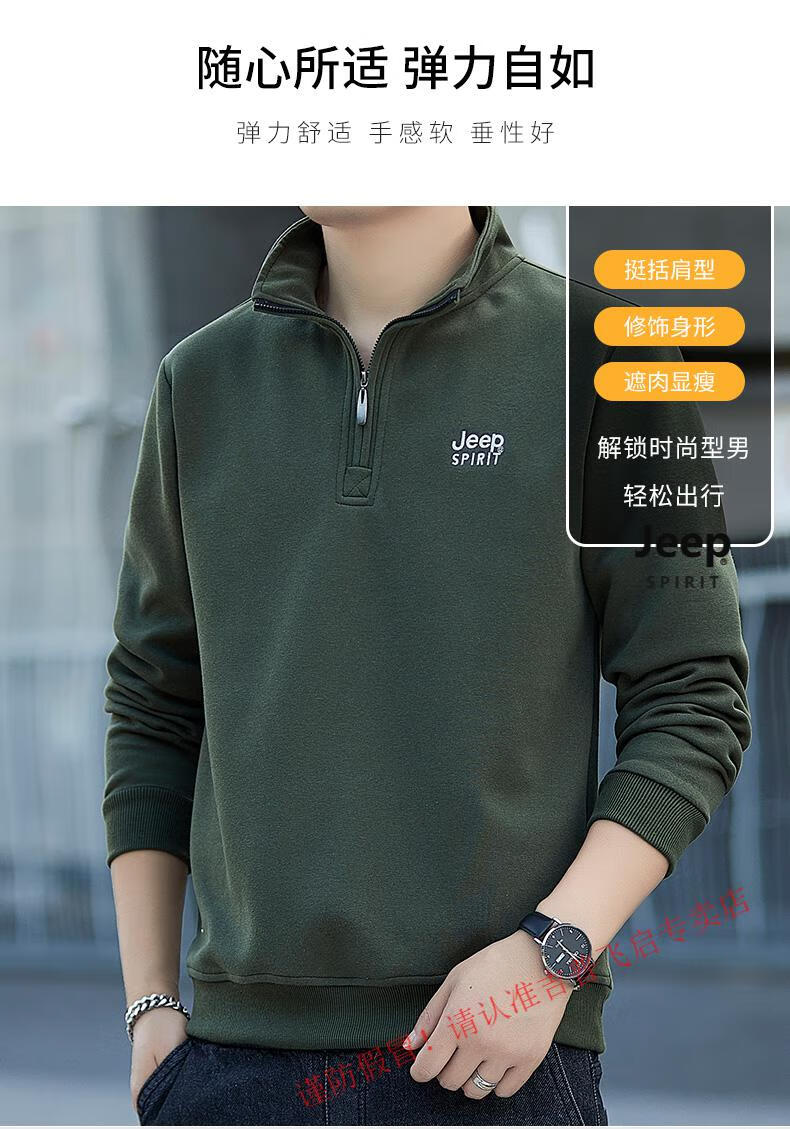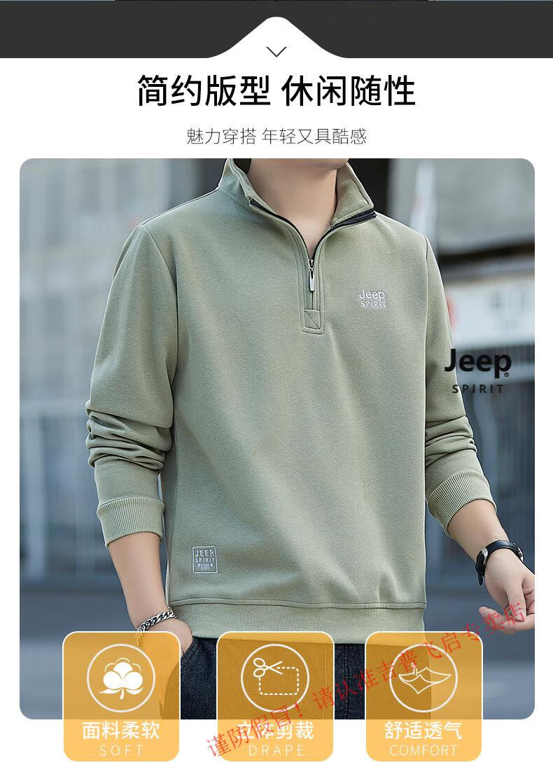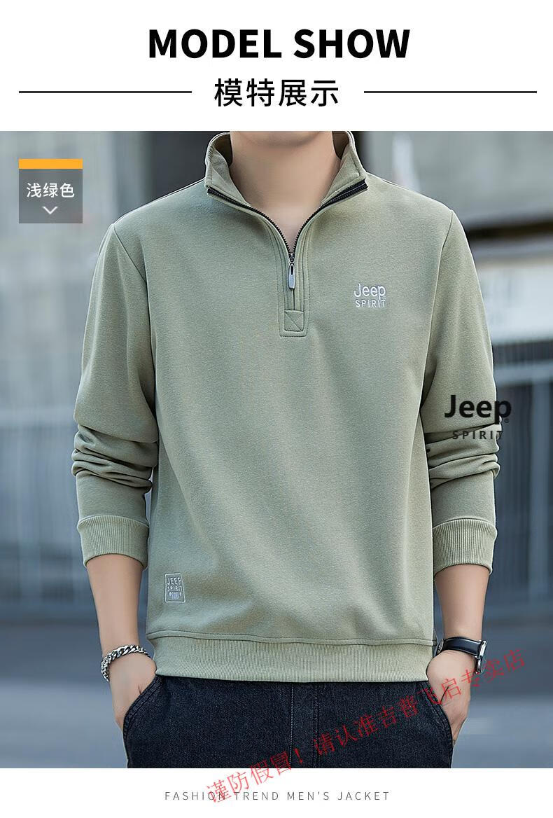 JEEP SPIRIT Jeep pure cotton sweatshirt men's spring and autumn new loose large size stand-up collar half-zip casual pullover long-sleeved top Army Green 2XL 140-160Jin Jin equals 0.5 kg
