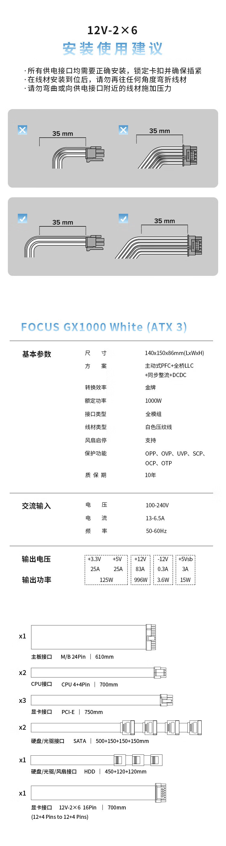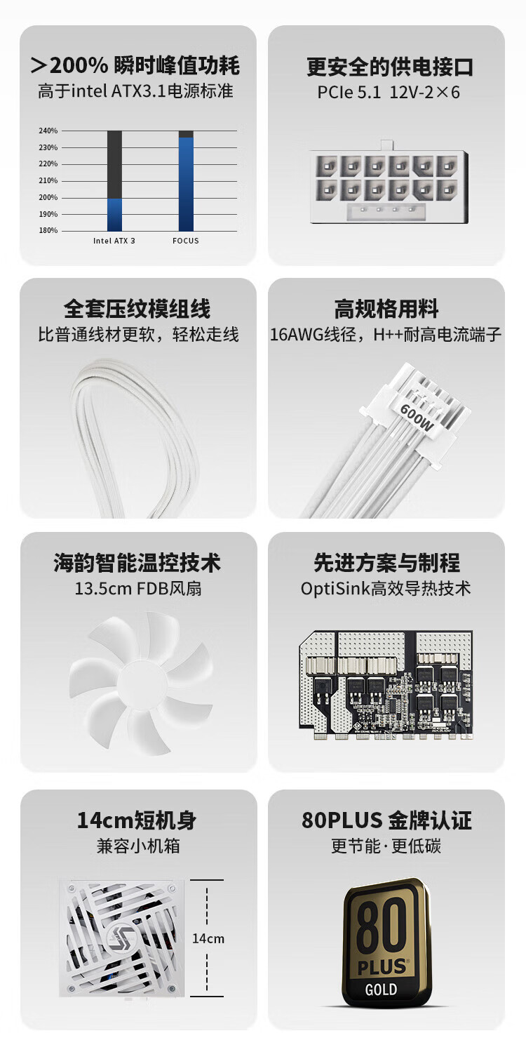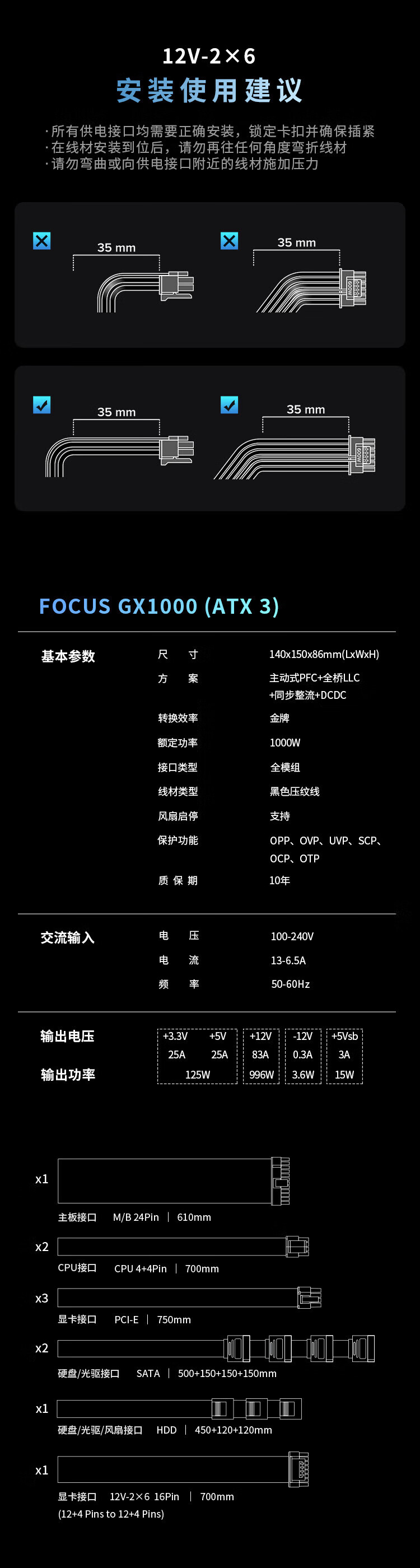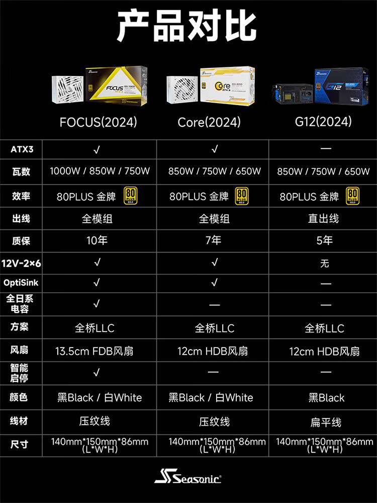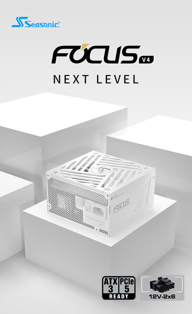 海韵新款ATX3(2024)海韵电源FOCUS GX1000 850 750ATX3金牌全模全日系电容压纹线原生12V-2×6支持5090 新版FOCUS GX1000 ATX3(2024)