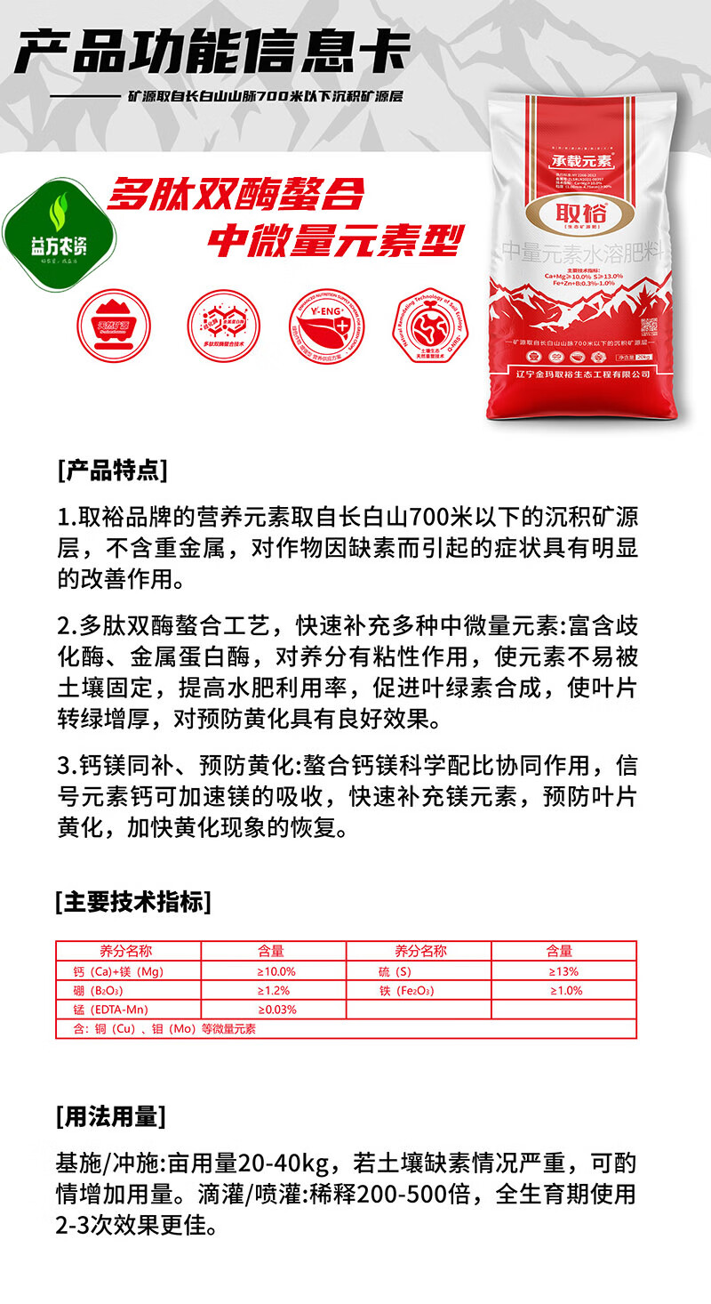 Liaoning Jinma Chuyu fully water-soluble boron magnesium calcium iron zinc polypeptide double enzyme chelated trace elements water-soluble fertilizer 20 kg * 1 bag