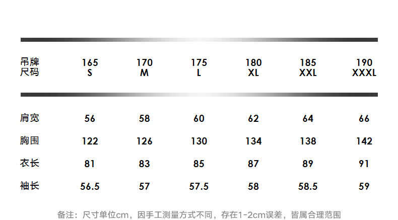 China (cm) 165 / 88-90 170 / 96-98 175 / 108-110 180 / 118-122 185 / 126-130