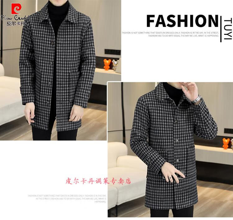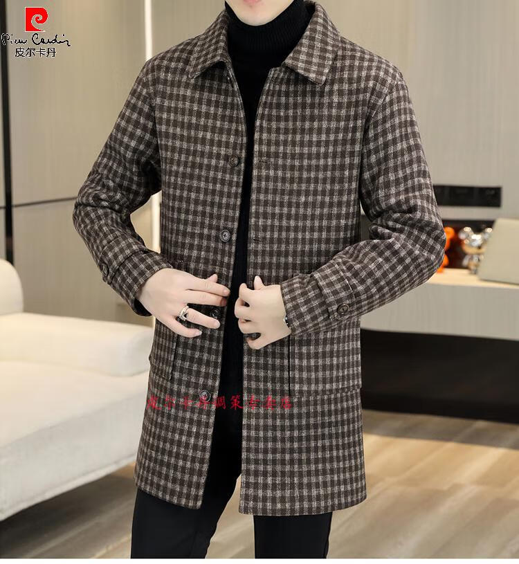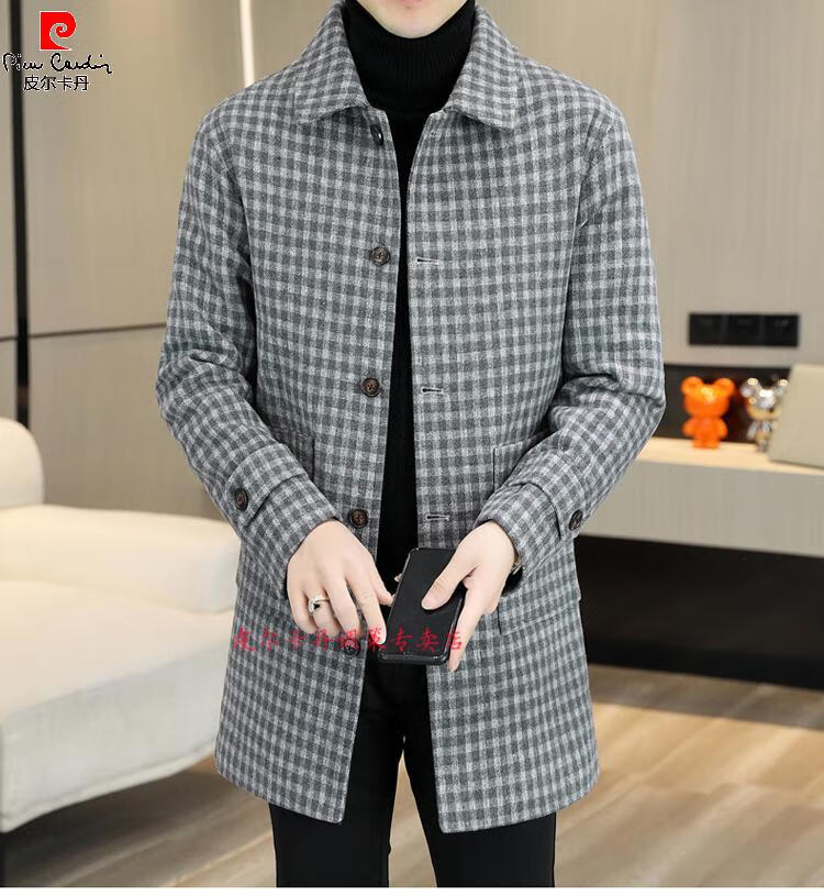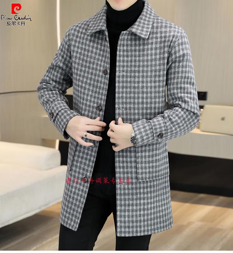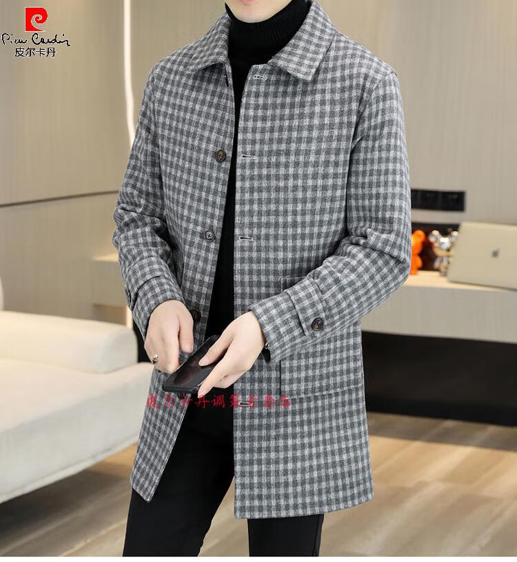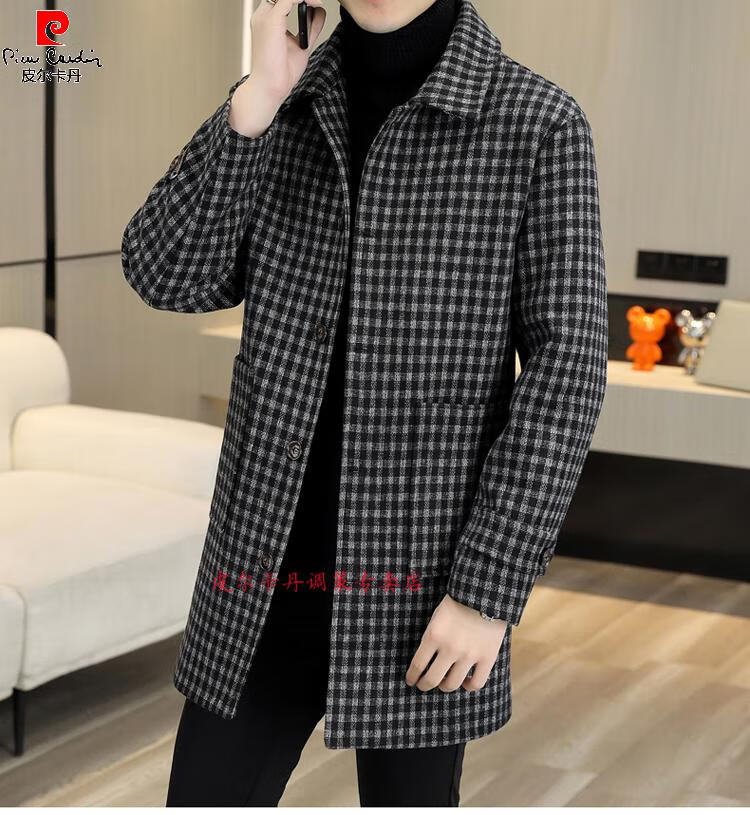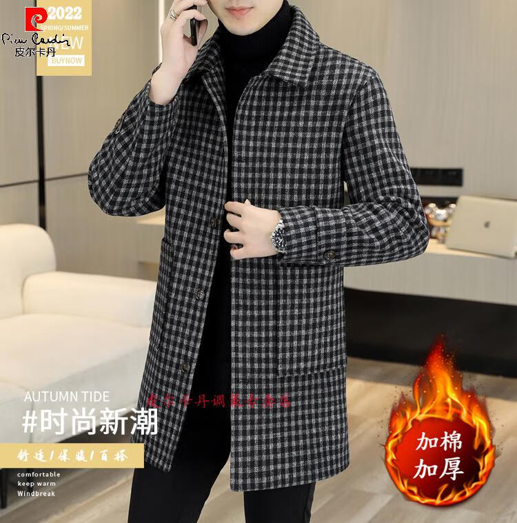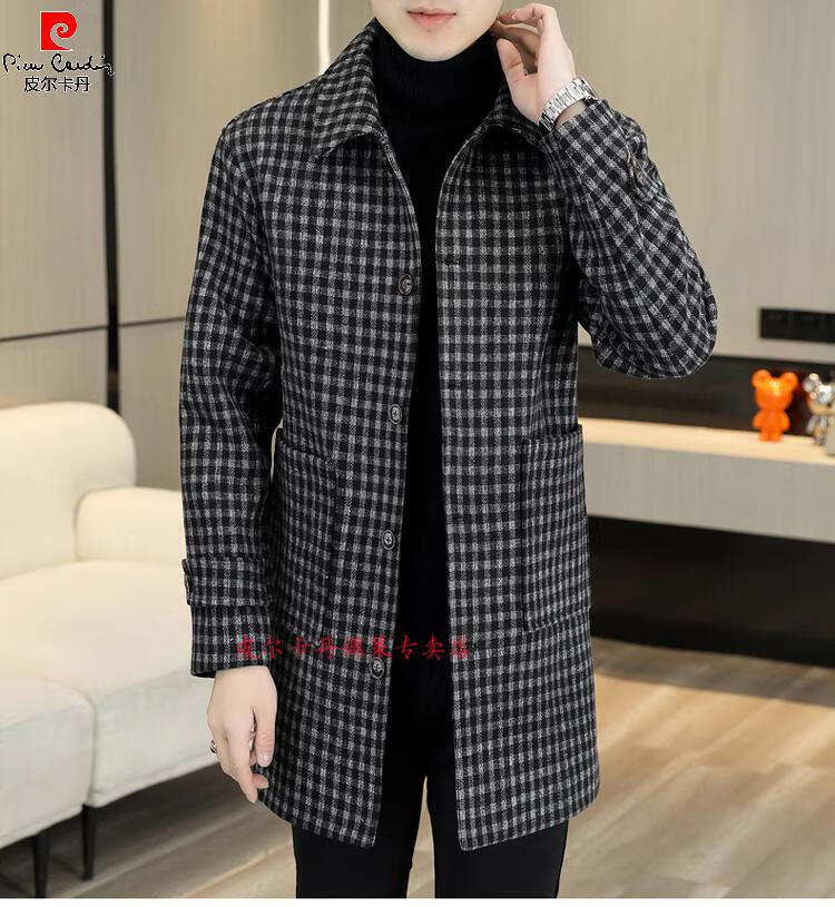 Pierre Cardin Herren Wollmantel kariert Winter High-End Nizi Windjacke Mittellanger Wollmantel im britischen Stil 1005 schwarz Baumwolle Stil XL