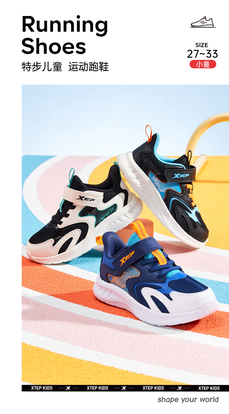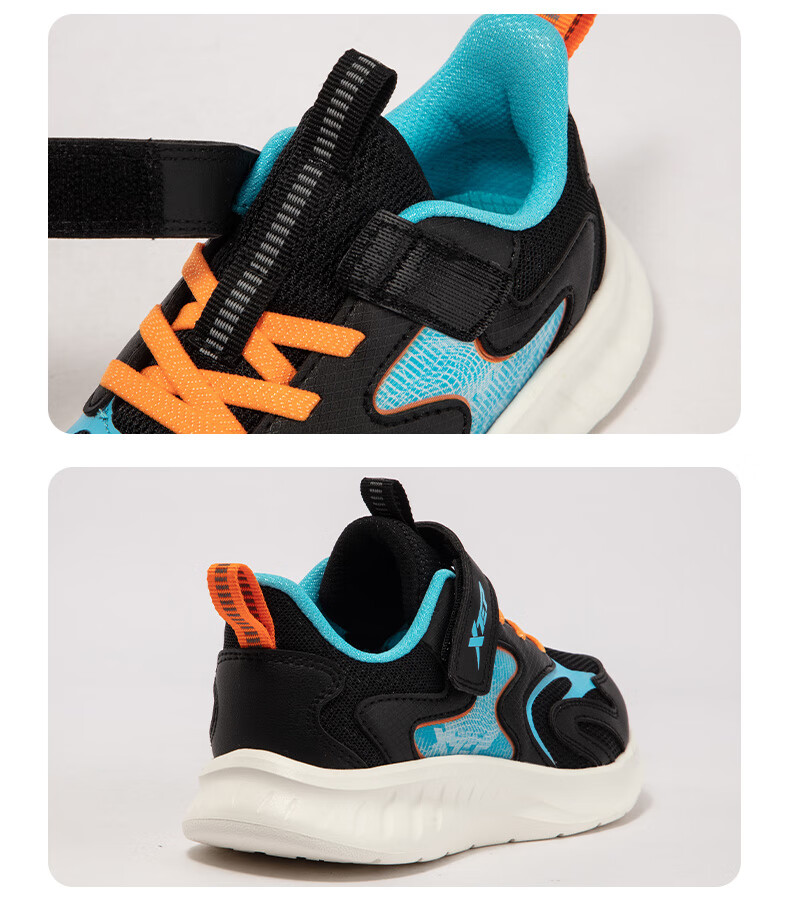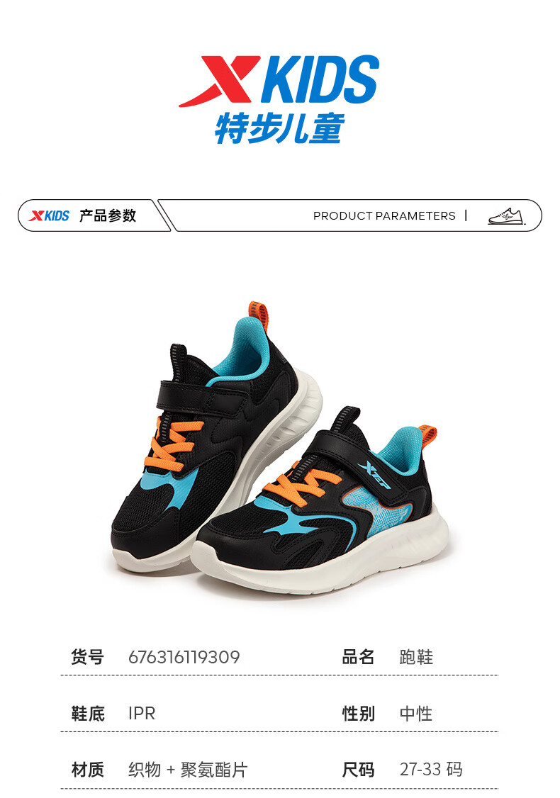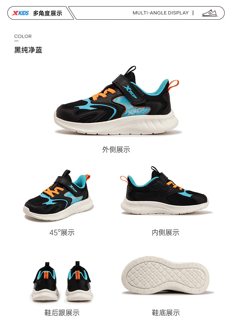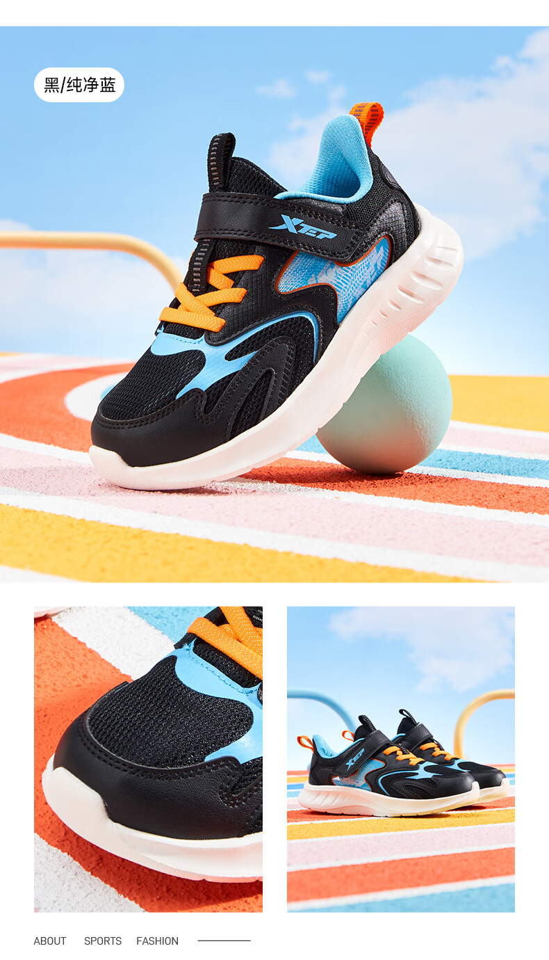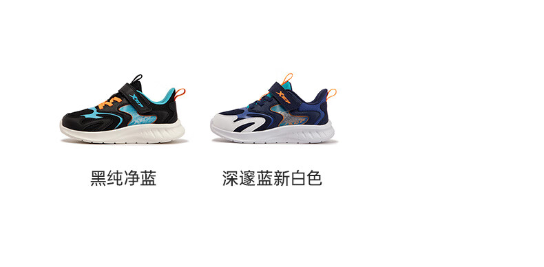 特步童鞋儿童跑鞋幼小童革面拼接柔软舒适运动跑鞋防滑魔术贴跑鞋 黑/纯净蓝 31