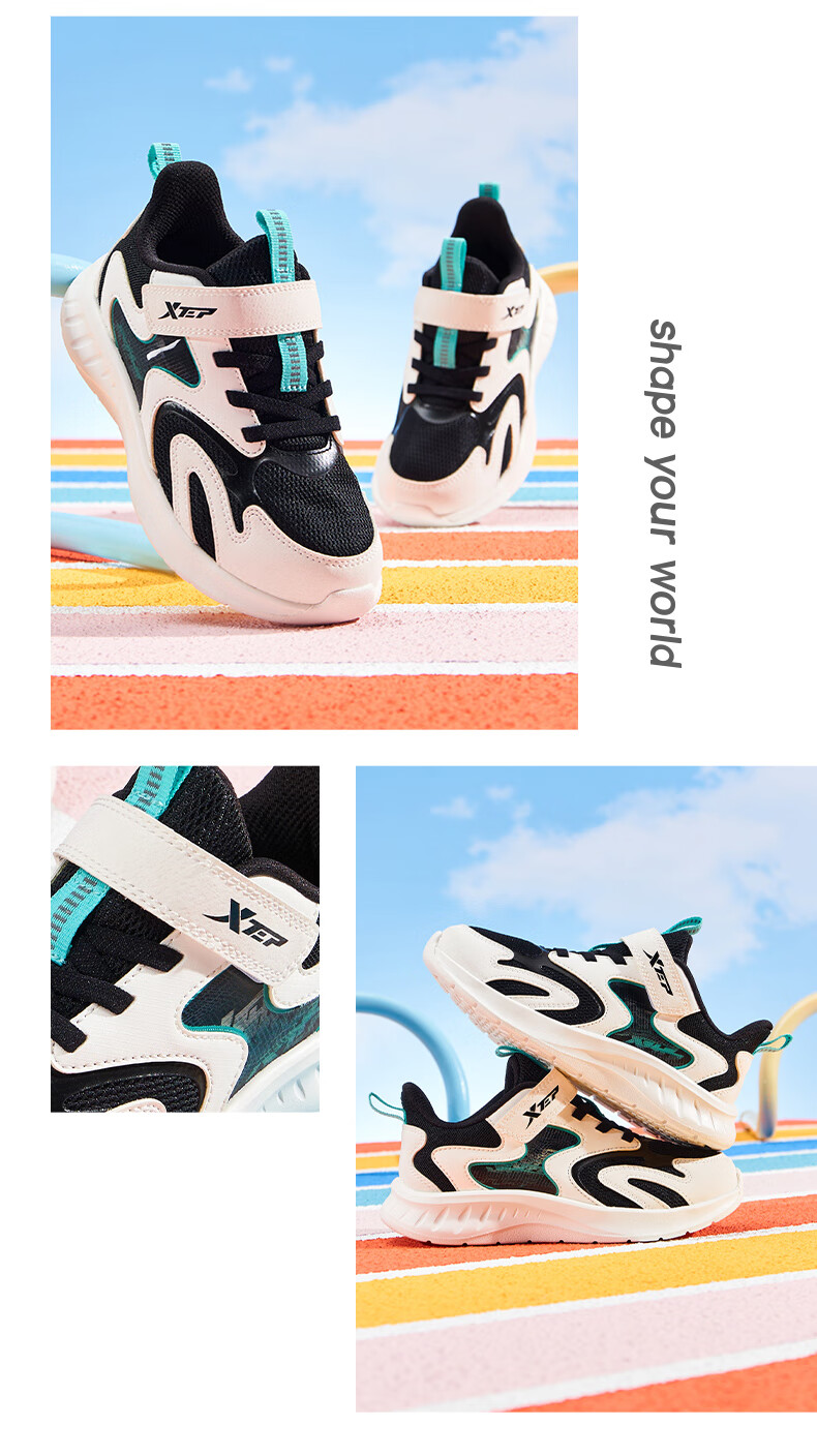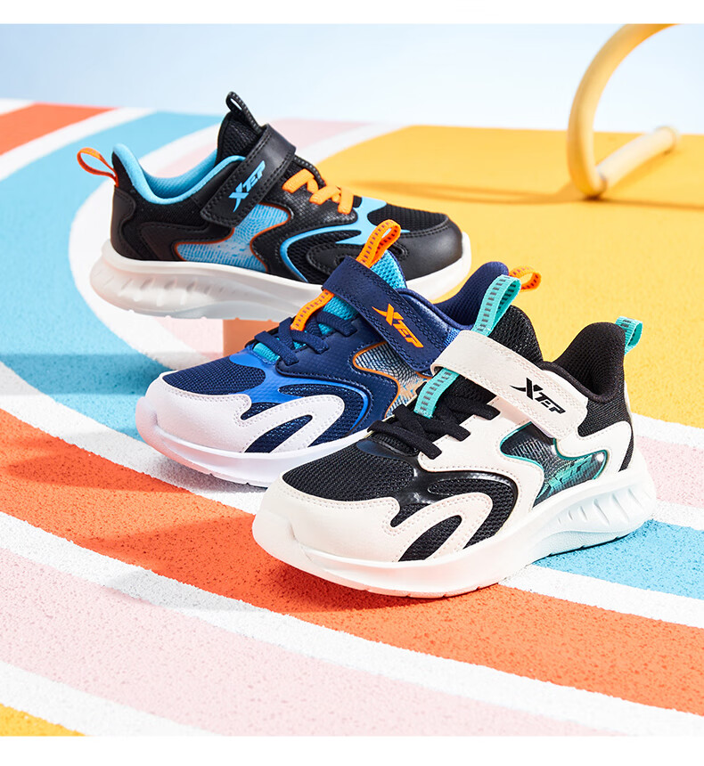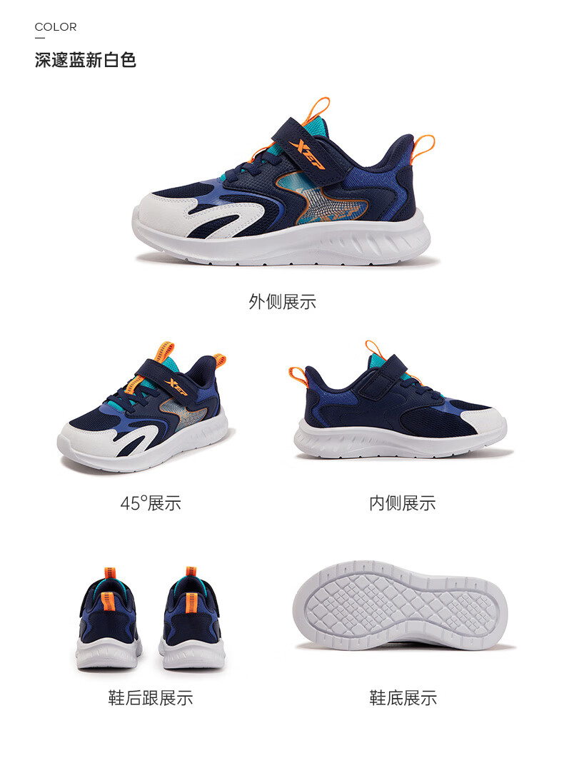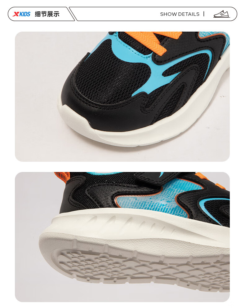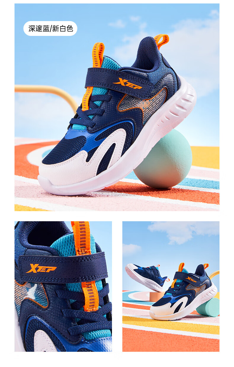 特步童鞋儿童跑鞋幼小童革面拼接柔软舒适运动跑鞋防滑魔术贴跑鞋 黑/纯净蓝 31