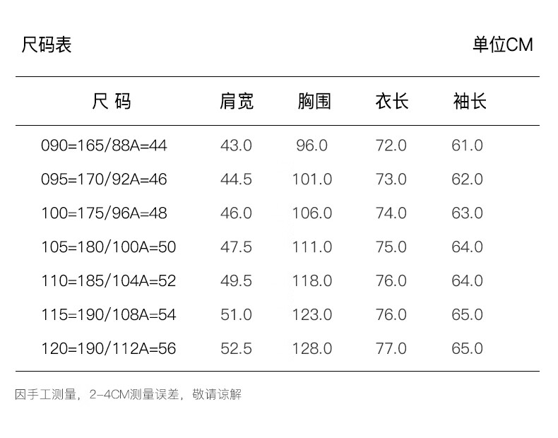 China (cm) 160-165/84-86 165-170 / 88-90 167-172 / 92-96 168-173 / 98-102 170-176 / 106-110