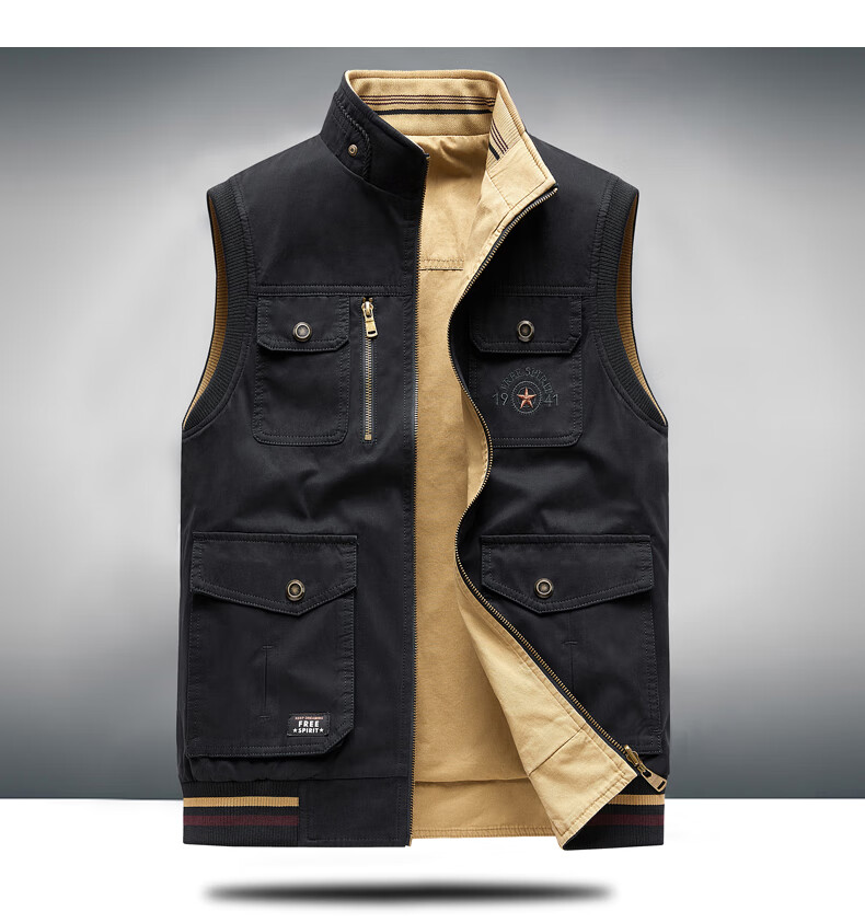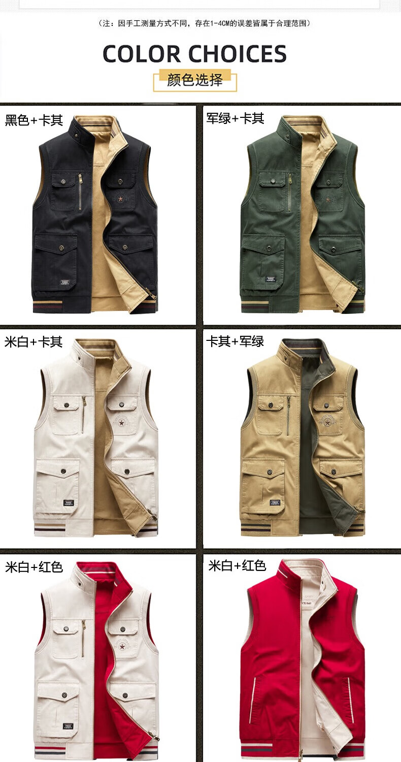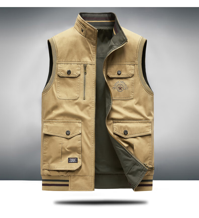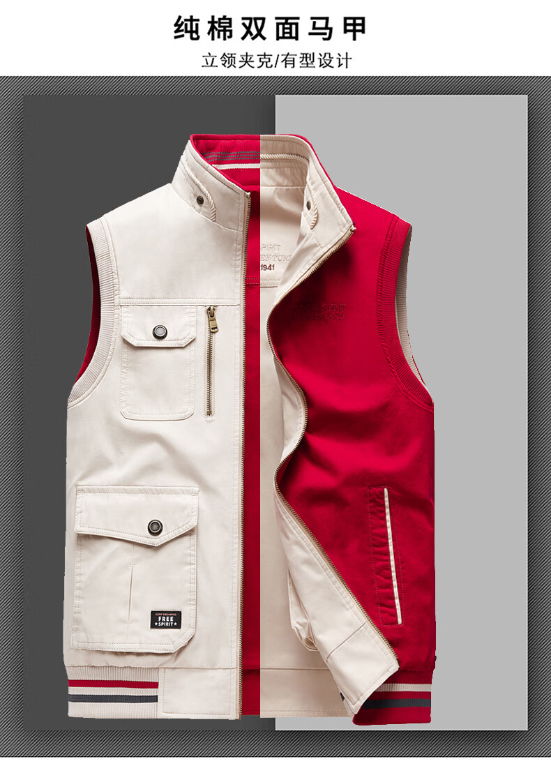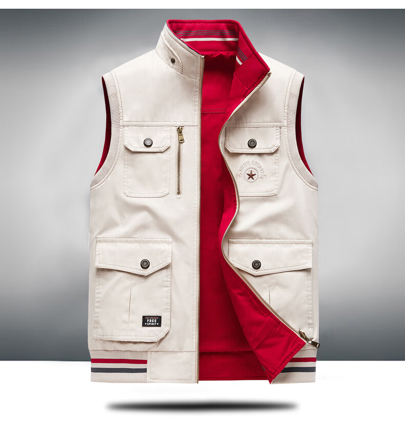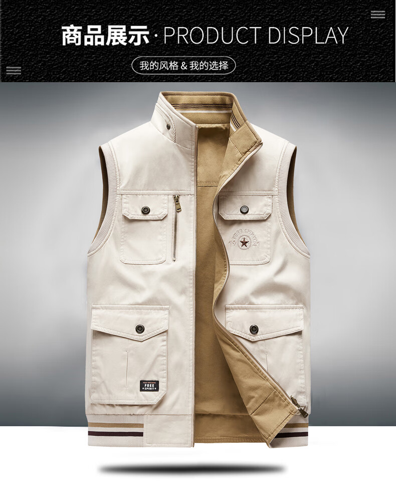 卡思威仪春秋新款双面穿马甲男工装多口袋男士宽松大码纯棉立领无袖外套男 米白色/反面卡其色 XL 【建议140斤体重左右】