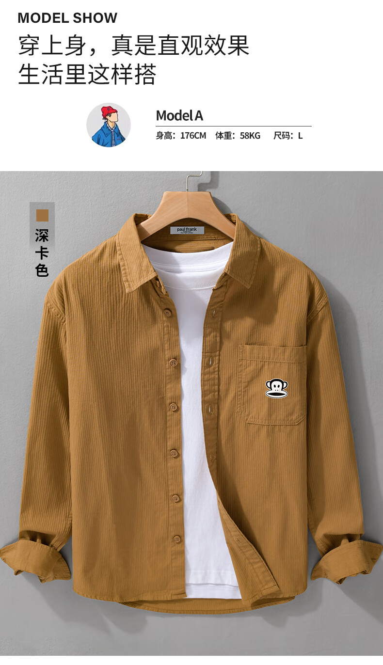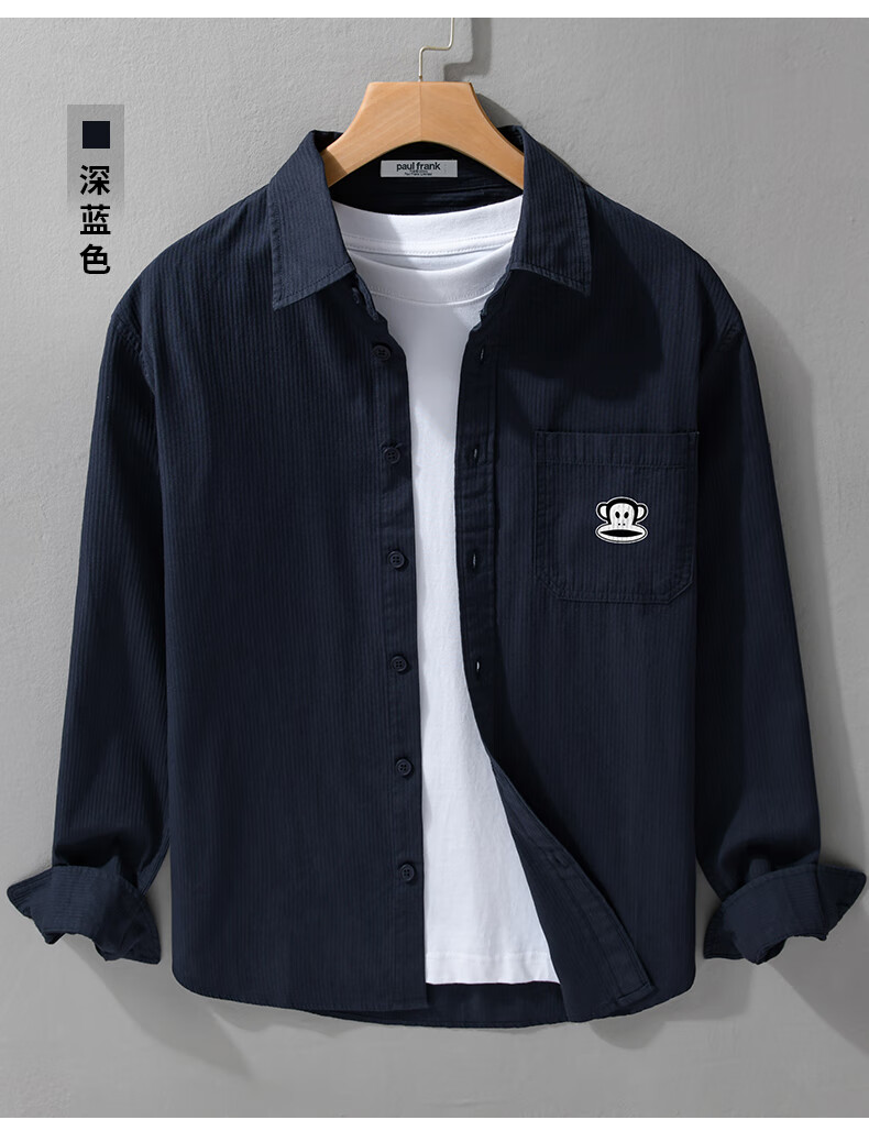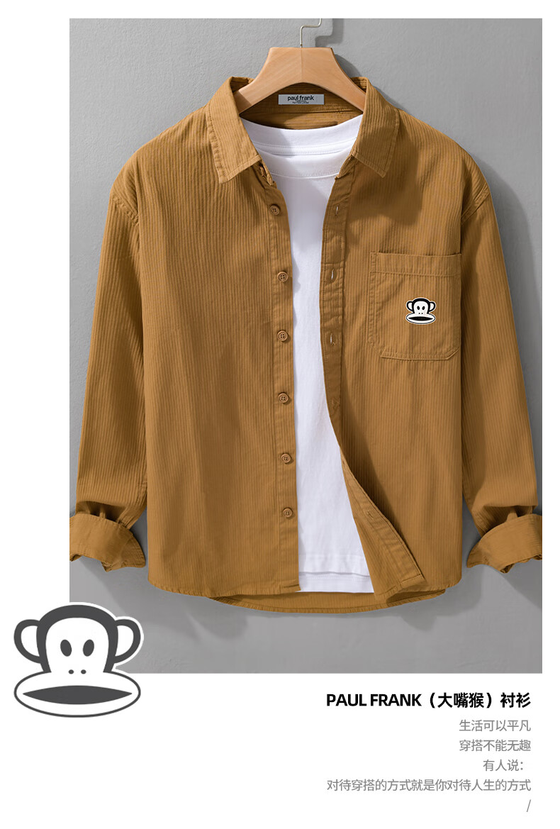 大嘴猴(paul frank)纯棉休闲长袖衬衫男士春秋宽松潮牌外套上衣男装百搭新款翻领衬衣 9569C深卡色【官方正品】 L 【建议120-135斤】
