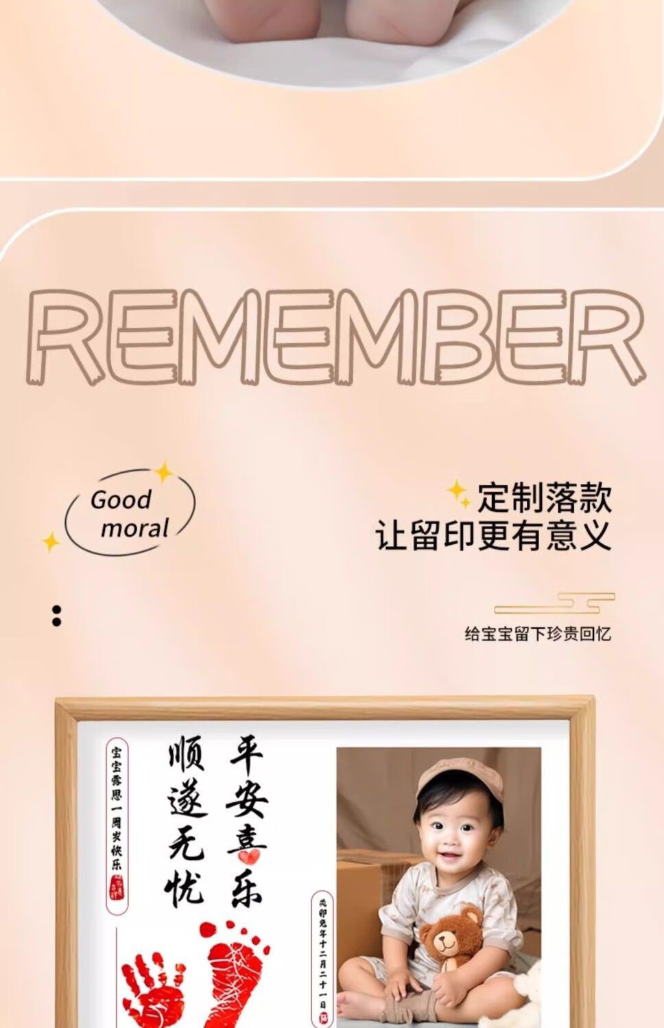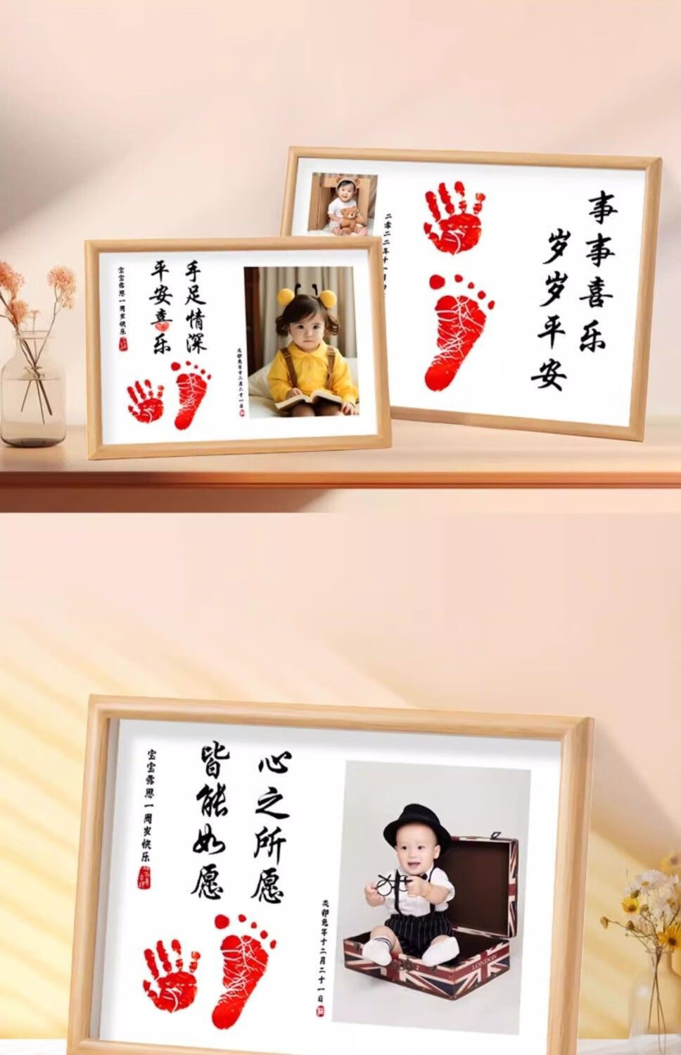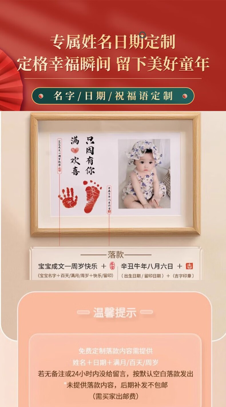 宝宝满月周岁一岁一礼百天脚印相框手足印留纪念品字画仪式感道具 a4顺遂无忧平安喜乐