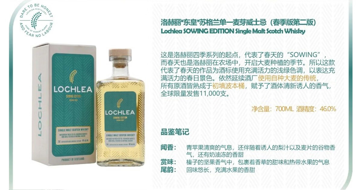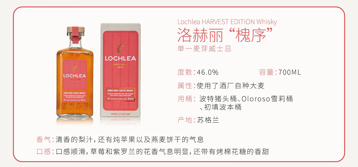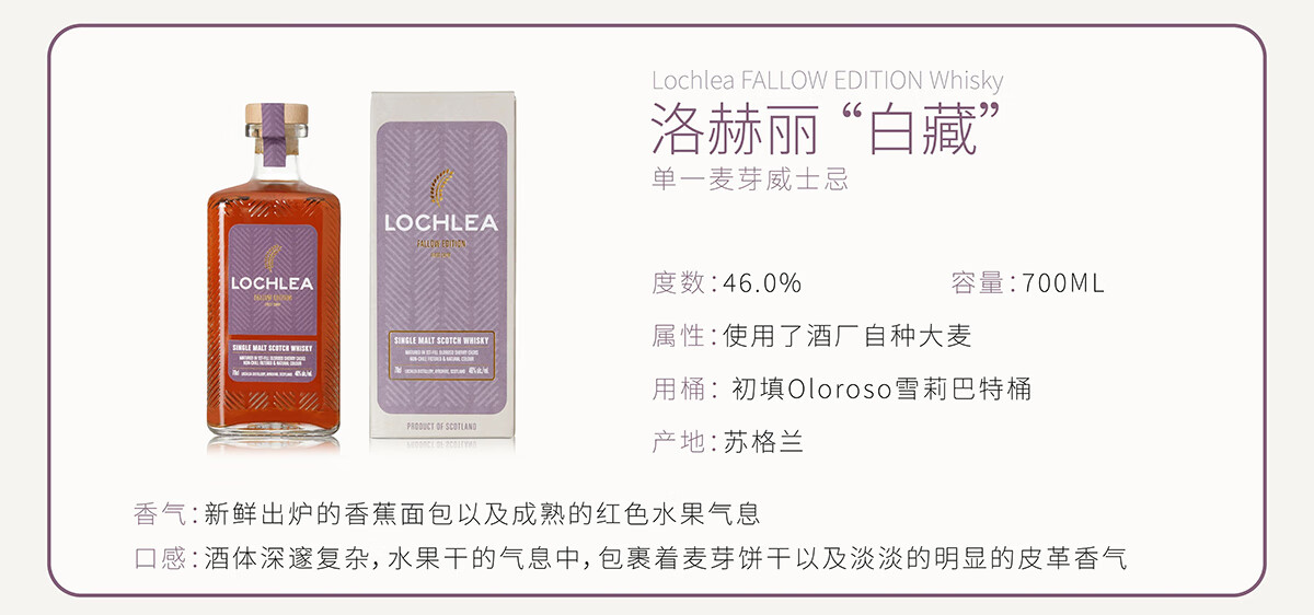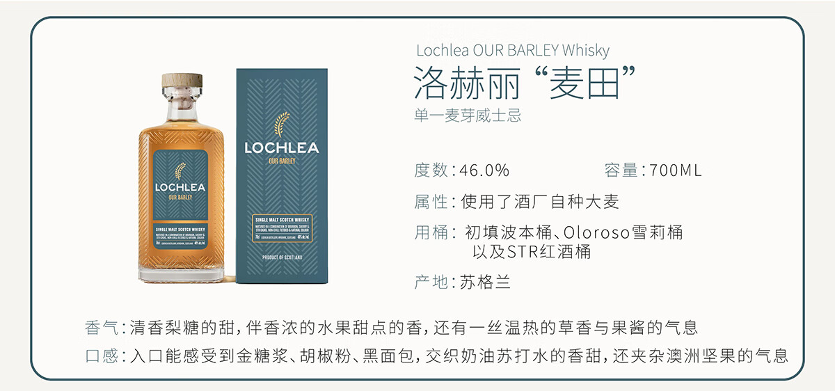 洛赫丽单一麦芽威士忌 使用酒厂自种大麦 洋酒英国进口 LOCHLEA行货 洛赫丽白藏