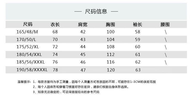 China (cm) 165 / 88-90 170 / 96-98 175 / 108-110 180 / 118-122 185 / 126-130