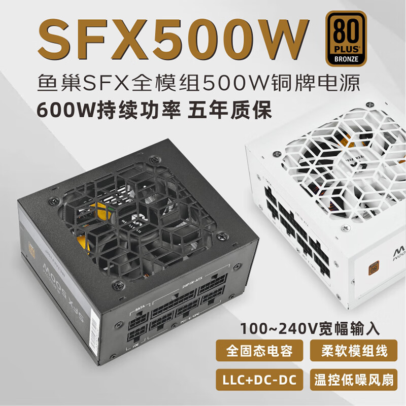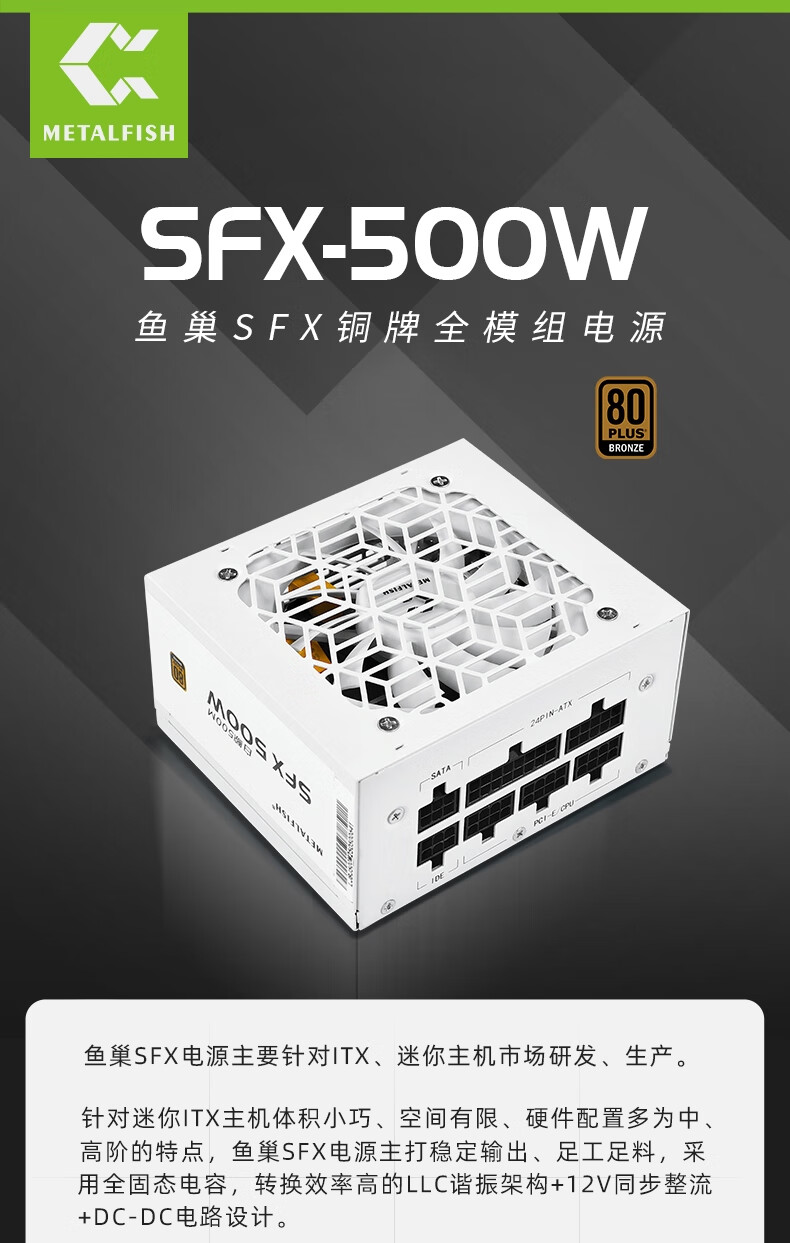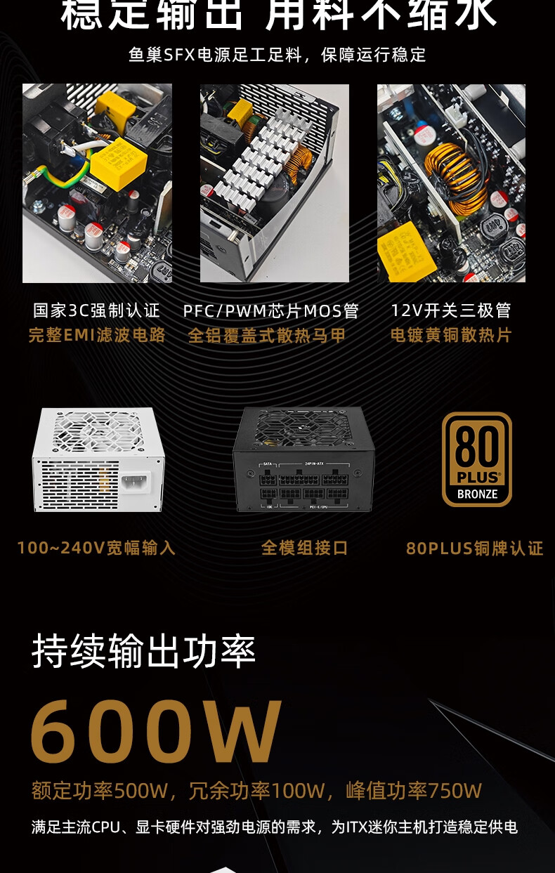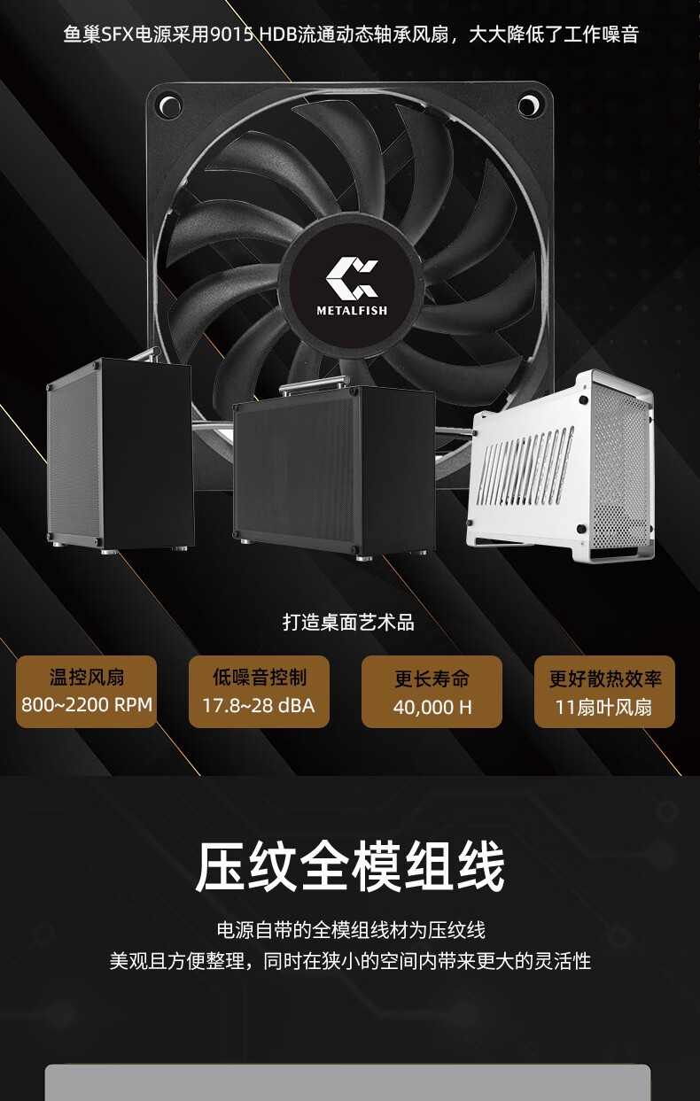 鱼巢(metalfish)SFX电源额定500W全模组白色持续600W峰值750W铜牌ITX迷你小机箱电源 SFX600W全模组黑【铜牌认证 质保5年】