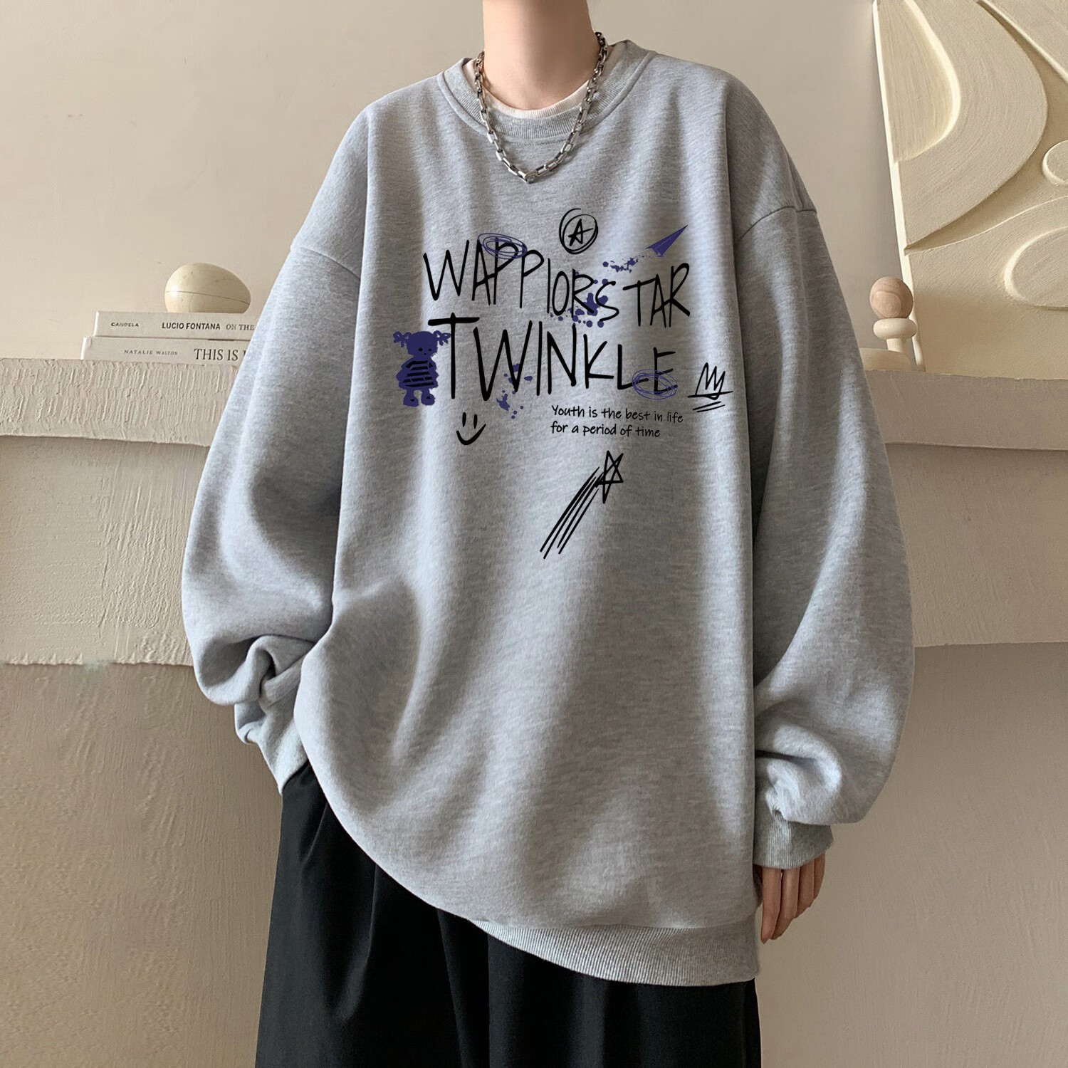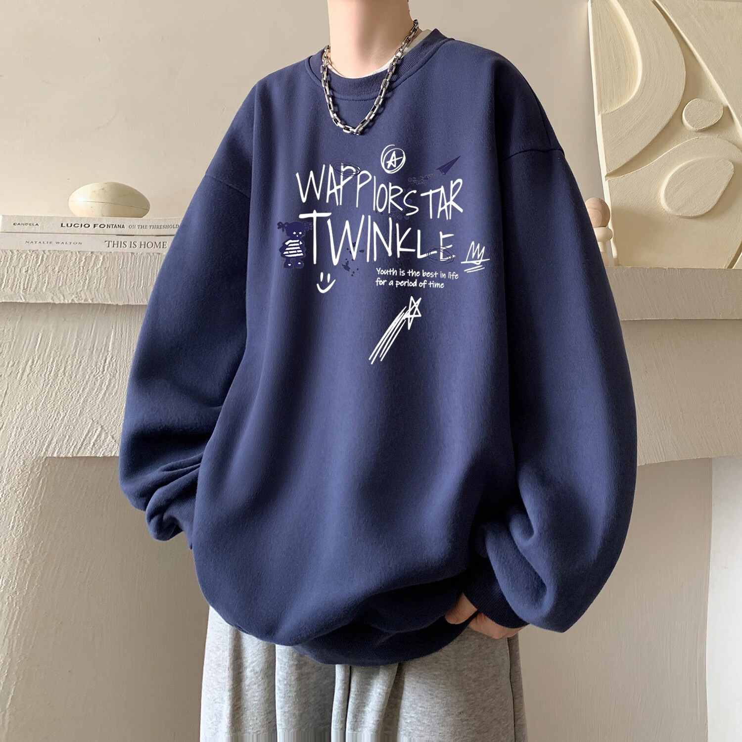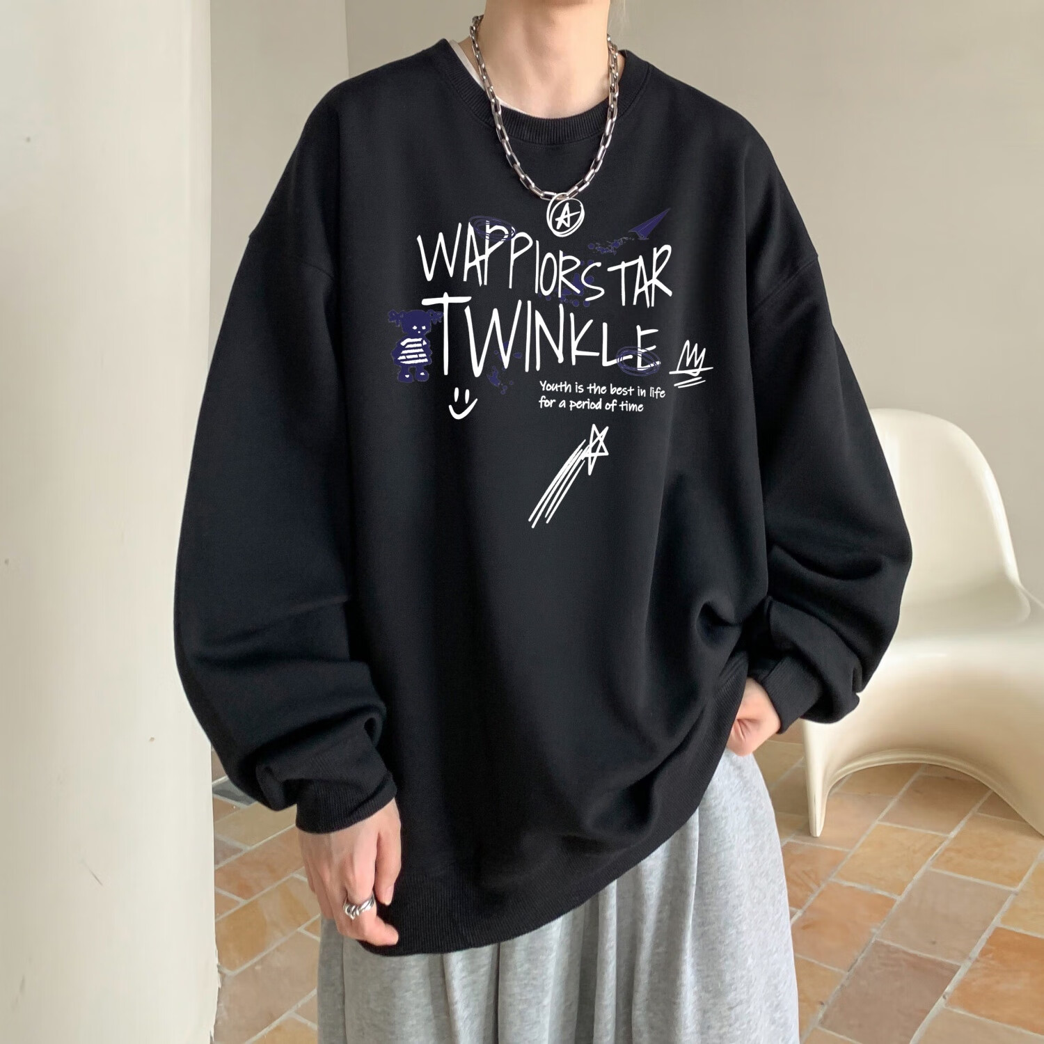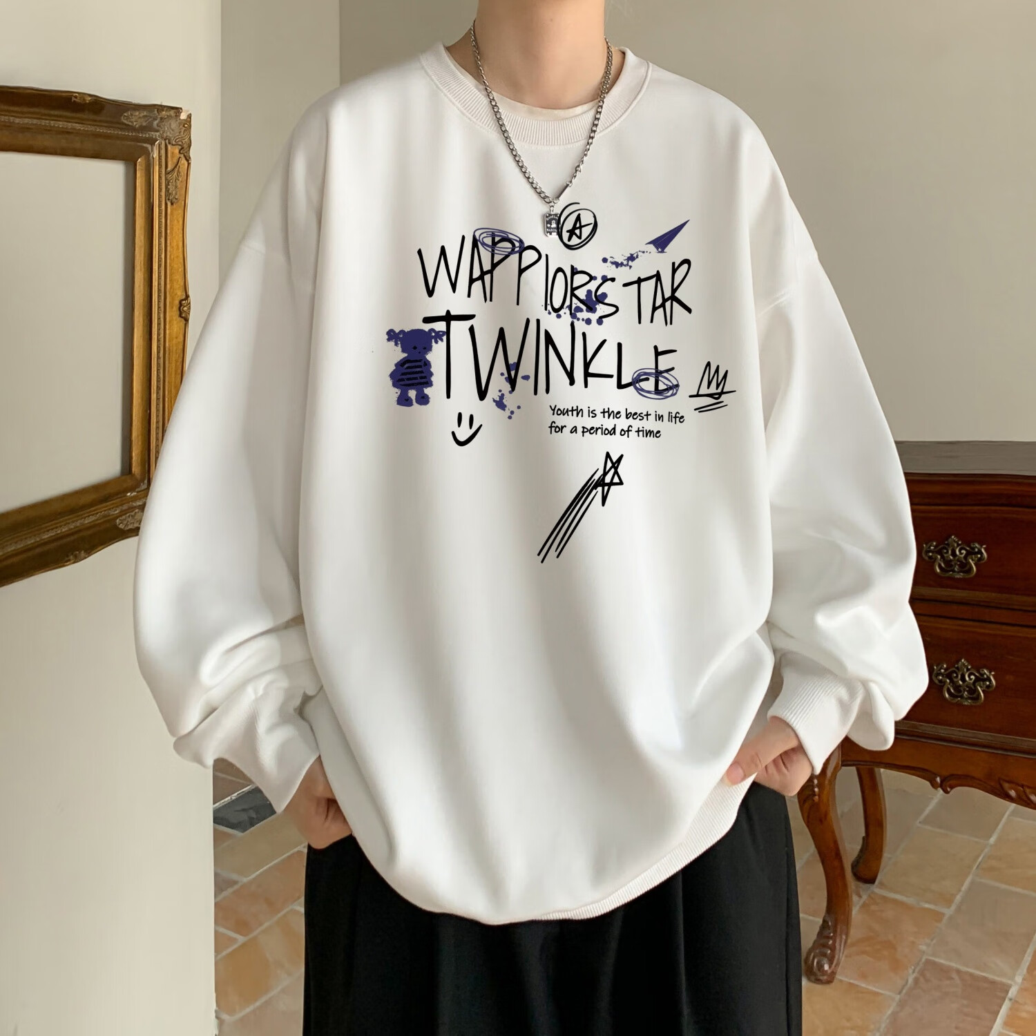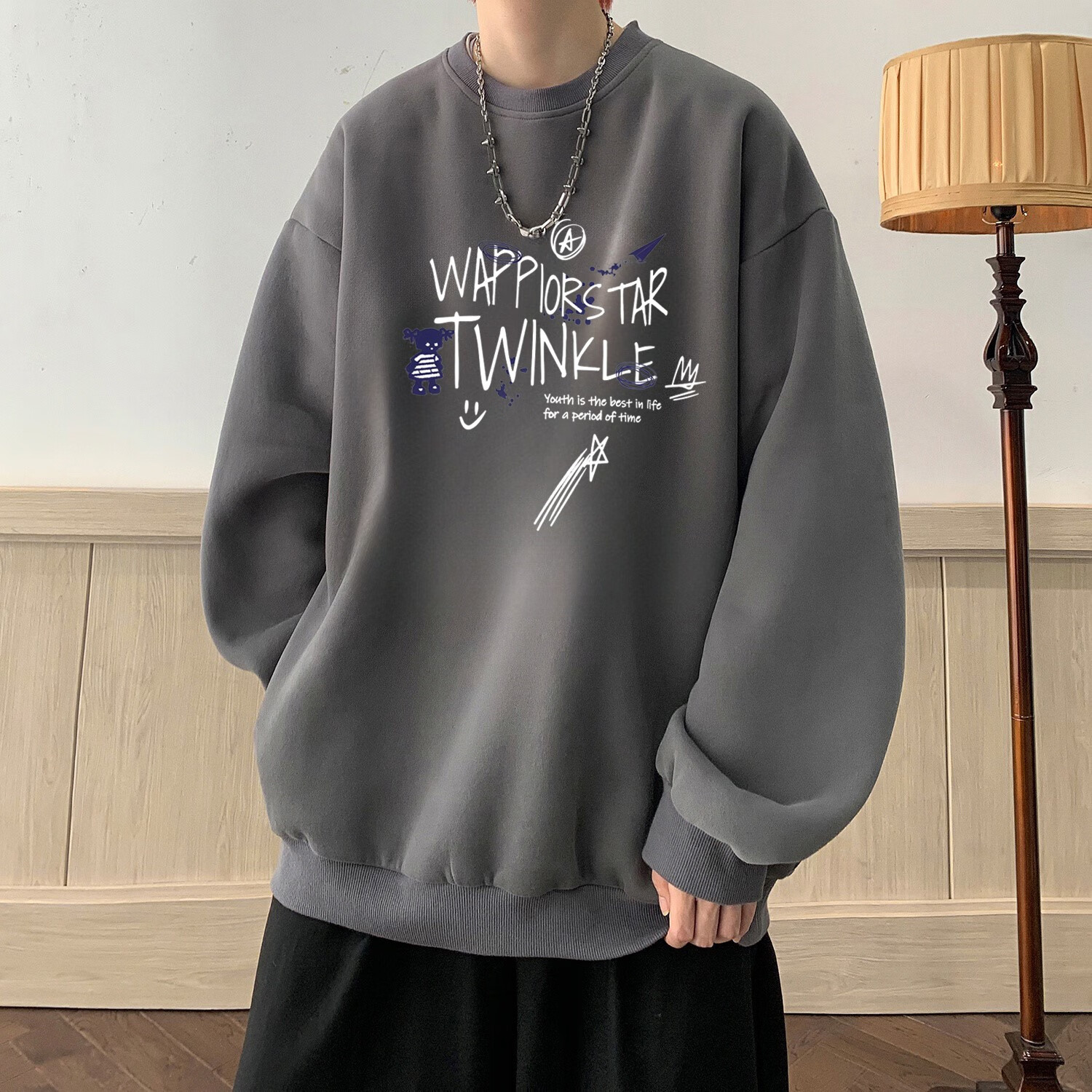 型于格潮牌美式高街无帽圆领卫衣男上衣秋冬季加绒长袖T恤内搭打底衫 酒红色 (常规款) XL 建议(125-145斤)