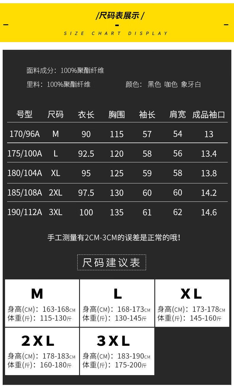 China (cm) 165 / 88-90 170 / 96-98 175 / 108-110 180 / 118-122 185 / 126-130