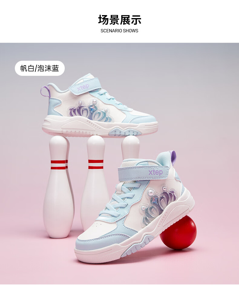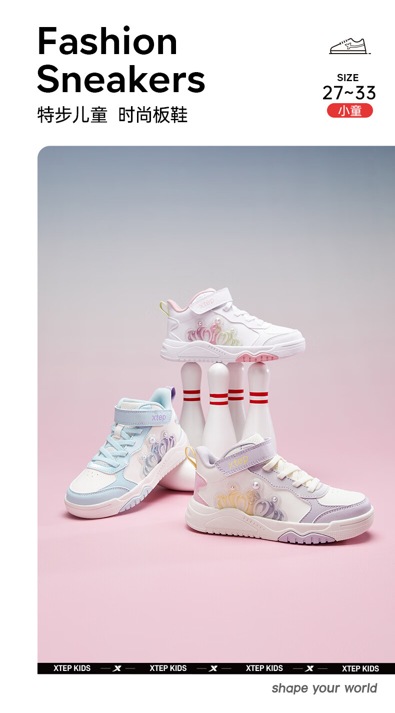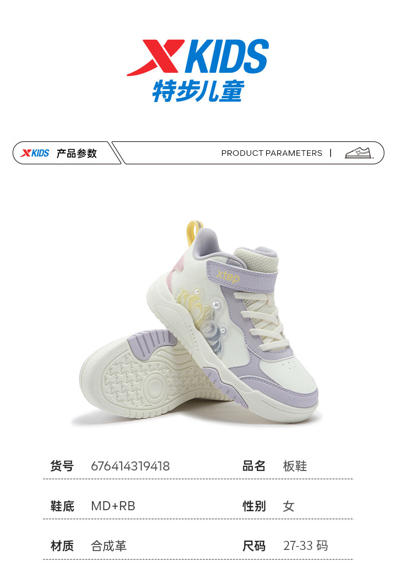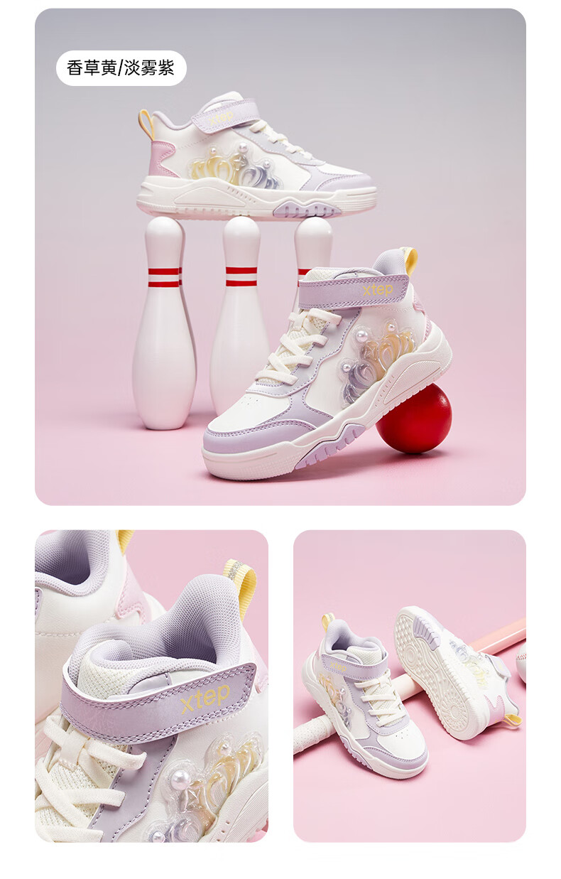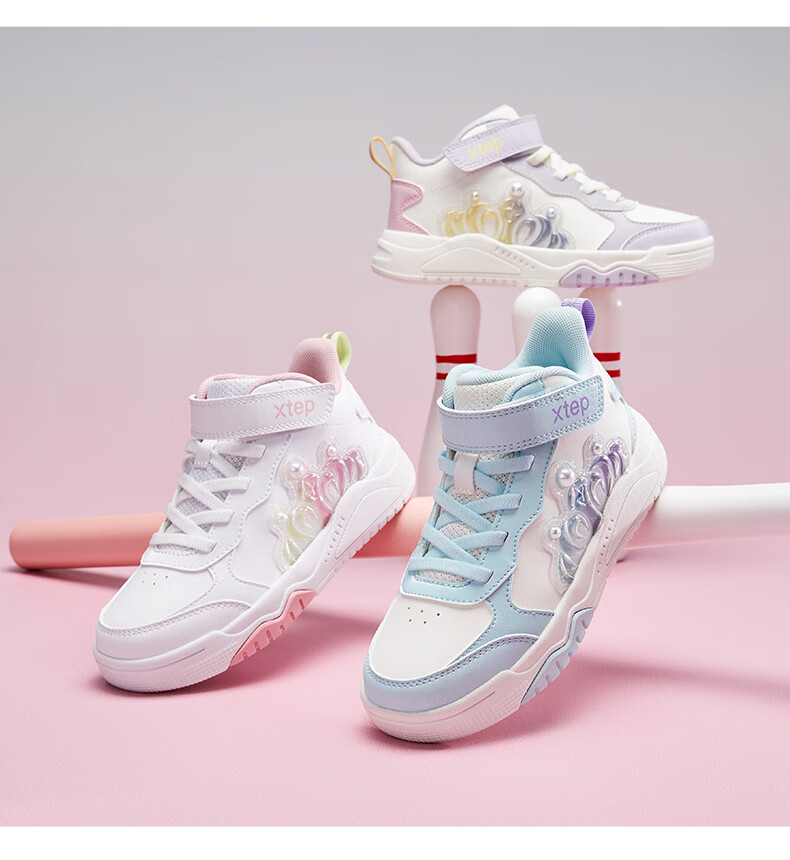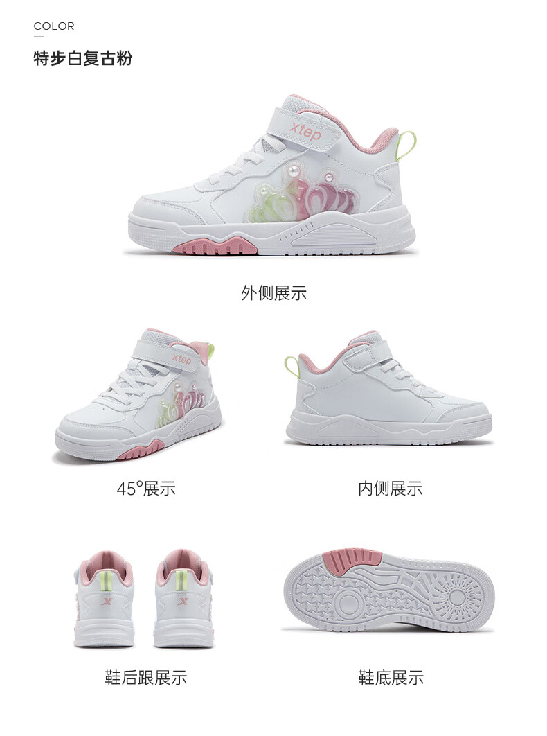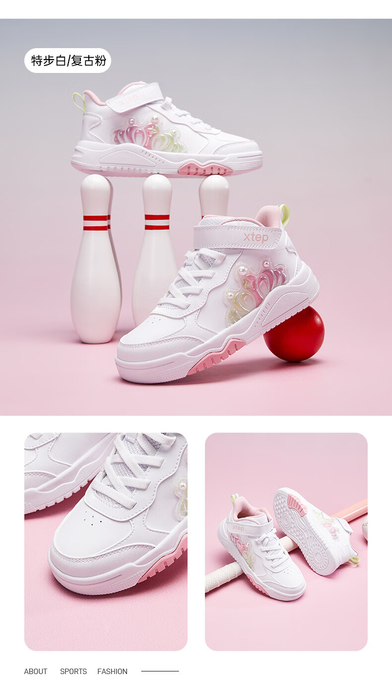 特步童鞋儿童板鞋女童小童革面皇冠装饰防滑耐磨缓震高帮魔术贴板鞋 特步白/复古粉 31